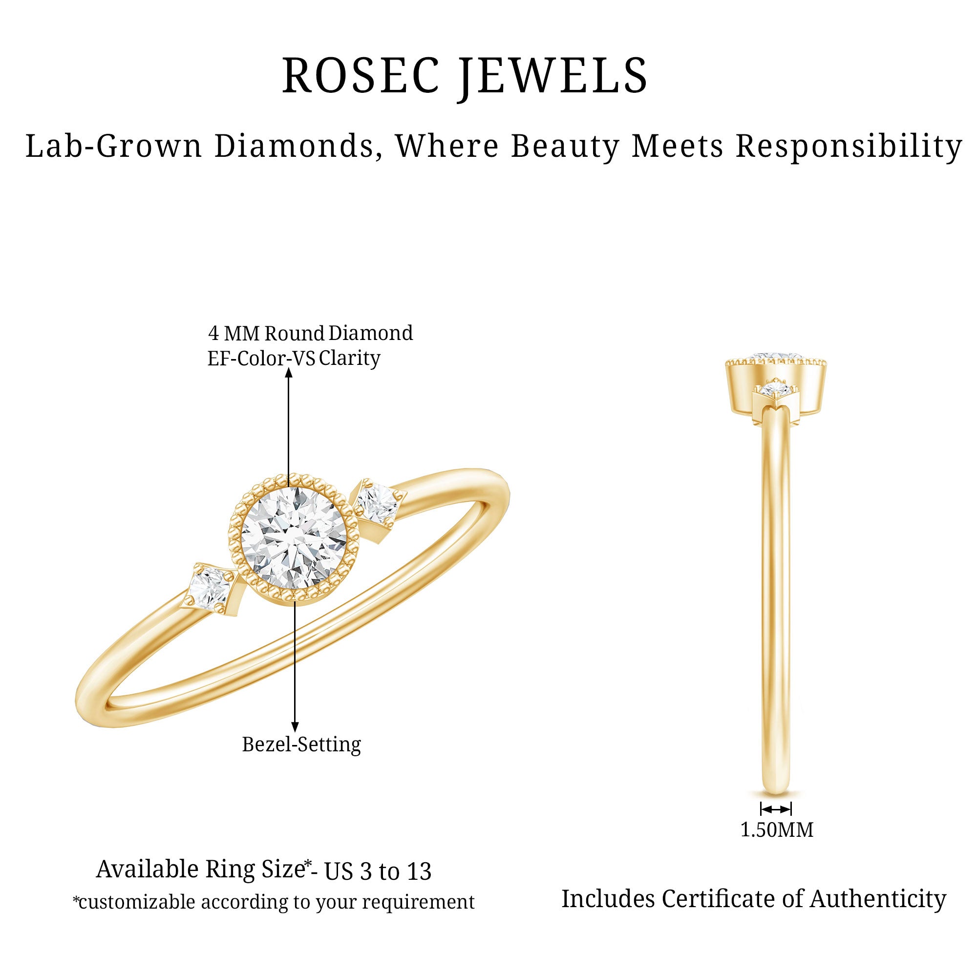 Lab grown diamonds share the same visual and structural characteristics as natural diamonds, offering durability suitable for everyday wear. Their brilliance and clarity make them a reliable choice for a solitaire design.