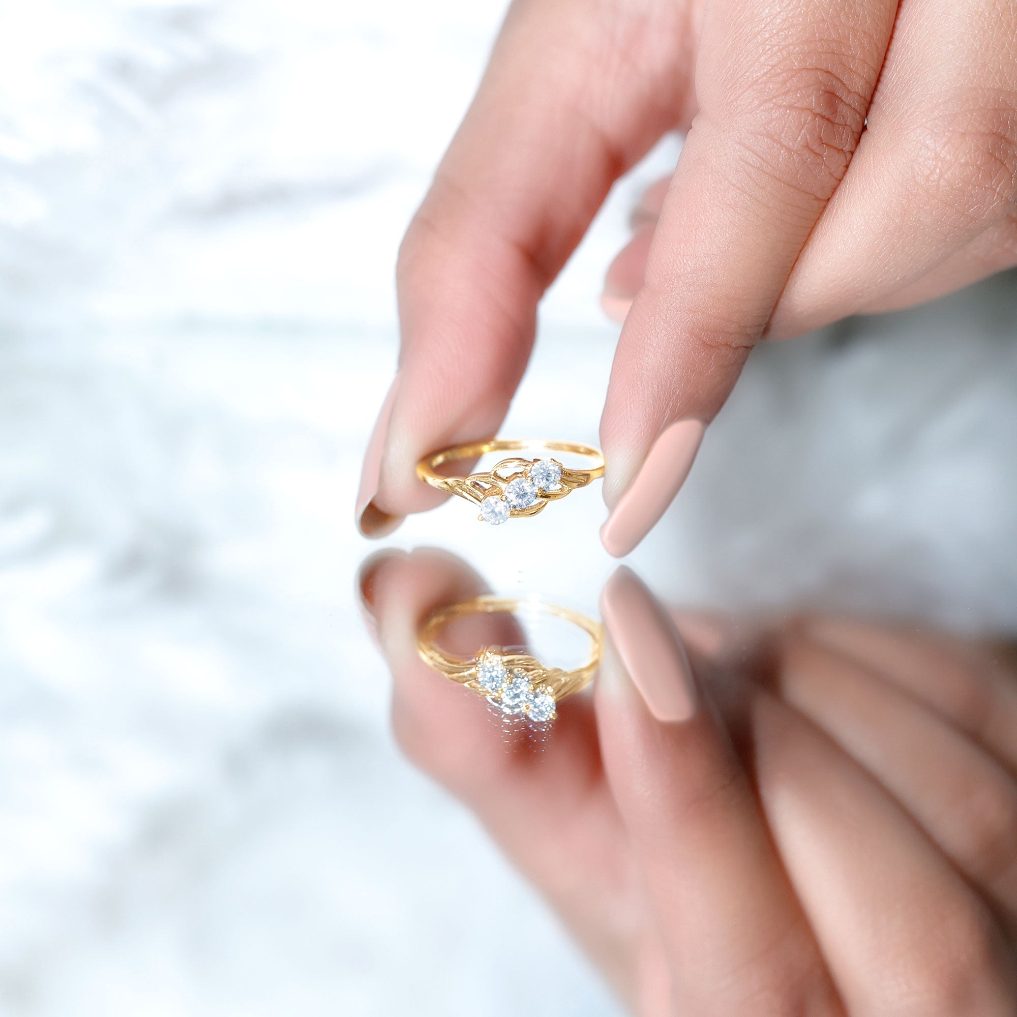 Celebrate every moment of your love story with this timeless Lab Grown Diamond Engagement Ring, carefully crafted to represent your past, present, and future together. This Three Stone Engagement Ring is not just a piece of jewelry, it is a testament to your unconditional love. It showcases three equally beautiful round cut lab grown diamonds set in prong setting that enhances their sparkle. What makes this Diamond 3 Stone Ring unique is the contemporary wave-inspired design of the band. Whether you are embarking on a new journey together or seeking a way to show your commitment, this Simple Diamond Ring will always remind you of the love you share. Ideal for modern romantics who value sustainability, each diamond is lab grown, providing ethical beauty without compromise. It arrives beautifully packaged in a premium jewelry box, ready to be gifted and treasured for a lifetime. Crafted with precision and style, the Past Present and Future Ring is available in a variety of metal types and colors, providing a luxurious and sustainable symbol of your bond.