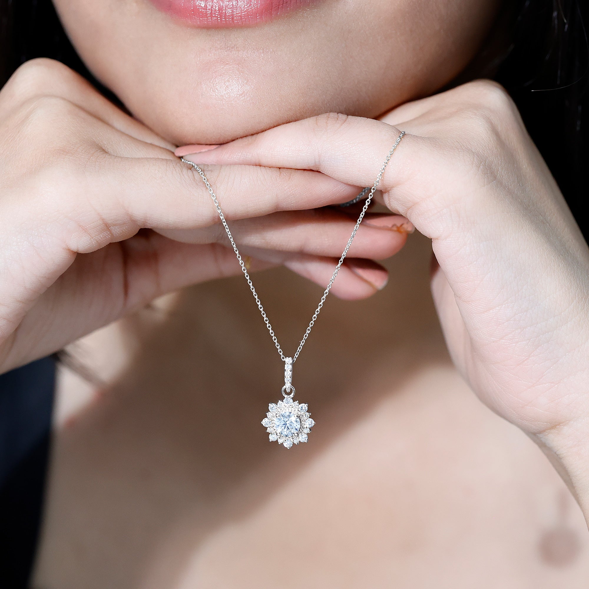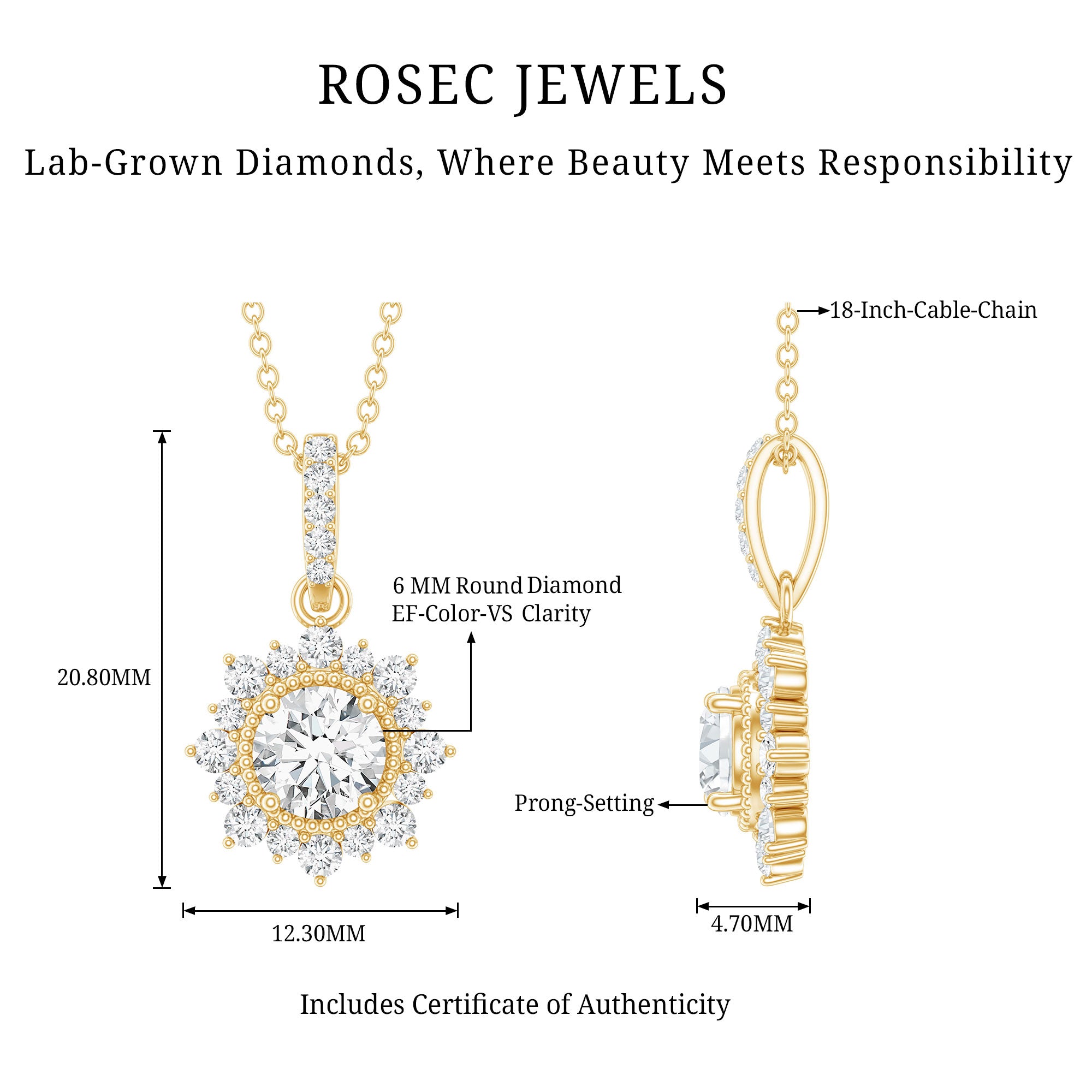 This beautiful Diamond Pendant Necklace will turn heads towards her with its astonishing shine. This Halo Pendant from Rosec Jewels is handcrafted with a 6 MM round shape lab grown diamond as the center stone which is secured in Prong Setting and accentuated with petite diamond halo. This Round Pendant is beautified with the beaded detailing and Diamond Accent Bail. Make the celebration of love special with the EF-VS Quality Diamond embedded in the pendant and start your new journey with this Bridal Necklace for Wedding, which serves as a reminder of an unforgettable experience filled with emotions. As a symbol of love and unity, this pendant necklace carries a lasting message that is deeply sentimental. If you are searching for a gift for a special occasion, want to express your affection, or need a reminder of cherished moments, a Circle Pendant is a stunning and unique choice. We ensure that your feelings are attached to this Lab Grown Diamond Necklace, hence we deliver it in a premium quality gift box.