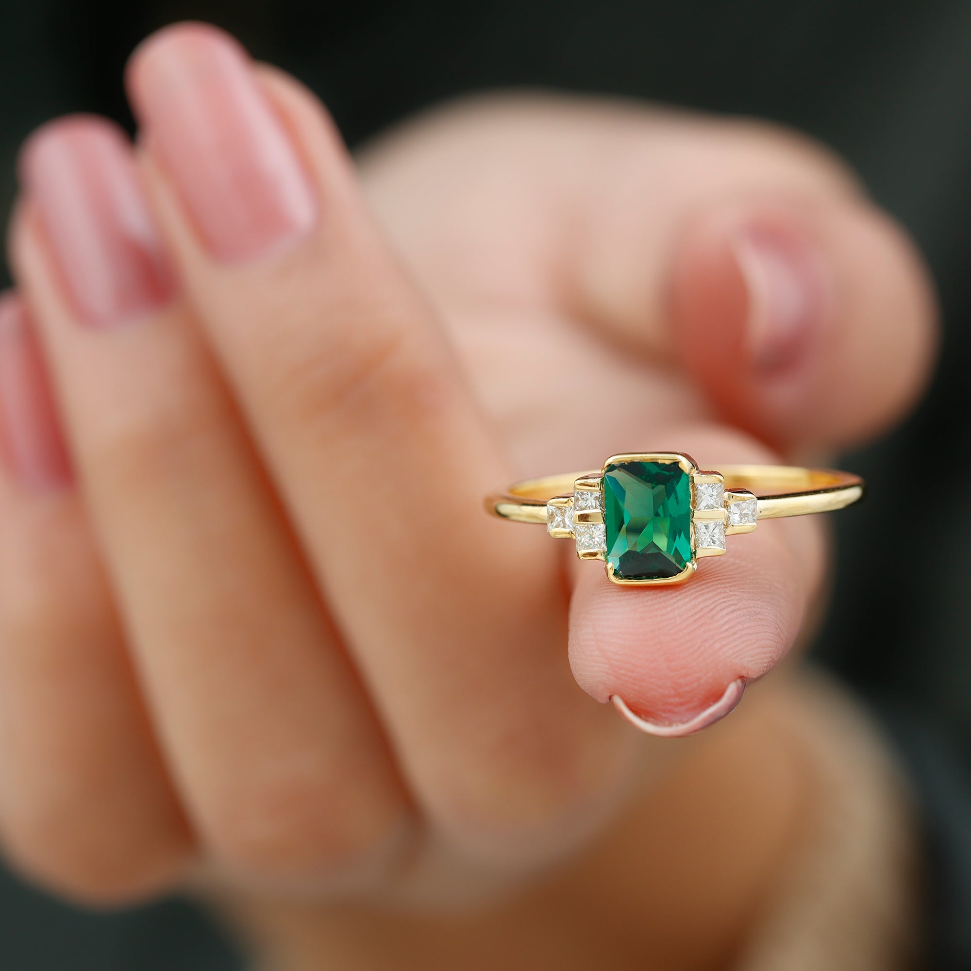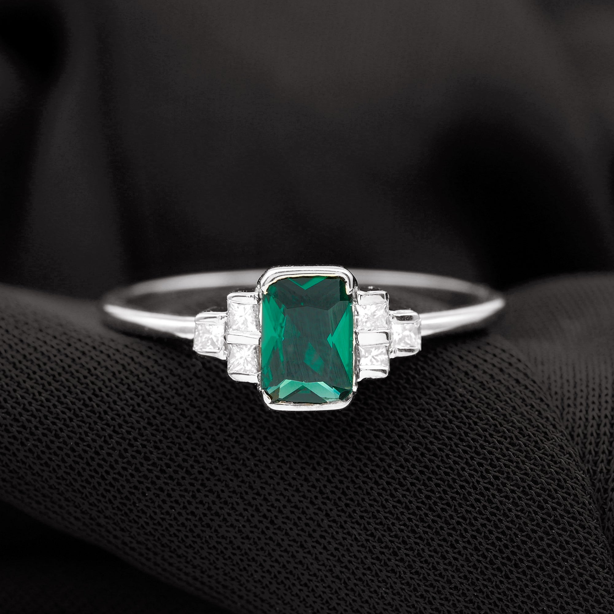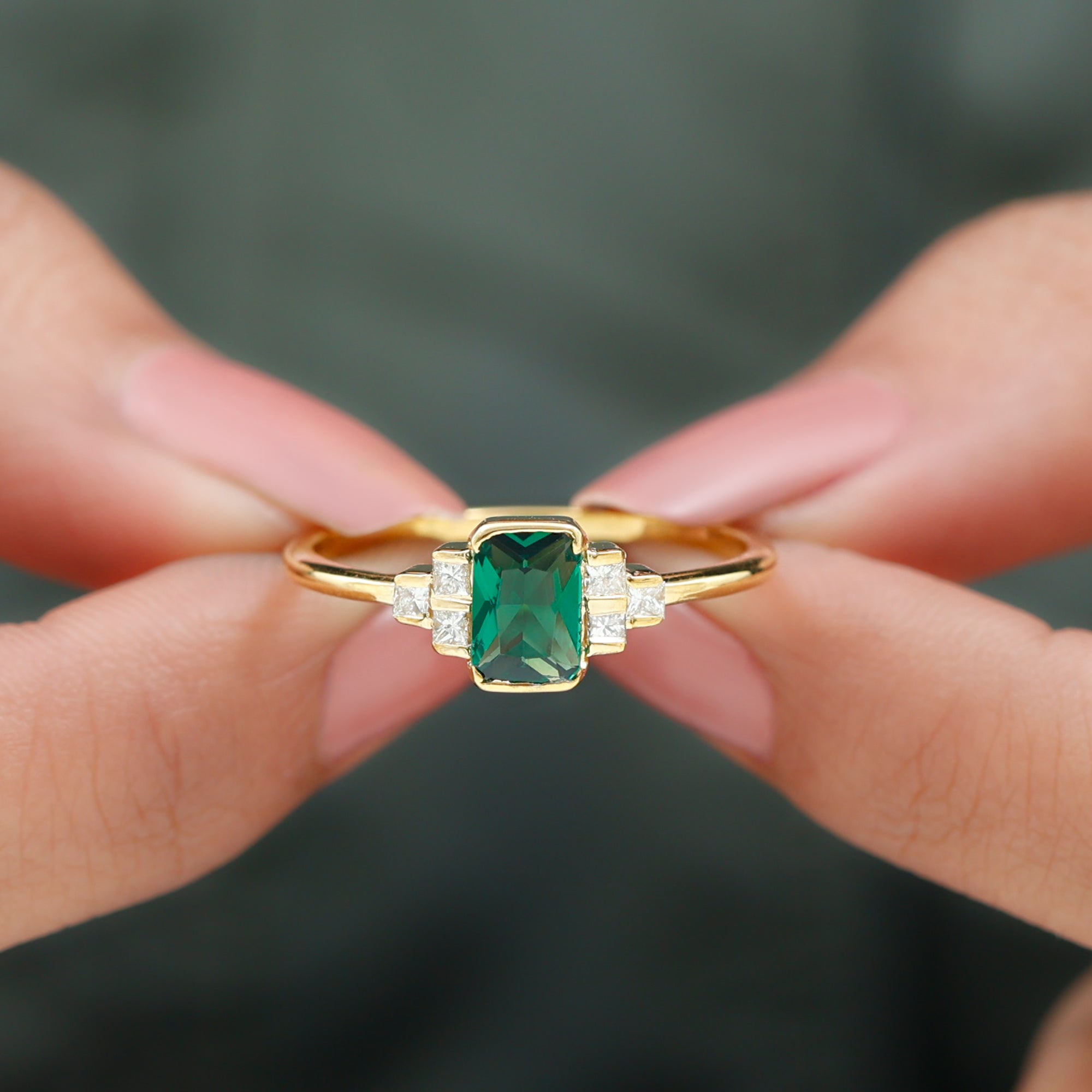 Make your special day unforgettable with a ring that blends timeless beauty and bold elegance. This Lab Grown Emerald Engagement Ring is designed to capture her heart at first glance. Thoughtfully designed, this Solitaire Engagement Ring features a 6X8 mm Emerald Cut Lab Created Emerald of Aaaa Quality as a center stone, admired for its deep green hue that symbolizes renewal, harmony, and everlasting love. On either side, sparkling Princess Cut Diamond gemstones are set in a trio arrangement, adding balance, brilliance, and a touch of Art Deco sophistication to the design. The combination of geometric cuts and contrasting shapes gives the Emerald Cut Engagement Ring a unique character, making it both modern and vintage-inspired. The Emerald Cut is known for its elegance, reflecting light for a look that is captivating. Together, the gemstones create a harmonious story of love, commitment, and strength. This Emerald Diamond Engagement Ring is a meaningful symbol of your promise and devotion. She will surely love this Emerald Cut Emerald Ring, and it will become her favorite piece, cherished for a lifetime. Perfectly crafted to celebrate the beginning of forever, this Lab Created Emerald Ring will make your special day truly memorable.