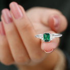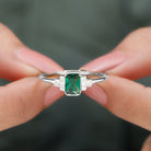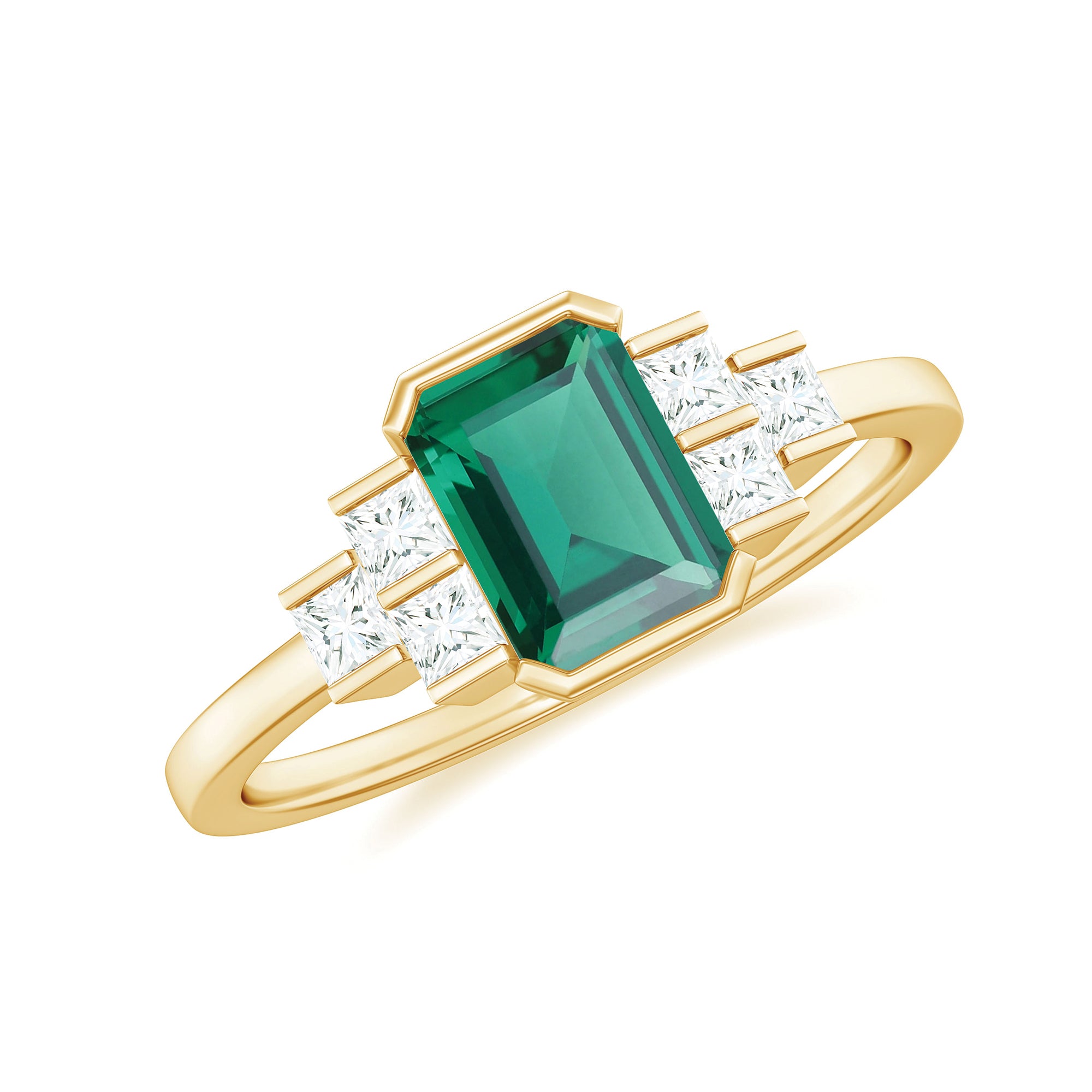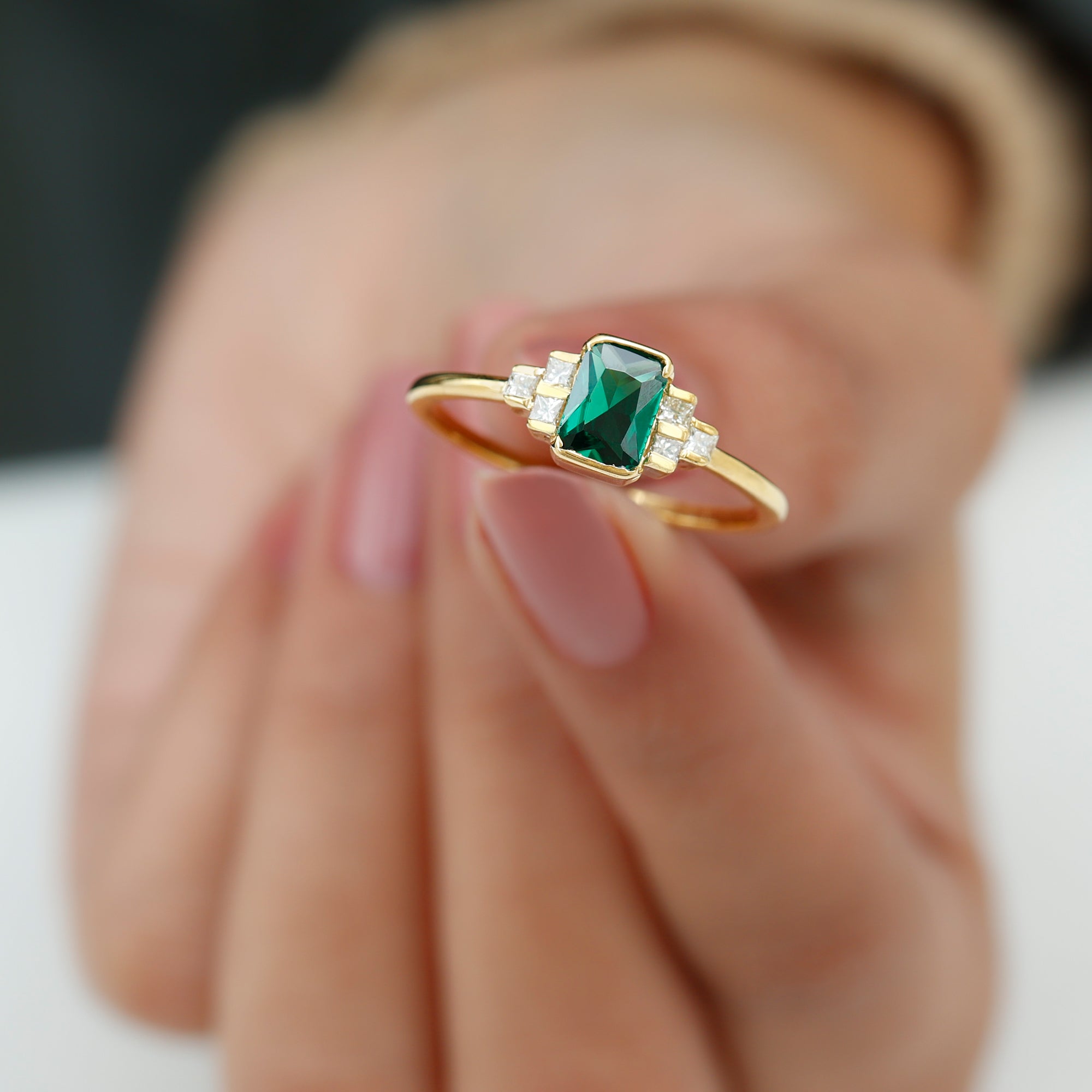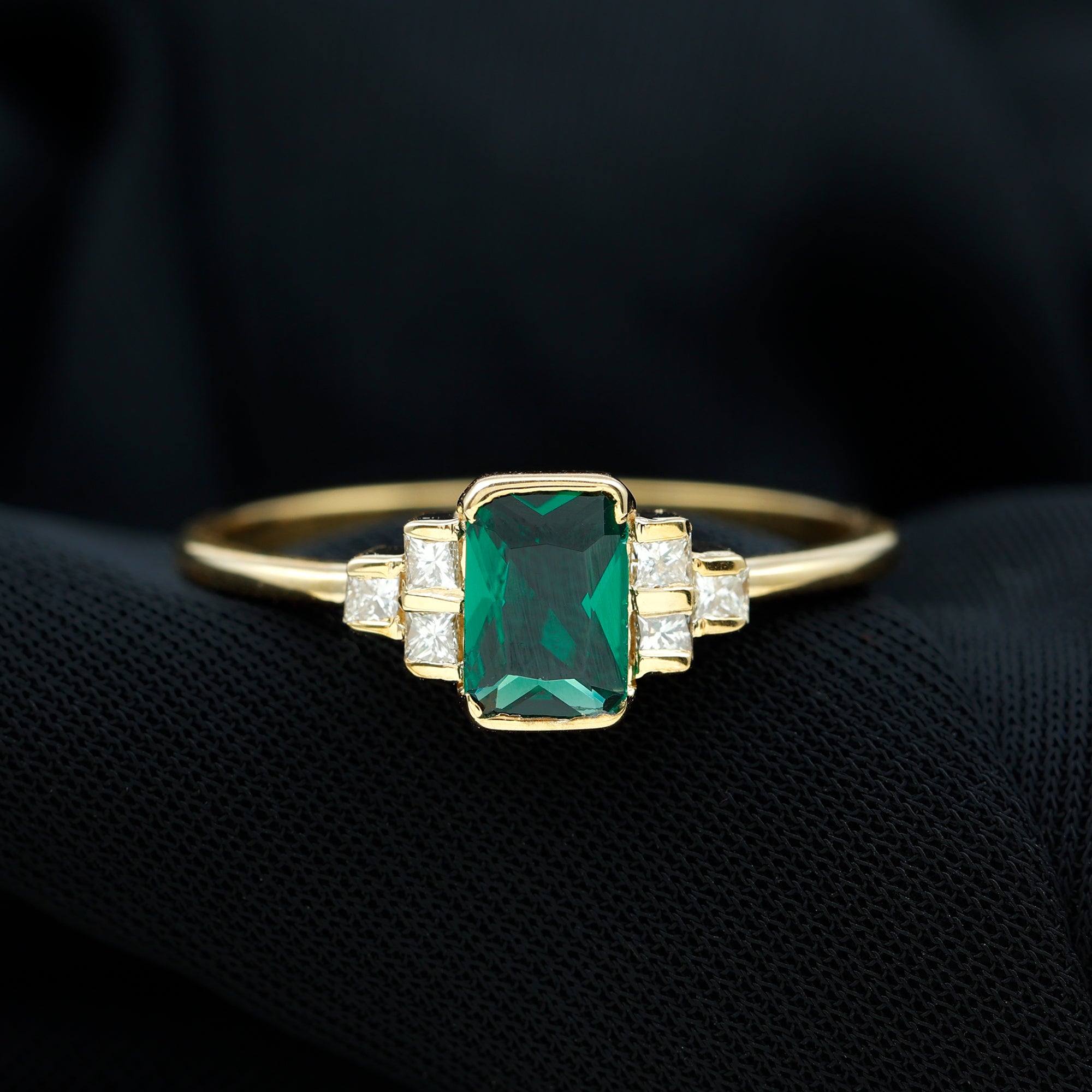 Make your special day unforgettable with a ring that blends timeless beauty and bold elegance. This Lab Grown Emerald Engagement Ring is designed to capture her heart at first glance. Thoughtfully designed, this Solitaire Engagement Ring features a 6X8 mm Emerald Cut Lab Created Emerald of Aaaa Quality as a center stone, admired for its deep green hue that symbolizes renewal, harmony, and everlasting love. On either side, sparkling Princess Cut Diamond gemstones are set in a trio arrangement, adding balance, brilliance, and a touch of Art Deco sophistication to the design. The combination of geometric cuts and contrasting shapes gives the Emerald Cut Engagement Ring a unique character, making it both modern and vintage-inspired. The Emerald Cut is known for its elegance, reflecting light for a look that is captivating. Together, the gemstones create a harmonious story of love, commitment, and strength. This Emerald Diamond Engagement Ring is a meaningful symbol of your promise and devotion. She will surely love this Emerald Cut Emerald Ring, and it will become her favorite piece, cherished for a lifetime. Perfectly crafted to celebrate the beginning of forever, this Lab Created Emerald Ring will make your special day truly memorable.