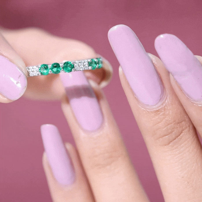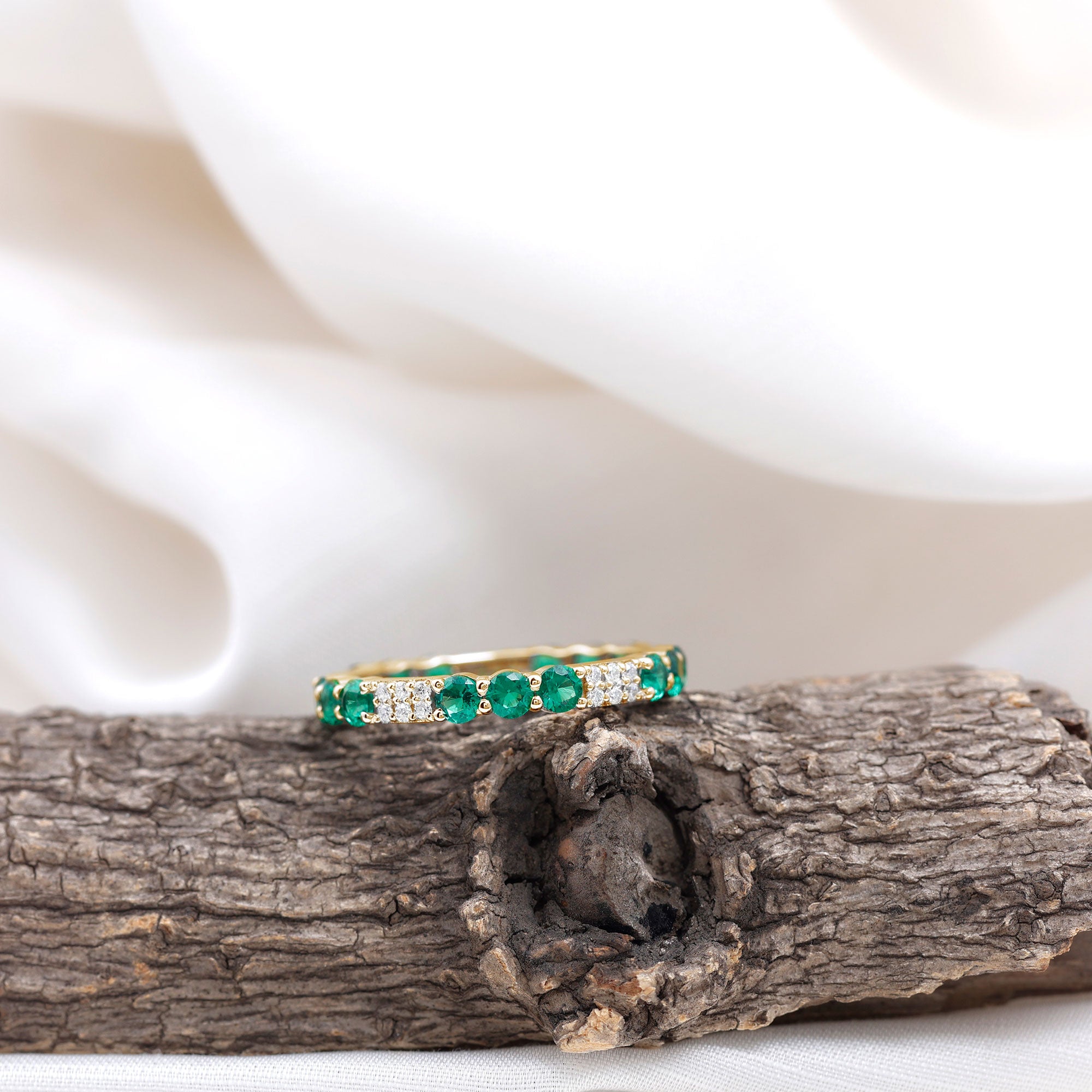 Commemorate your everlasting love with this Eternity Wedding Band, designed to create a perfect contrast of color and sparkle. This elegant Full Eternity Ring is adorned alternating Round Shape AAAA Quality Lab Created Emerald and HI-SI Diamond stones, set in a continuous pattern around the ring. The rich green of the Lab Emerald beautifully complements the bright Diamond, creating a striking balance between color and light that catches attention from every angle. Handcrafted with care and attention to detail, this Lab Grown Emerald Ring is a symbol of infinite love and commitment. Available in various ring sizes, this Lab Emerald Eternity Band is ideal for everyday wear, symbolizing unbroken and eternal affection. Whether worn alone or paired with an engagement ring, this Lab Emerald Diamond Ring adds a graceful and meaningful touch to any jewelry collection. Packaged in an elegant jewelry box, this Emerald Wedding Band is perfect for celebrating special moments of life.