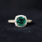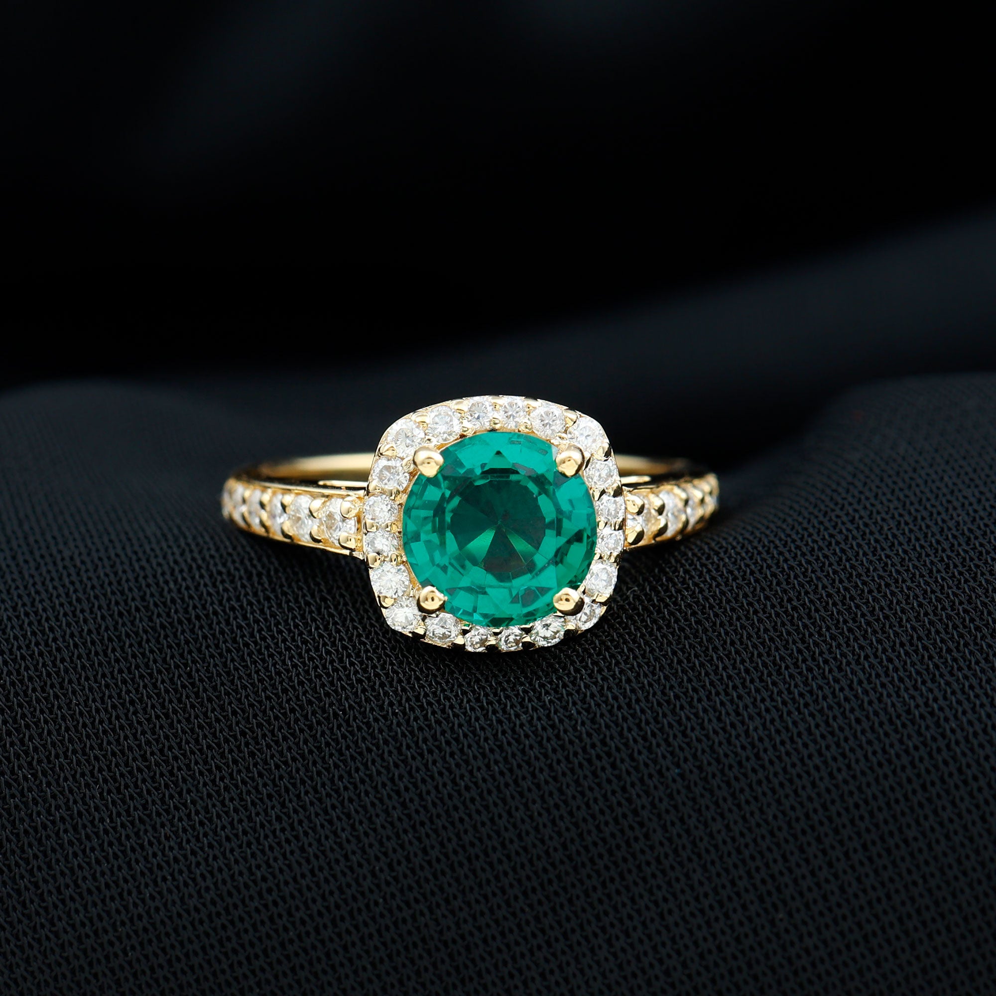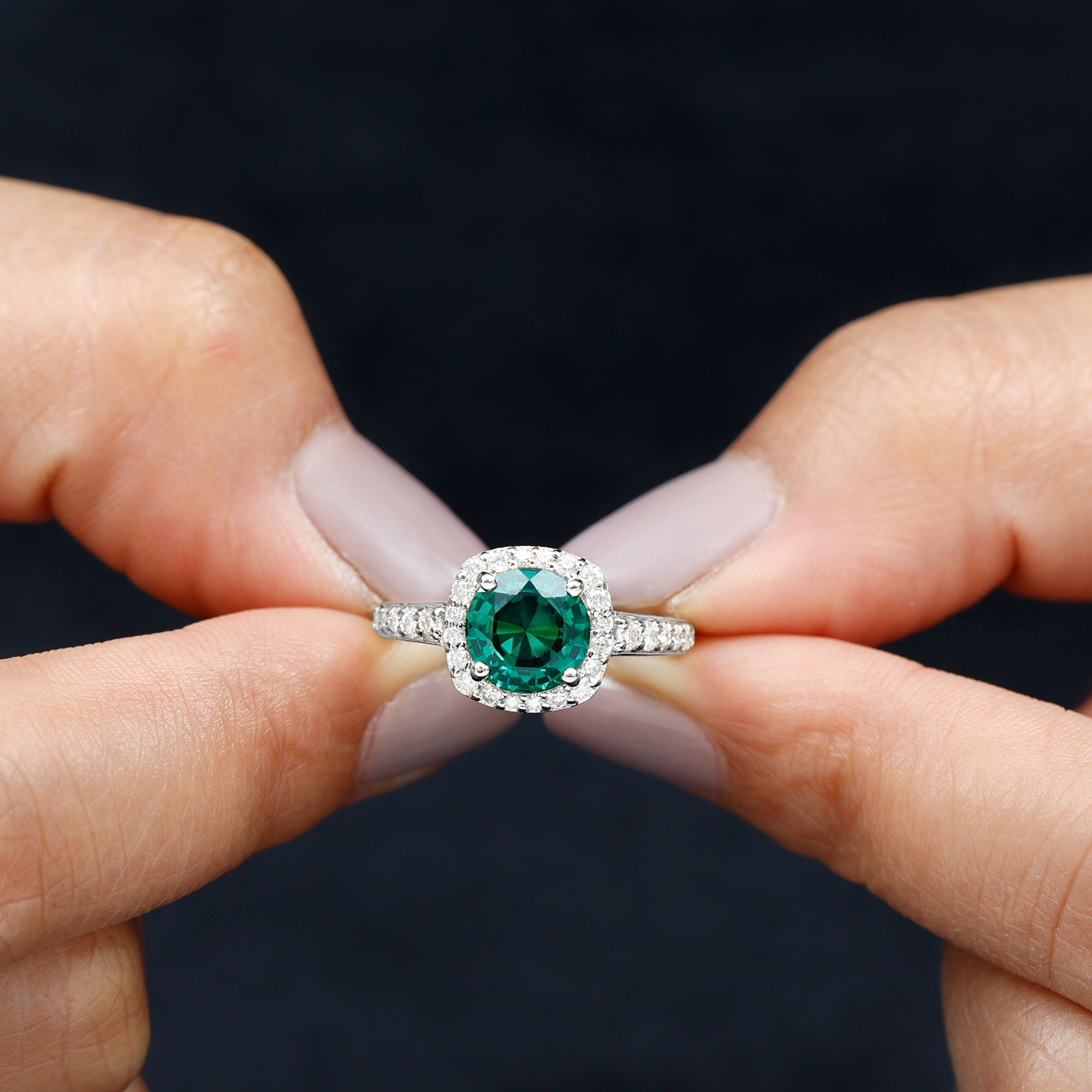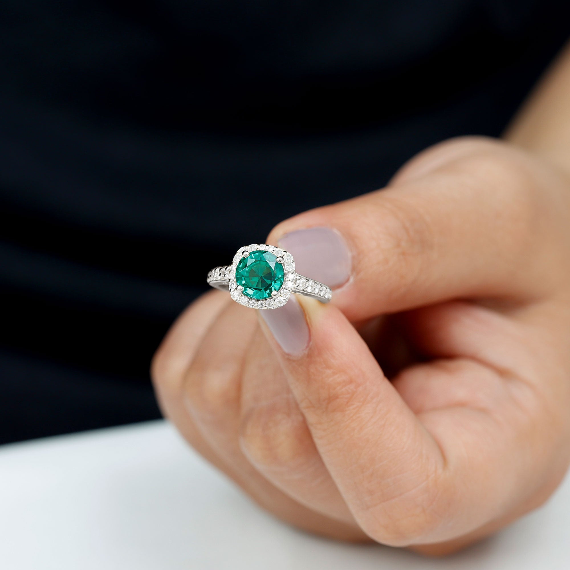 Discover the perfect blend of vintage charm and modern brilliance with this Lab Grown Emerald Engagement Ring. Designed to capture hearts, this Vintage Style Engagement Ring features a stunning 8 mm Round Lab Created Emerald, radiating a rich green hue. Surrounding the AAAA Quality Lab Emerald is a delicate Halo of sparkling Diamond, designed to amplify its color and brilliance while adding a touch of classic elegance. This Emerald Halo Engagement Ring is adorned with additional Diamond side stones, carefully placed to enhance the intricate design of the ring and create a timeless appeal. Handcrafted with meticulous attention to detail, this Lab Emerald Diamond Engagement Ring captures the romance of a bygone era while embracing today’s ethical standards. Its intricate design makes it a standout piece, perfect for the bride who cherishes history, elegance and unique style. Packaged in a Signature Jewelry Box and available in various ring sizes, this Lab Grown Emerald Ring is ready to symbolize a love that is both timeless and forward-looking, a true celebration of commitment.