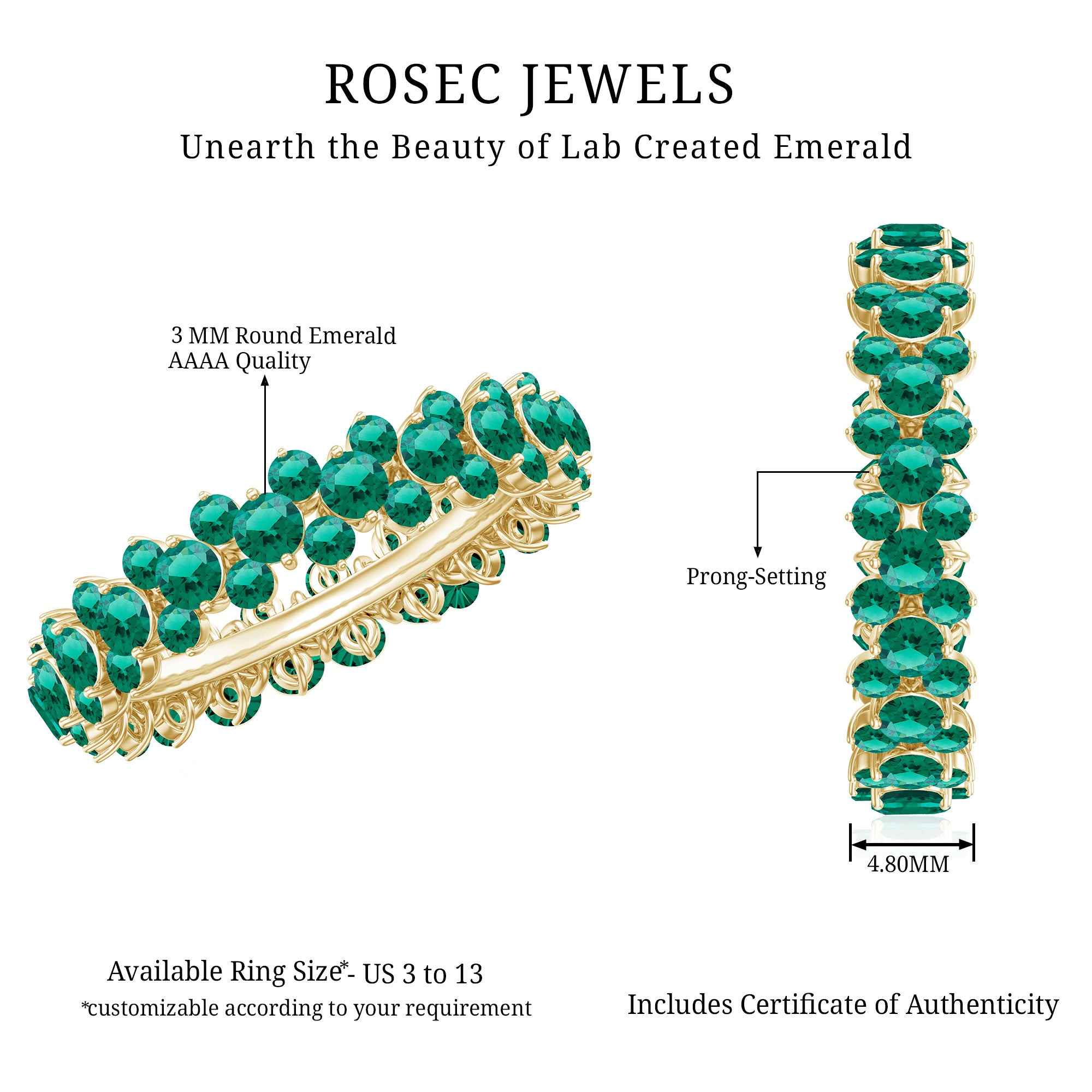 Commemorate love with this stunning Lab Emerald Eternity Band, a vibrant symbol of forever, designed to dazzle from every angle. This enchanting band features Round Shape Lab Grown Emerald stones of size 2 mm and 3 mm, set in a delicate flower-inspired pattern, where each stone forms the petals of a blooming love story. The deep green Lab Emerald stones, known for their timeless elegance and meaning of renewal, are arranged seamlessly around the band, creating a graceful garden of sparkle that wraps your finger in beauty. This Full Eternity Band is a fresh, feminine take on the classic eternity band, perfect for anniversaries, milestones or simply to say you are my always. Crafted with perfection and care, this Lab Emerald Anniversary Ring is as sustainable as it is stunning. Whether worn alone or stacked for a bold look, it adds a pop of color and charm to any jewelry collection. Arriving in an elegant jewelry box, this Wedding Anniversary Ring is ready to gift, cherish and adore.