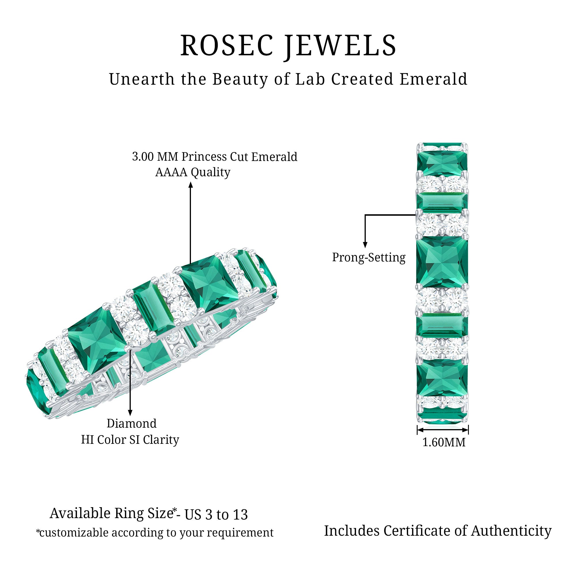 Step into a world of refined elegance with this Eternity Wedding Band, a distinctive celebration of love, craftsmanship and sustainability. This Full Eternity Ring is a masterful arrangement of AAAA Quality Lab Created Emerald stones in alternating Baguette and Princess Cut shapes, creating a rhythm of geometric precision and vivid green allure. Each Lab Emerald radiates a lush, deep color, perfectly paired with sparkling HI-SI Diamond that punctuates the design with shimmering light. The continuous line of gemstones around the band symbolizes an unbroken circle of commitment, making this Lab Emerald Wedding Band an exceptional choice for weddings, anniversaries or personal milestones. Whether worn alone for a statement of individuality or stacked for layered elegance, this Lab Emerald Diamond Eternity Band is designed to be as versatile as it is timeless. Presented in a luxury jewelry box and available in multiple US standard sizes, the Lab Emerald Diamond Wedding Band redefines sophistication for the modern couple.