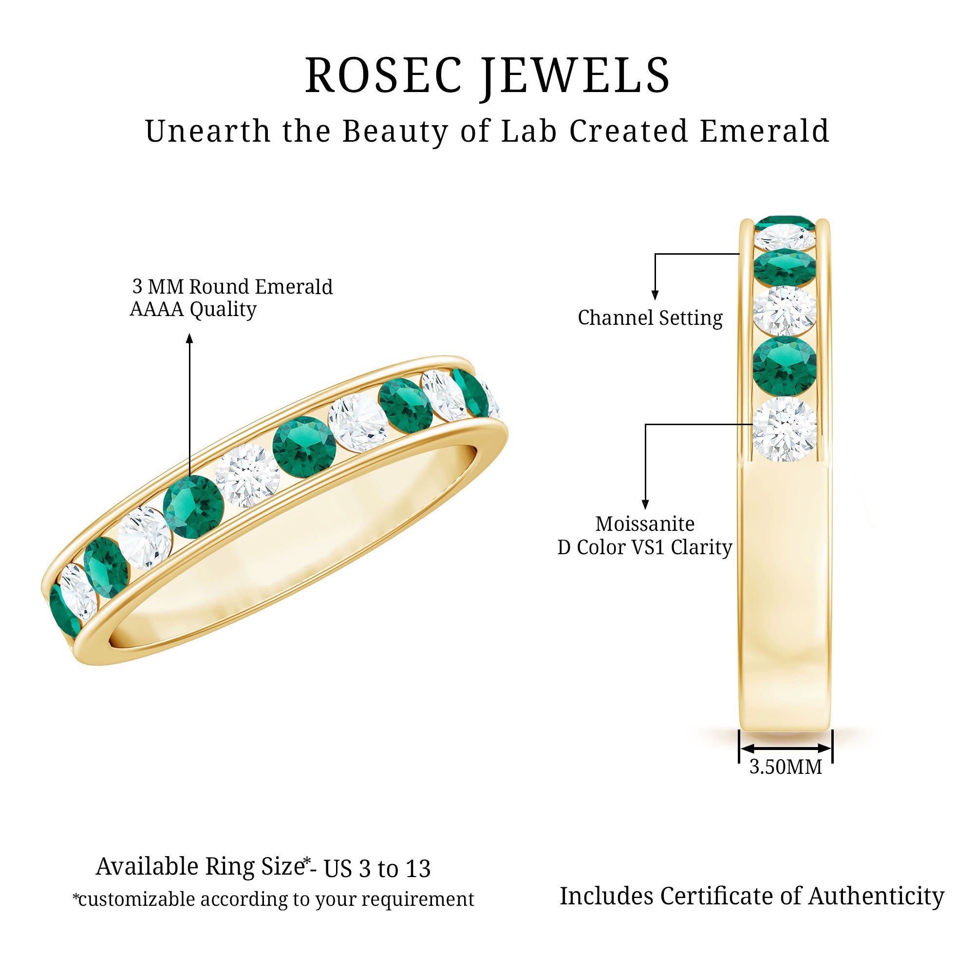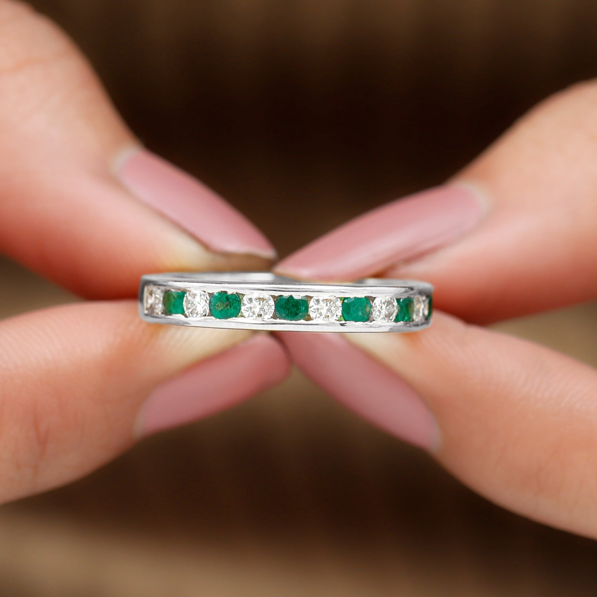 Celebrate a love that’s vibrant, bold, and built to last with this Half Eternity Band, a dazzling twist on a classic anniversary ring. This eye-catching design features alternating 3 mm Round Shape Lab Created Emerald and sparkling Moissanite stones, creating a perfect rhythm of rich green sparkle and radiant white fire. Each stone is carefully set to showcase its beauty while maintaining a sleek, modern design. The half eternity style offers the ideal balance of elegance and comfort, making this Lab Grown Emerald Ring perfect for everyday wear while still delivering maximum sparkle. Whether you are celebrating an anniversary, a milestone or simply saying I still do, this Emerald Moissanite Ring is a meaningful reminder of your journey together. The Lab Emerald stones exude a lush green hue, while the Moissanite stones bring brilliance and strength, just like your bond. Packaged in a signature jewelry box, this Lab Created Emerald Ring is ready to gift and ready to shine. Stack it, style it or let it stand alone, this Lab Emerald Ring for Women is designed to turn heads and warm hearts.