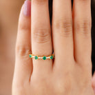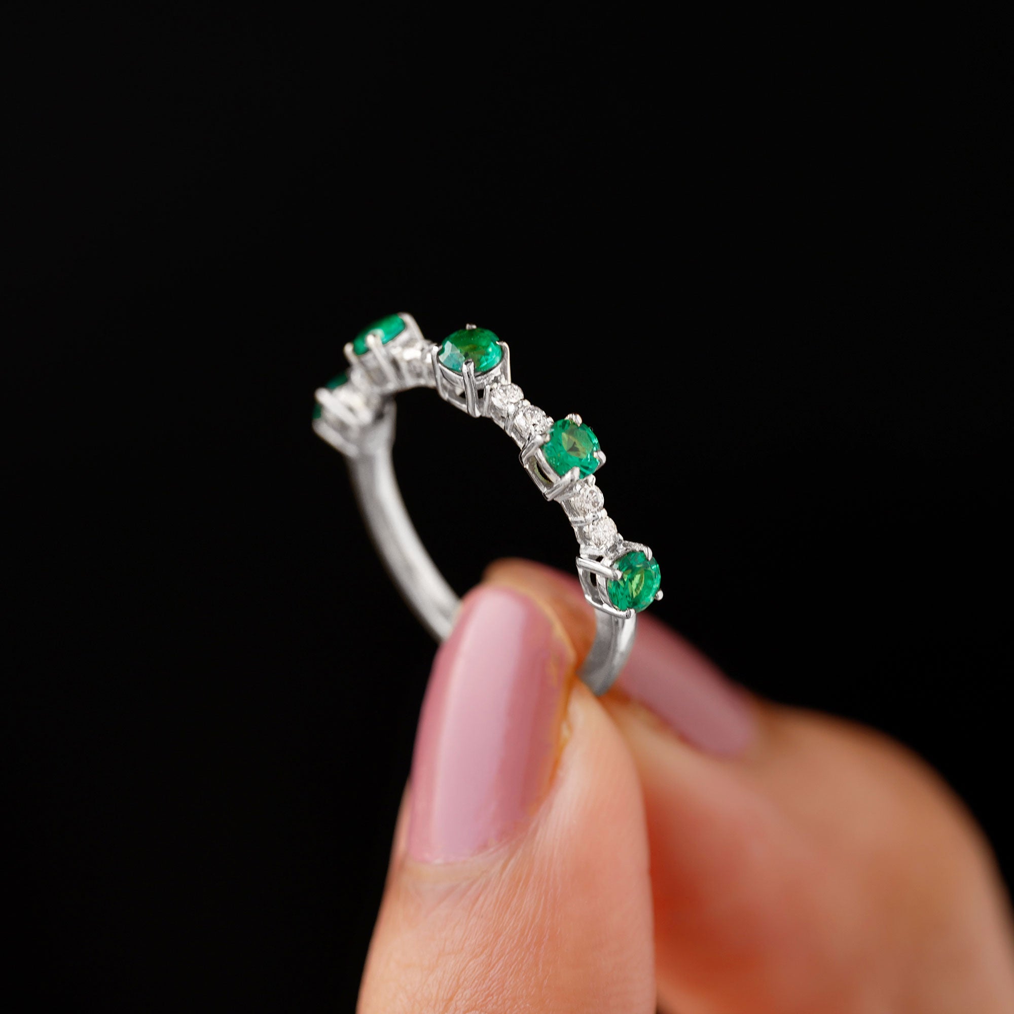 Commemorate enduring love with this Lab Grown Emerald Ring, a modern twist on a timeless symbol. This Half Eternity Ring is adorned with vibrant 3 mm Lab Created Emerald stones alternating with dazzling petite Diamond stones. The stones wrap halfway around the band, creating a harmonious play of color and light. This Lab Emerald Diamond Ring offers a contemporary look, making it perfect for everyday wear or special occasions. The Lab Grown Emerald symbolizes growth, renewal and the lasting strength of your bond, while the Diamond adds classic sparkle, representing clarity and eternity. Meticulously crafted, this Emerald Anniversary Ring blends sustainable luxury with elegant craftsmanship, ensuring it becomes a cherished token of shared memories and future dreams. Ideal for celebrating anniversaries, milestones or simply as a thoughtful gift, this Lab Created Emerald Ring adds personality, meaning and lasting beauty to her collection. Available in various ring sizes and presented in a Signature Jewelry Box, it is ready to mark a love that keeps growing stronger.
