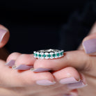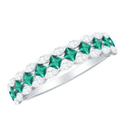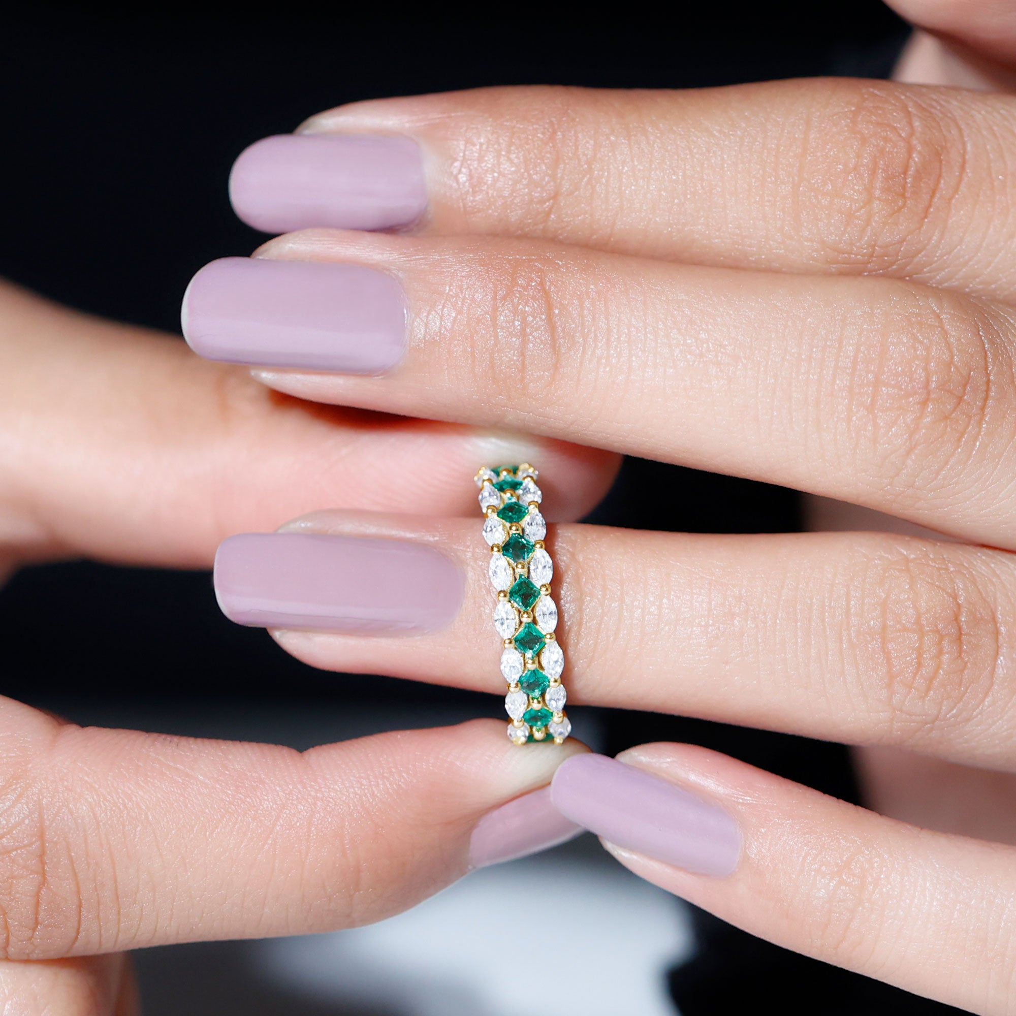 Captivate hearts on your special day with the stunning Half Eternity Wedding Band, a perfect blend of elegance, meaning, and brilliance. The design features a beautiful center row of 3 mm Princess Cut Lab Created Emerald stones, set diagonally in Prong Setting to create a unique and eye-catching pattern. On either side of the Lab Emerald row, Marquise Shape Moissanite stones are placed horizontally, adding extra sparkle and a touch of sophistication. The combination of Lab Grown Emerald and Moissanite creates a stunning contrast of color and light, making the Half Eternity Band stand out with graceful charm. Available in various ring sizes from 3 to 13, this Lab Grown Emerald Ring is designed to fit comfortably and complement your engagement ring perfectly or stand beautifully on its own. This Princess Cut Emerald Ring comes elegantly packaged in a jewelry box, ready to be gifted as a treasured keepsake. Whether exchanged on your wedding day or given as a symbol of everlasting love, this Emerald Wedding Band will surely be the perfect choice for her, a radiant reminder of your shared journey and the promise of forever.