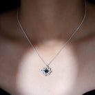Discover the timeless charm of our Emerald Pendant Necklace, made from stunning 14k white gold plated sterling silver. This piece is embellished with sparkling moissanite stones and a lush green lab emerald, designed to leave a lasting impression and elevate any outfit. The pendant showcases a graceful interlock design, featuring a prong set 6 MM round cut lab-created emerald at its center, surrounded by interlocked geometric frames adorned with tiny moissanite gems. With its subtle elegance, this Lab Grown Emerald Necklace beautifully highlights your unique style. The deep green hue of the AAAA quality lab emerald radiates sophistication and allure, making it the perfect accessory for any occasion. This Designer Emerald Necklace is not only great for everyday wear but also serves as a stylish statement for cocktail parties, a thoughtful gift for birthdays, anniversaries, or Valentines Day for someone special, or even as a stunning addition to your wedding day look for a striking contrast.