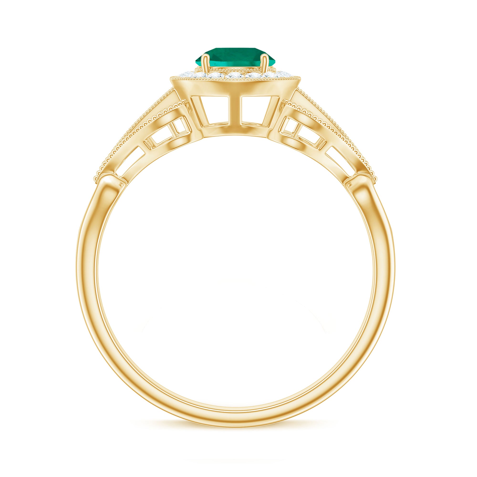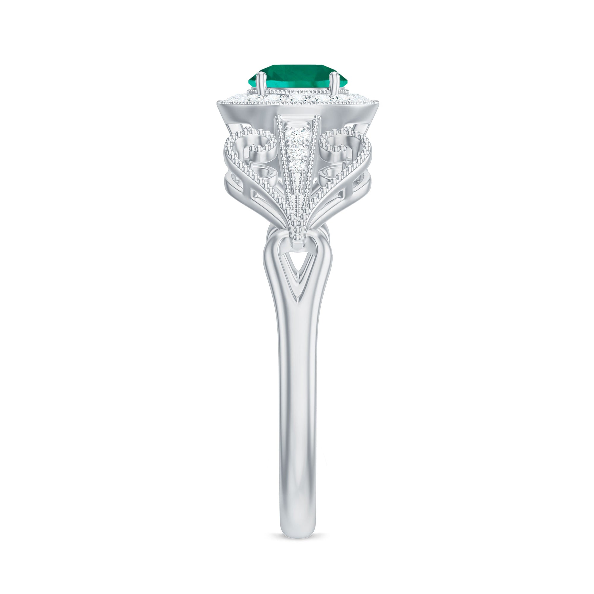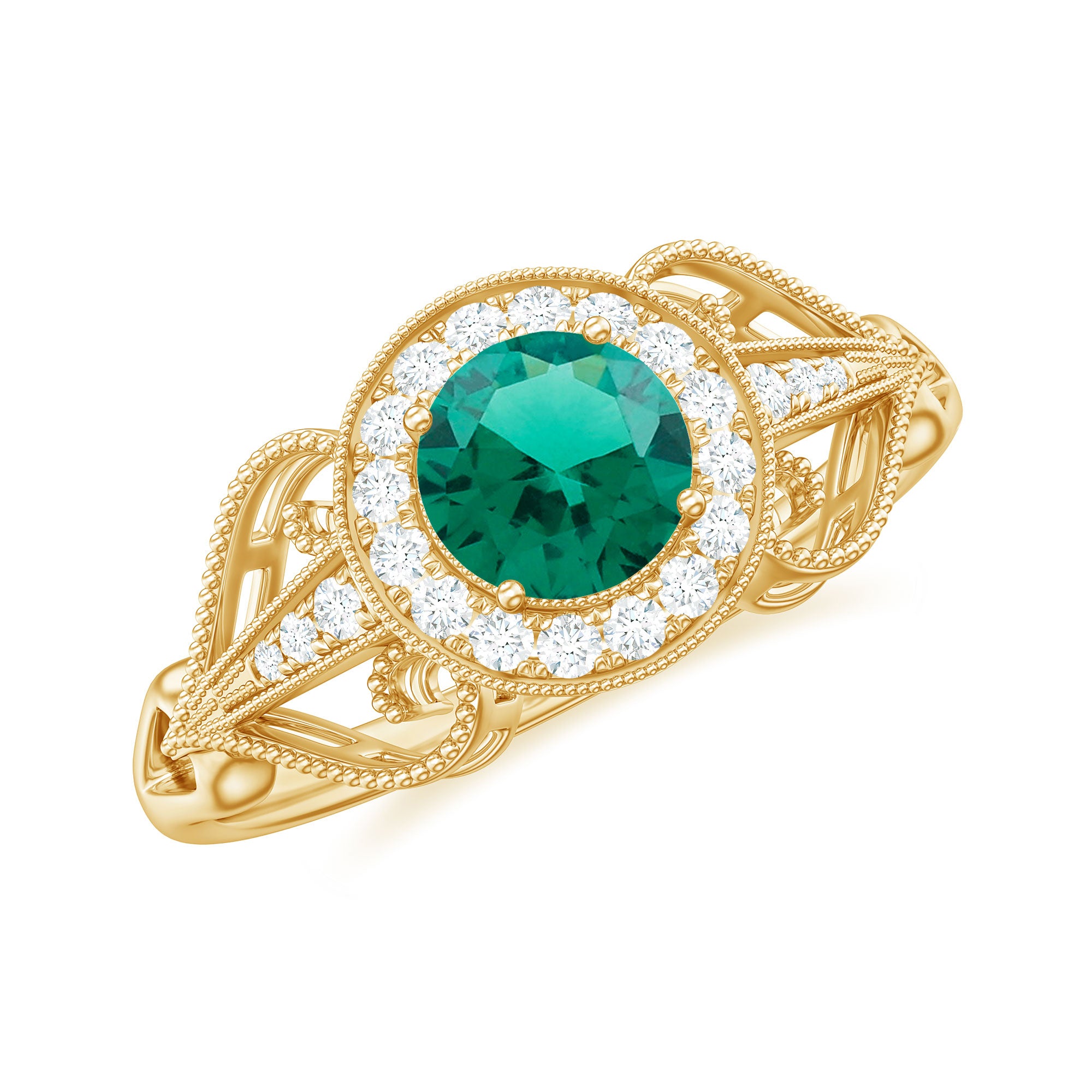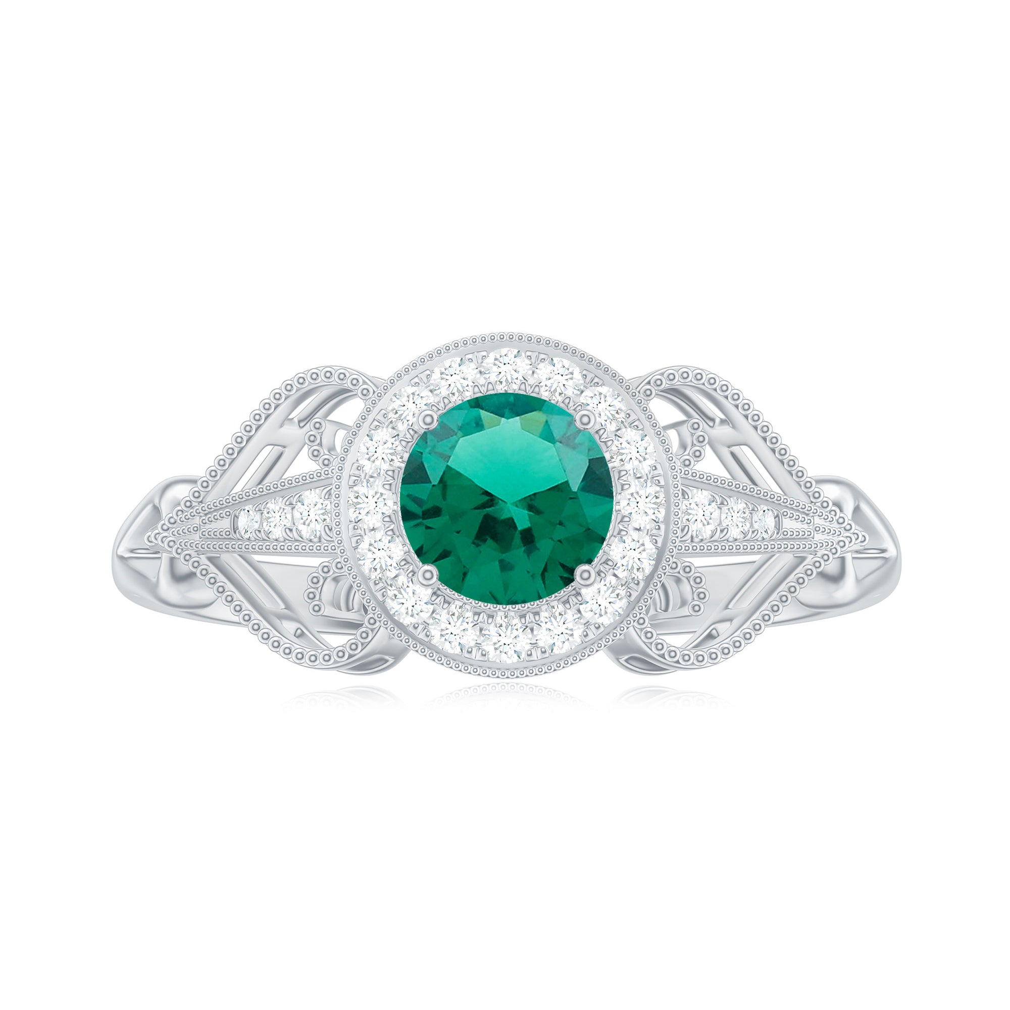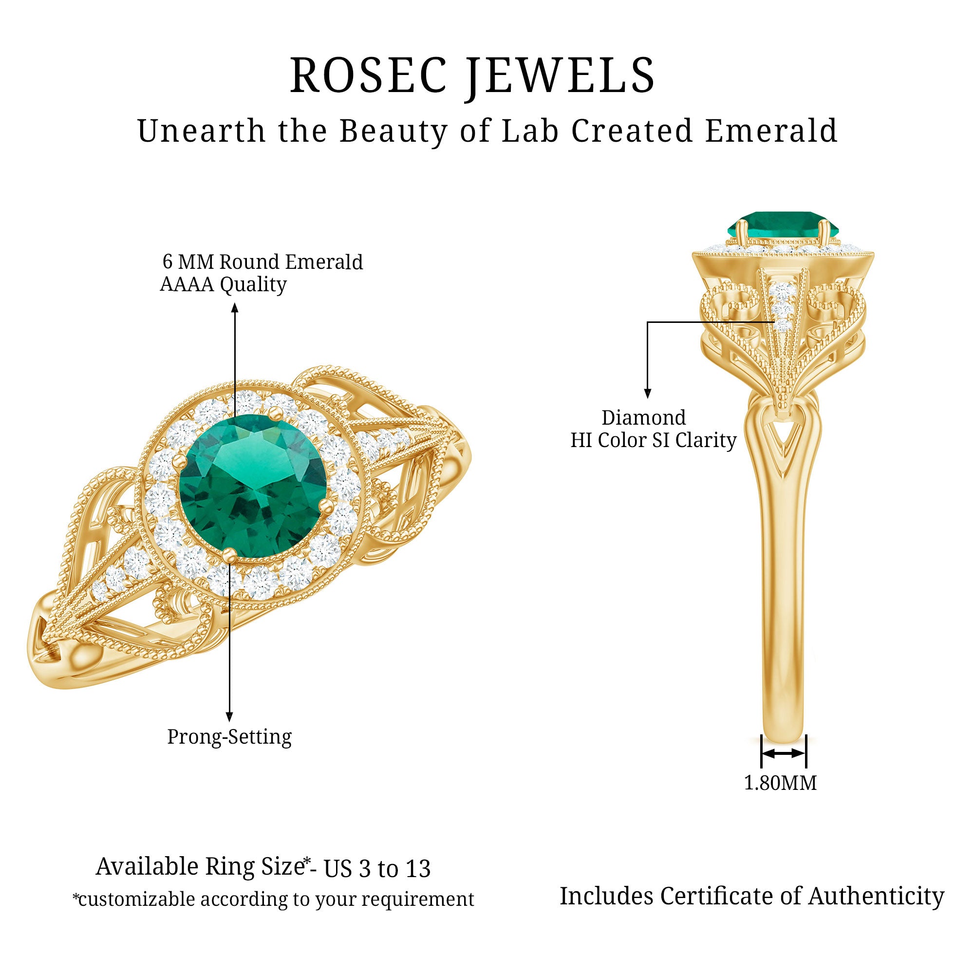 Handcrafted with perfection and attention to detail, this Vintage Looking Engagement Ring honors the past without sacrificing contemporary style. Capturing the grace of the bygone era, this Fine Engagement Ring features a 6 mm Round Shape Lab Created Emerald of AAAA Quality as the center stone set in Prong Setting, surrounded by a sparkling Halo of HI-SI Diamond stones, enhancing its vibrant green hue and adding radiant brilliance. The vintage style band of this Lab Grown Emerald Ring is thoughtfully designed to echo timeless romance, adorned with delicate Beaded Detailing that adds texture and a touch of antique flair. The band is further embellished with shimmering, dainty Diamond stones, set gracefully along the shoulders to create a continuous sparkle from every angle. This Lab Grown Emerald Diamond Ring is a perfect tribute to enduring love and timeless style. Whether as a heartfelt proposal or a meaningful anniversary gift, this Vintage Emerald Engagement Ring is sure to become a cherished heirloom for generations to come.