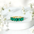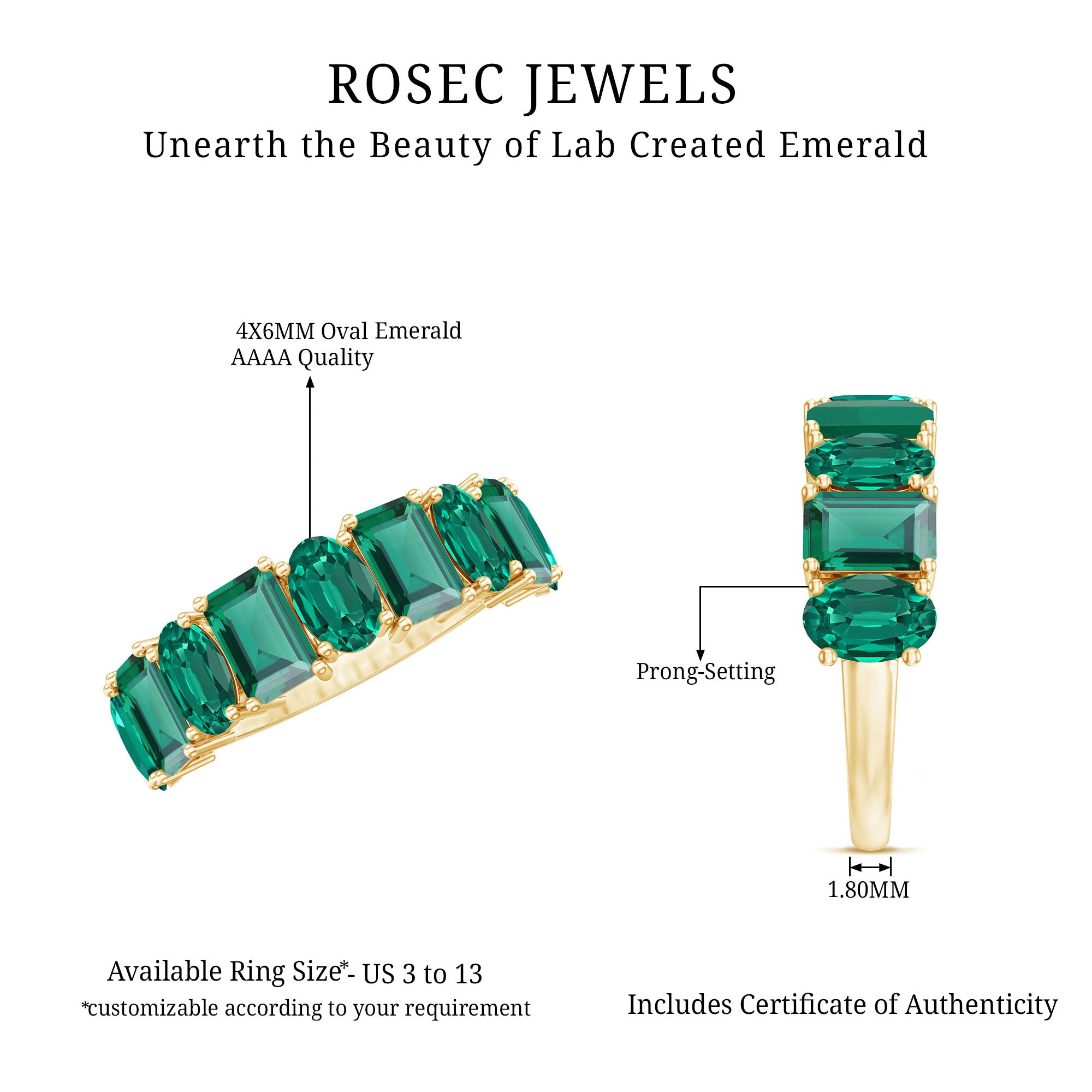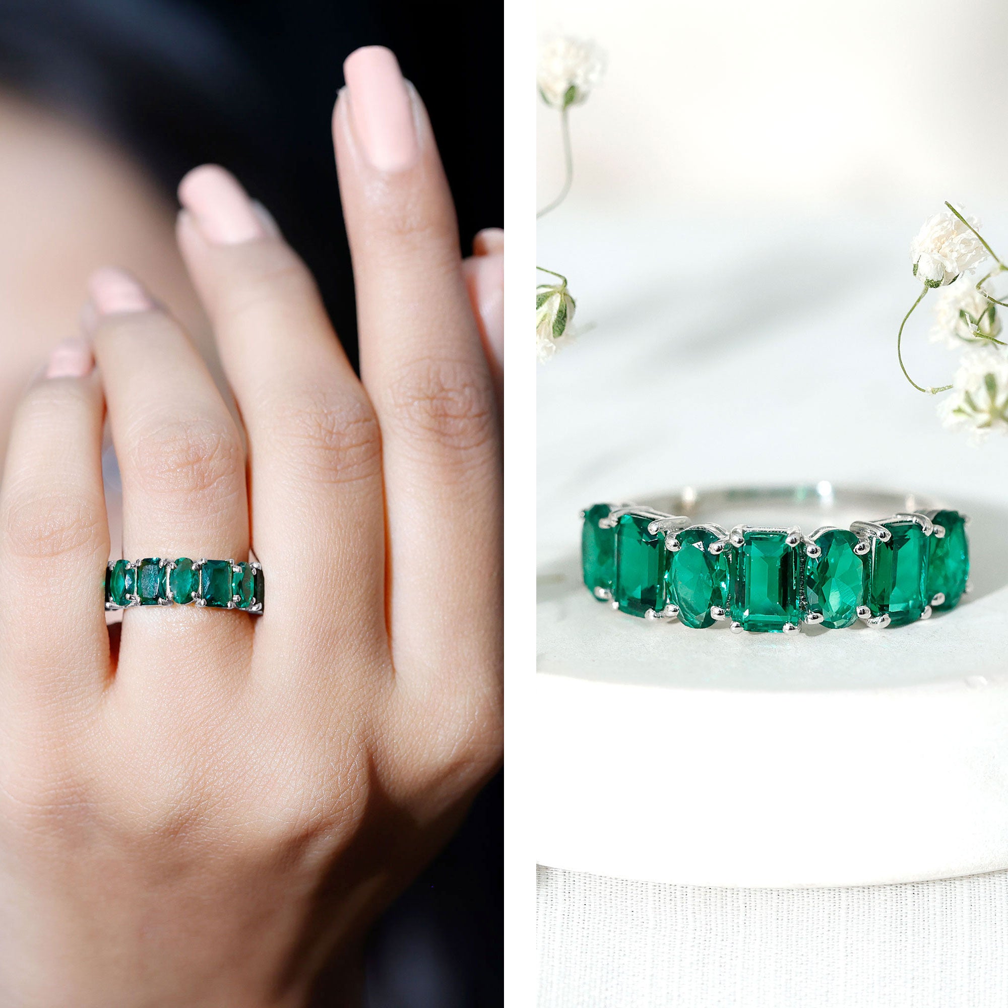 A touch of vibrant green can transform any moment into something unforgettable, and this Lab Created Emerald Half Eternity Ring does exactly that. Designed with alternating 4X6MM oval and emerald cut lab created emerald stones, it offers a beautiful balance of shape and sparkle. Each gemstone is securely set in prong setting, allowing the rich emerald color to stand out with brilliance and clarity. Crafted in hallmarked metal, the Emerald Wedding Band is made to last, giving you both quality and elegance in one meaningful piece. With its timeless design, this Emerald Anniversary Band makes a thoughtful and heartfelt birthday gift for someone special. Whether gifted as a token of affection or chosen as a personal treasure, it carries both beauty and sentiment. Perfect as a wedding band, a stacking ring, or a stand-alone piece, this created Half Eternity Wedding Band fits effortlessly into any style. Simple yet striking, it brings a touch of sophistication to everyday wear while still feeling special enough for important occasions.