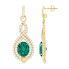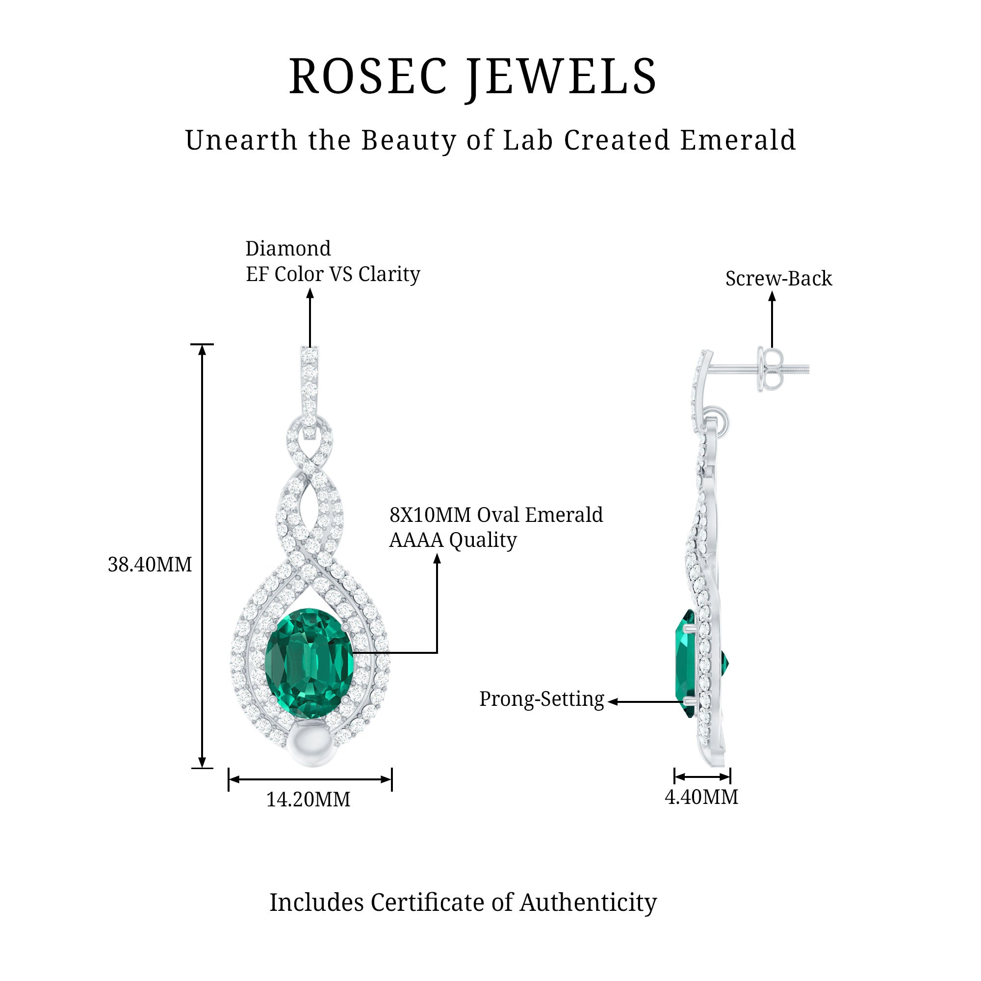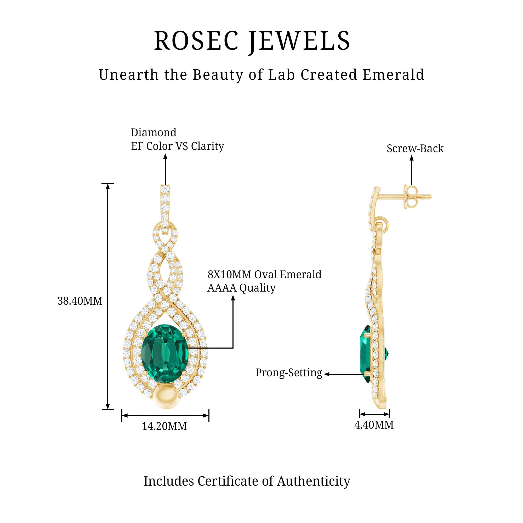 Celebrate your growing love with our Created Emerald Drop Earrings. The 8x10mm Oval Shaped Emerald makes a bold statement, complemented by Round Diamond for a complete, elegant look. Versatile and beautiful, these Infinity Earrings adds grace to any attire. Experience the fusion of natures green allure and the timeless dazzle of Aaaa Quality Emerald and Ef-Vs Quality Diamond, a symphony of luxury, prosperity, and enduring love. Elevate your elegance with the Emerald Diamond Earrings, embrace the benefits of Emerald and Diamond fusion, where beauty knows no bounds. Rosec Jewels specializes in crafting show-stopping pieces with Certified Lab Grown Gemstones. Check it out and indulge in timeless elegance.