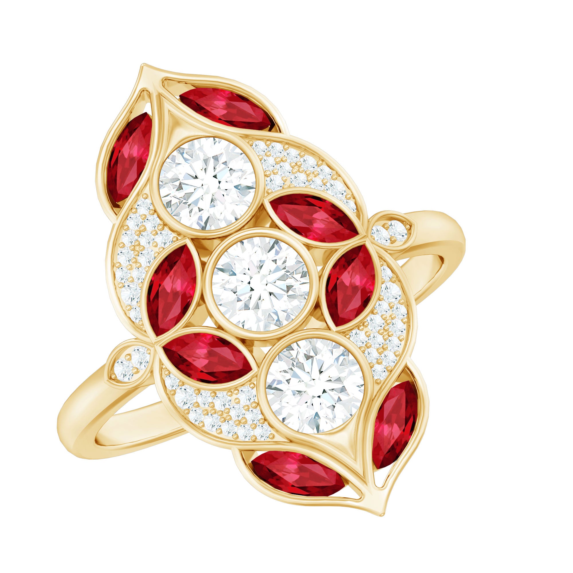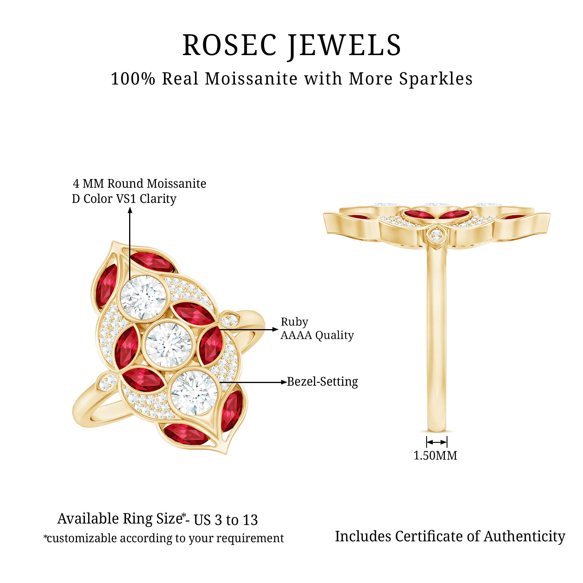 Certified Lab Grown Ruby Art Deco Statement Ring with Moissanite
