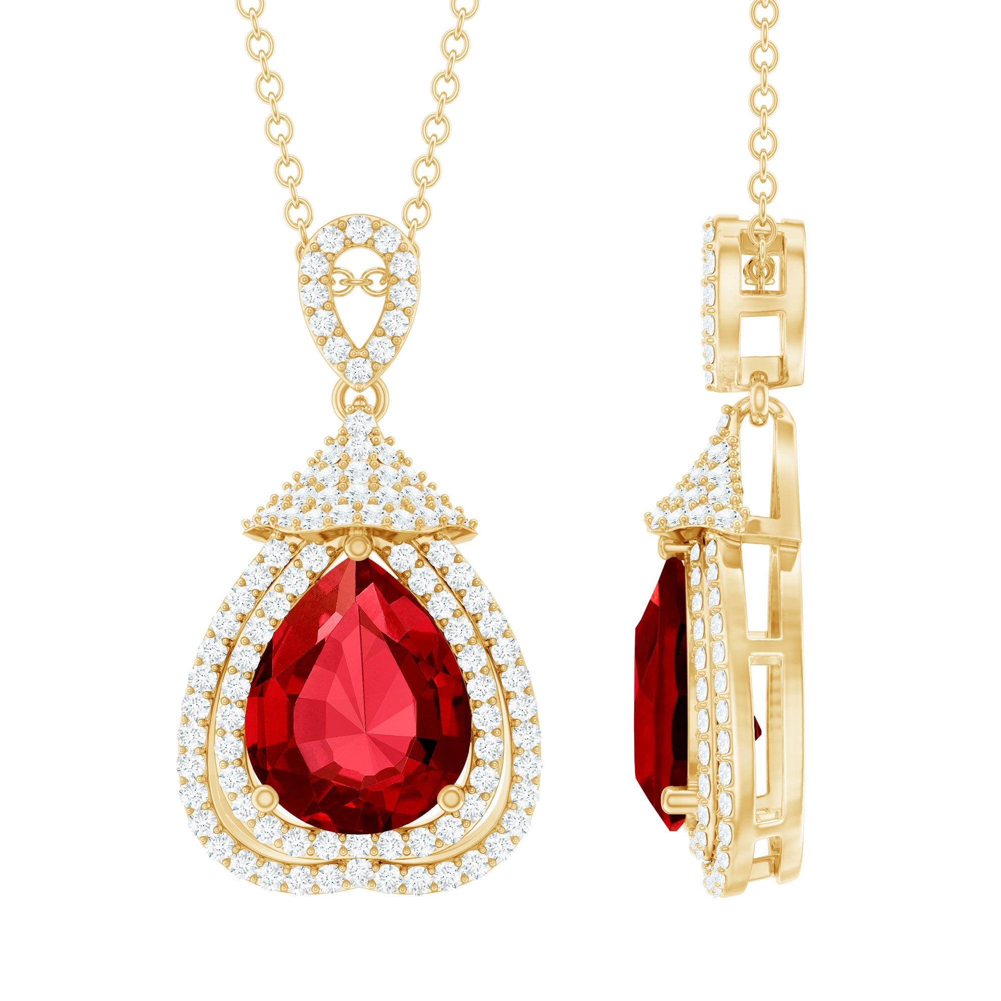 Express your admiration for her by gifting her the exquisite Lab Grown Ruby Drop Pendant Necklace. This stunning piece showcases a 8x10 mm Pear Shaped Lab Grown Ruby at its heart elevating its allure, crowned by two layers of dazzling Round Lab Grown Diamonds. Let this Elegant Necklace be a symbol of her extraordinary beauty and uniqueness in your eyes. Embrace the brilliance of Aaaa Quality Ruby and the enduring grace of Ef-Vs Quality Diamond for a love story written in gemstones. Order this Ruby Diamond Pendant Necklace Rosec Jewels, specialists in crafting stunning jewelry pieces using Certified Lab Cultured Gemstones.