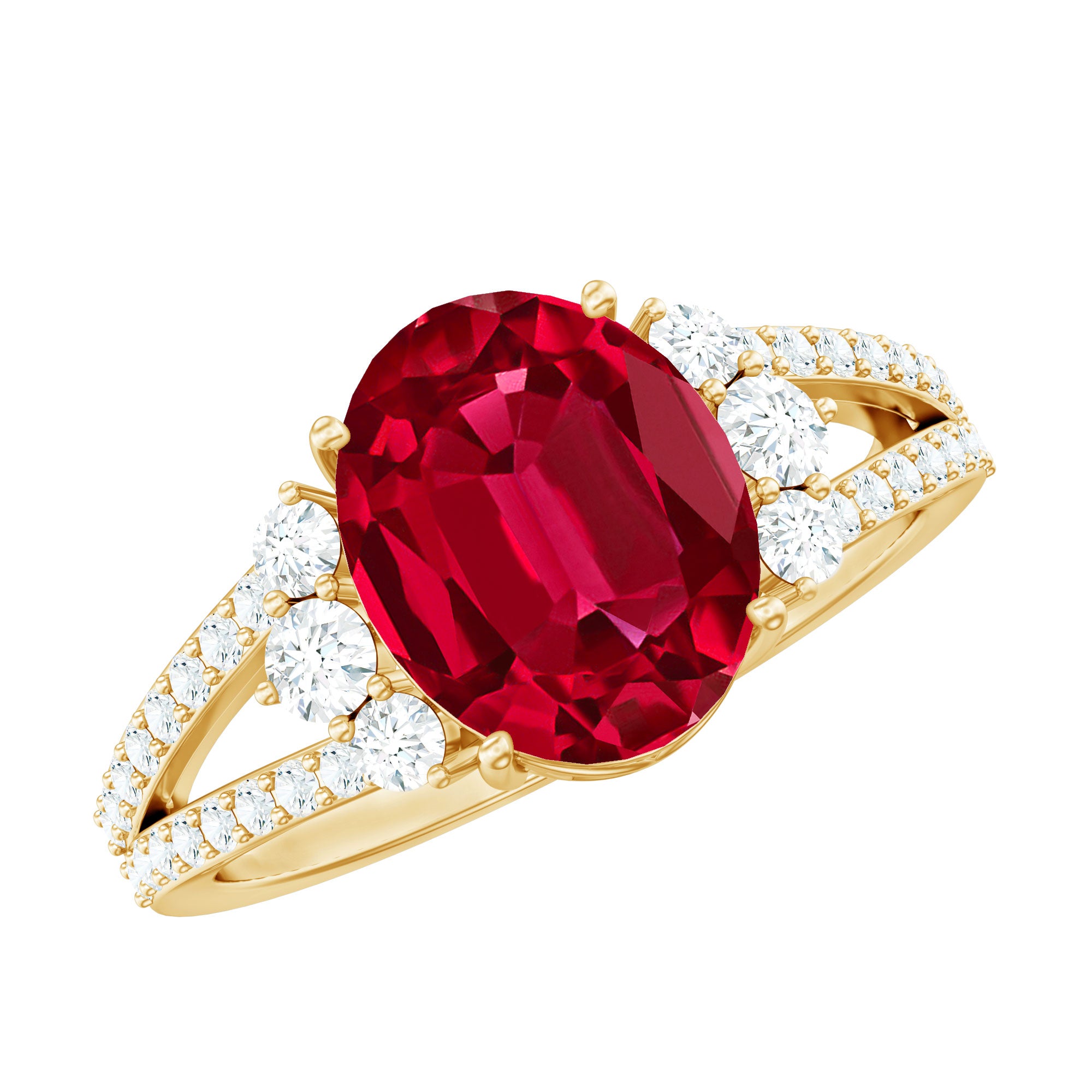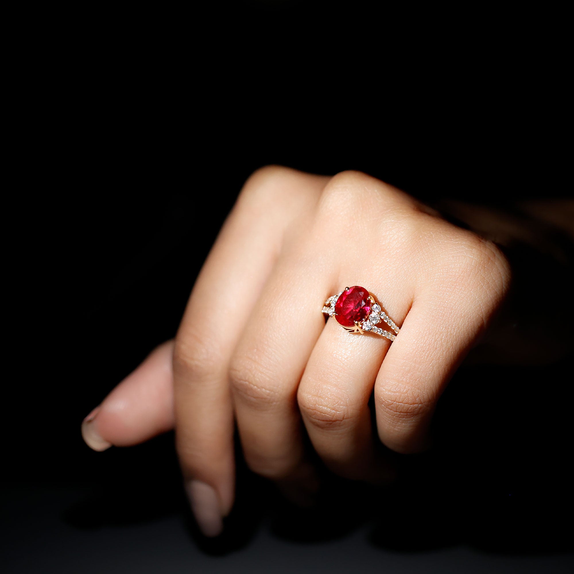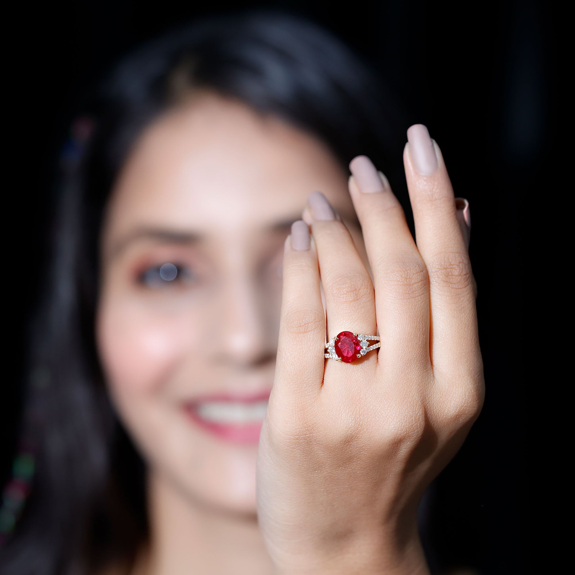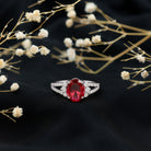 The epitome of timeless grace and sophistication, this Ruby Engagement Ring is a reflection of your eternal bond. Features 8X10 MM Oval Created Ruby set in prong setting complimented by the split shank shimmering with Round petite Moissanite. The captivating combination of red ruby and sparkling moissanite makes this split shank ring a delicate piece for her. Make her feel special and elevate your engagement day with our ruby ring that is sure to give an exquisite touch to her ensemble.