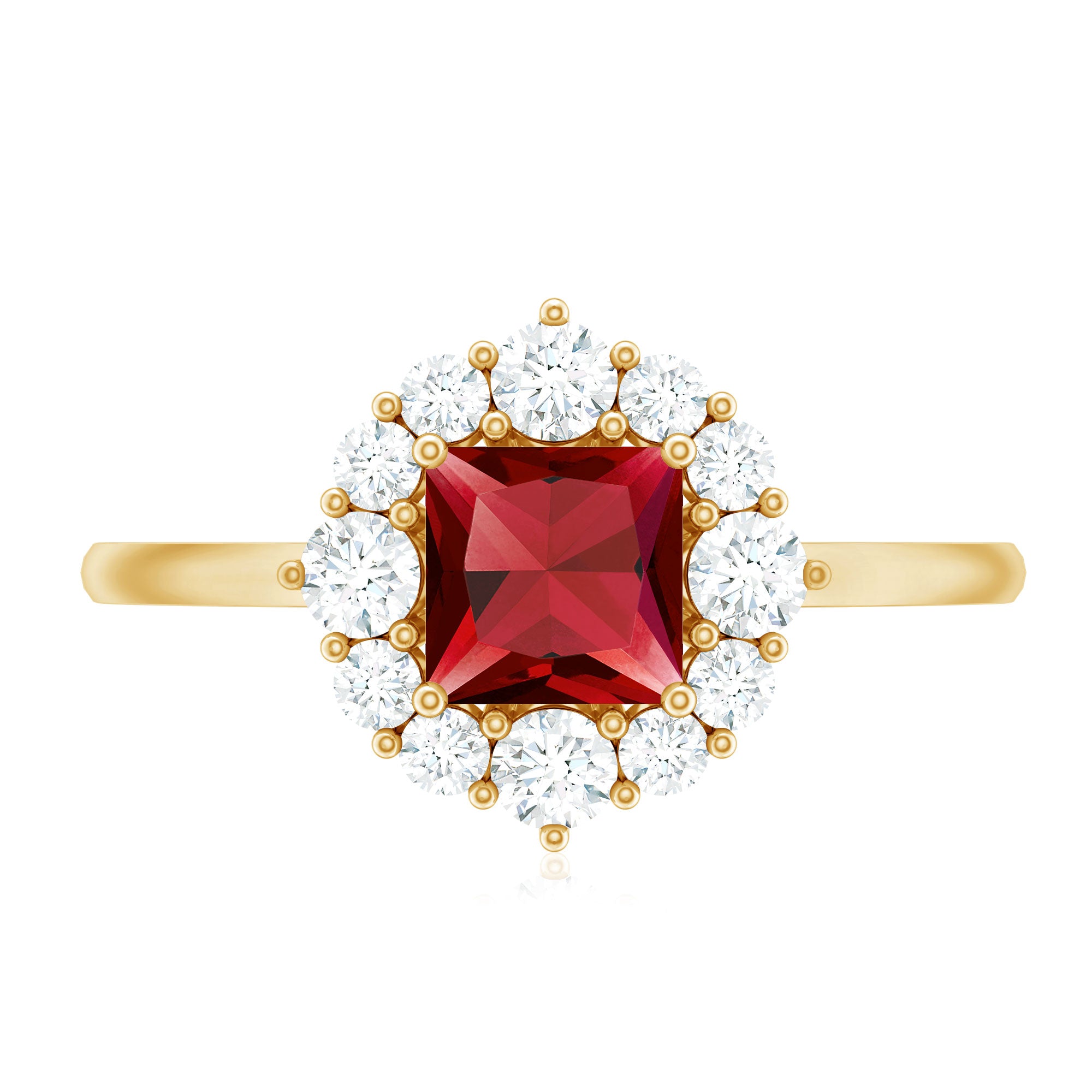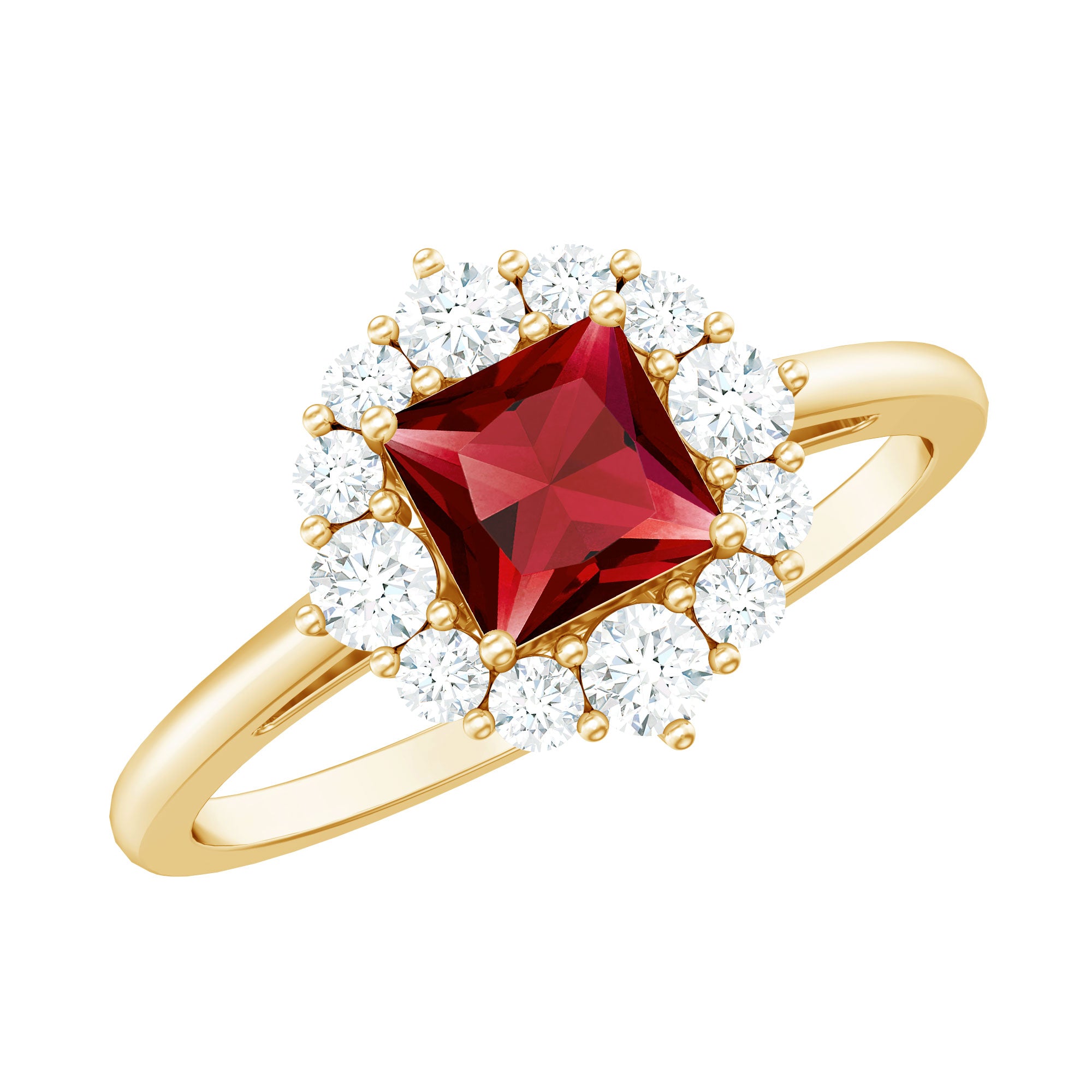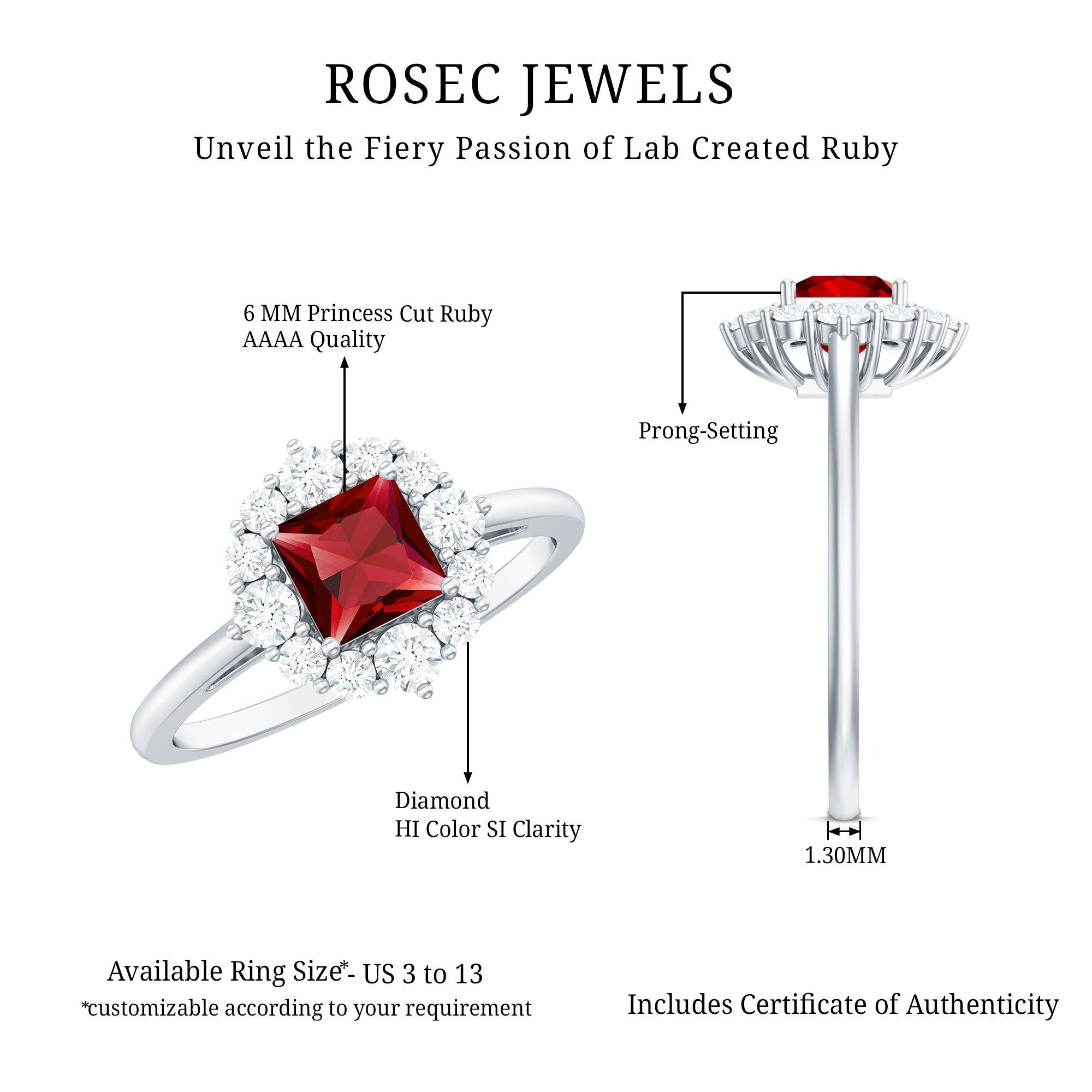 This Lab Created Ruby Engagement Ring is a beautiful mix of elegance and modern charm. At the center sits a 6 MM princess cut lab created ruby, held securely in prong setting. Around the ruby, a shining diamond halo adds extra brilliance, creating a lovely contrast that catches the light from every angle. Each diamond is carefully placed to enhance the center ruby’s glow, giving the Princess Cut Engagement Ring a touch of luxury. The polished band adds a smooth and graceful finish, making this piece perfect for any occasion, whether it is an engagement, anniversary, or a special gift. Every stone in this Ruby and Diamond Ring is expertly crafted, and it comes with a certificate for quality and authenticity, so you can be confident in its lasting beauty. Available in a variety of ring sizes, it is designed to fit comfortably while maintaining its elegant look. Presented in a beautifully packaged jewelry box, this Halo Engagement Ring is ready to gift or cherish. With its timeless design and sparkling detail, it is a lasting symbol of love and commitment.