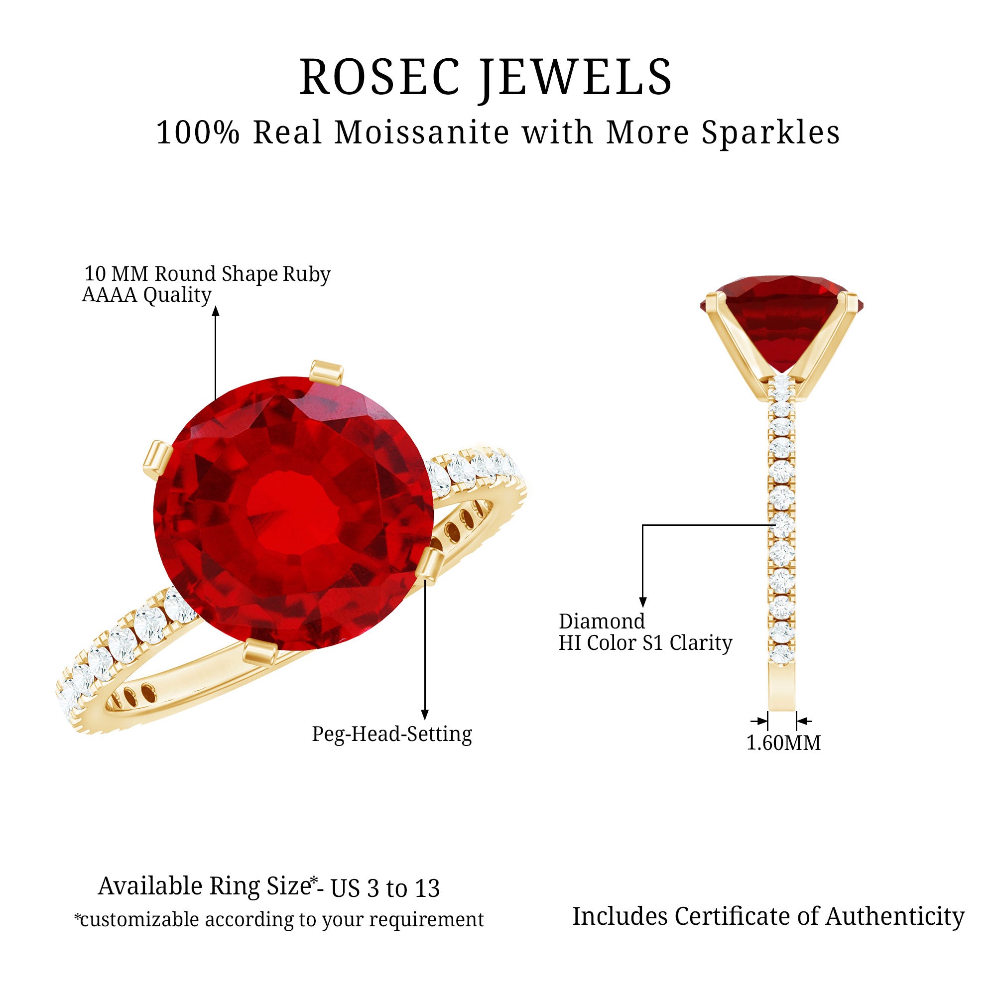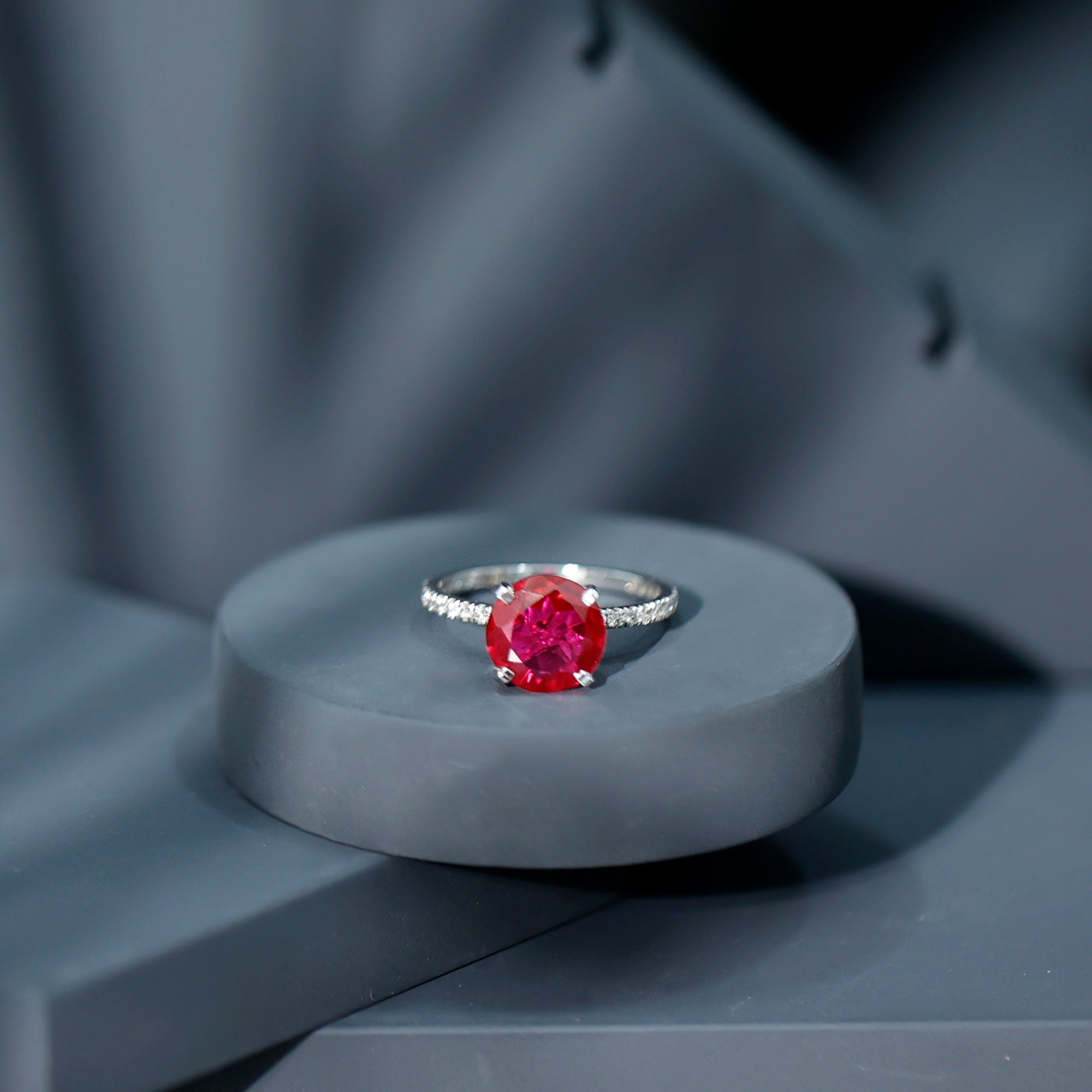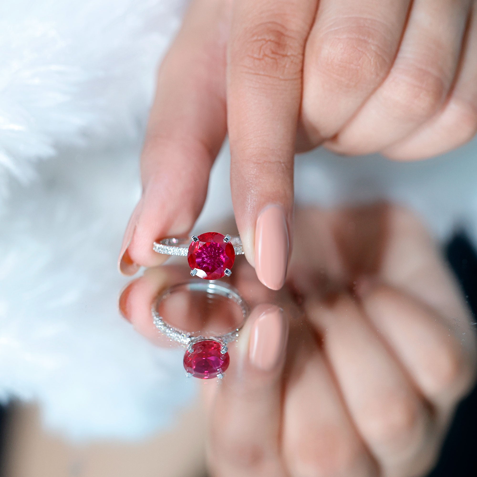 Enhance your allure with the enchanting elegance of this lovely Solitaire Engagement Ring embellished with Round Shape Created Ruby with Diamond side stones. This ring showcases the warmth of Created Ruby, imparting a satisfying radiance to your appearance.