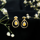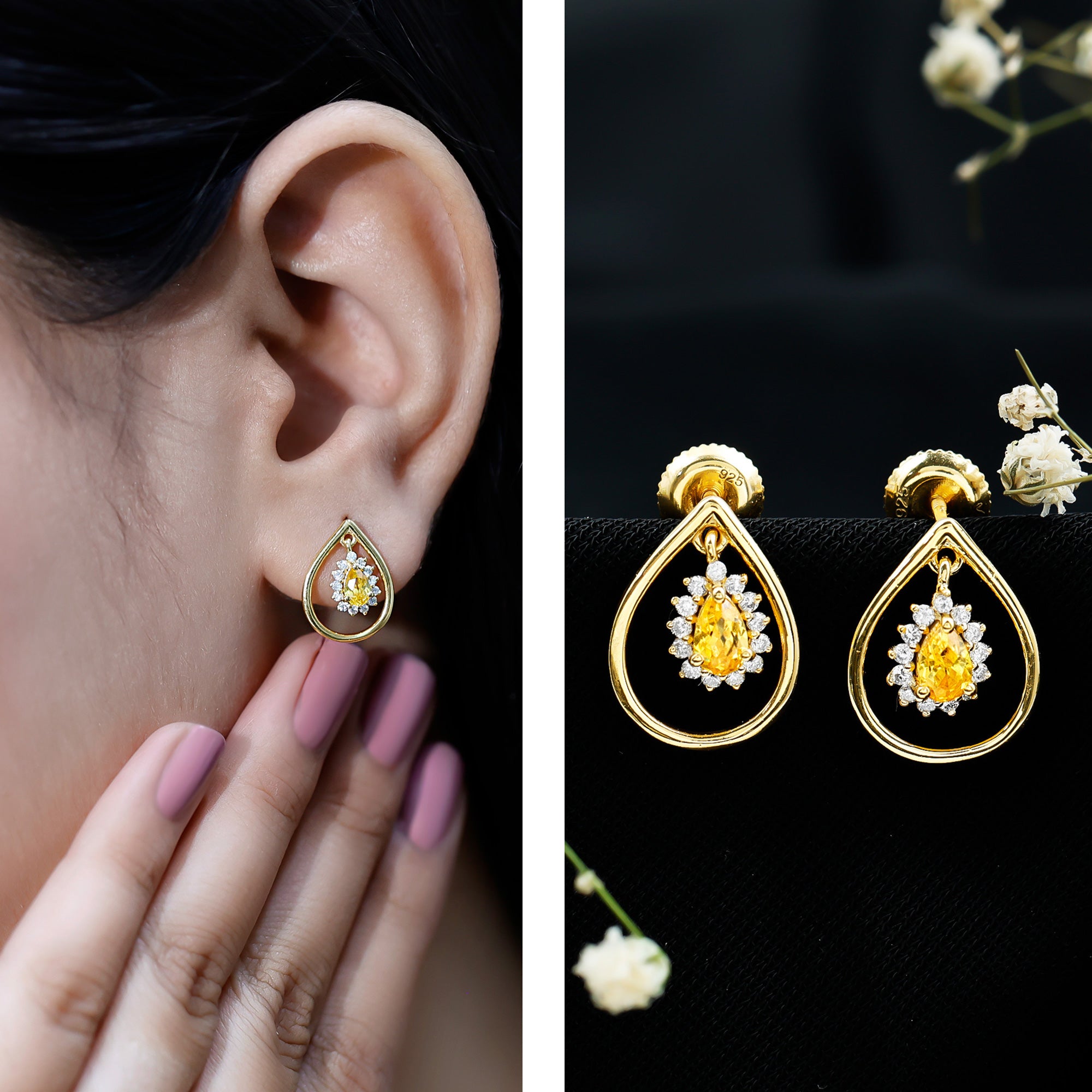 Bring more charm and sunshine to your look with these Teardrop Stud Earrings, a perfect blend of elegance and radiance. Each earring features a stunning 3X5 mm Pear Shape Lab Created Yellow Sapphire at its center in Prong Setting, surrounded by a Halo of sparkling Lab Grown Diamond stones that amplify its golden glow. The gemstones are set within an Open Teardrop frame crafted in Yellow Gold Plated Silver, creating a graceful design that catches the light beautifully from every angle. Secured with Screw Back Closure, these Lab Grown Sapphire Earrings are as comfortable as they are dazzling, making them ideal for everything from casual gatherings to glamorous evenings out. Their warm tones add a cheerful yet sophisticated touch to any outfit, whether paired with a sleek dress or a chic work ensemble. Arriving in a signature jewelry box, these Lab Yellow Sapphire Earrings also make an exquisite gift for birthdays, anniversaries or moments when you simply want to celebrate someone special.