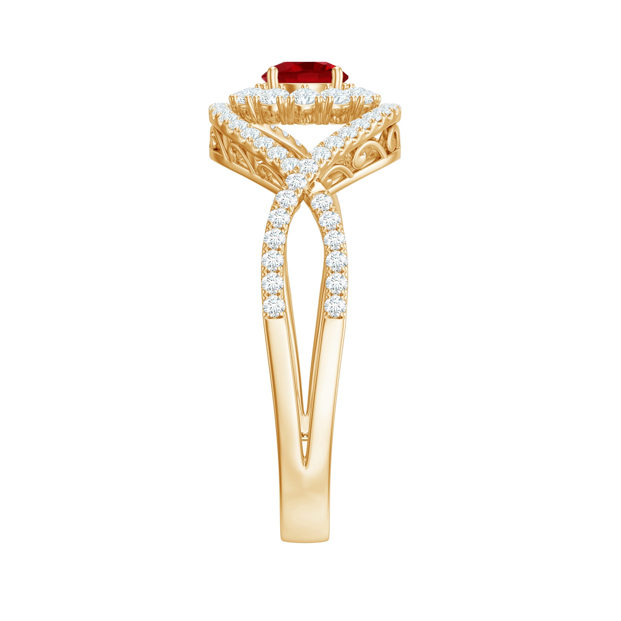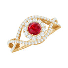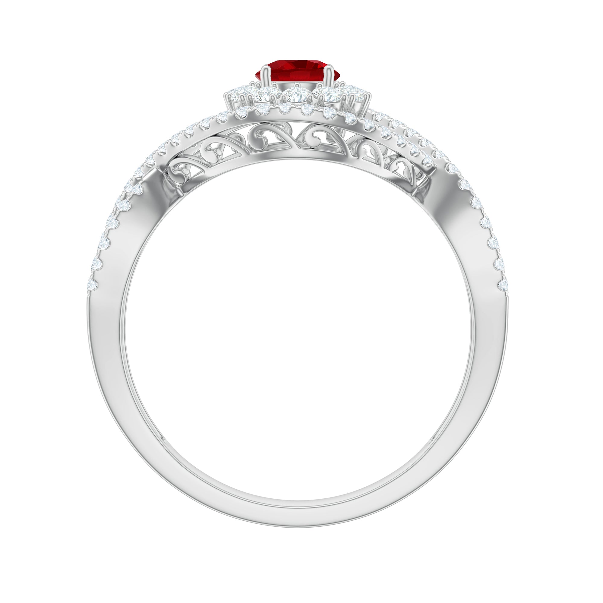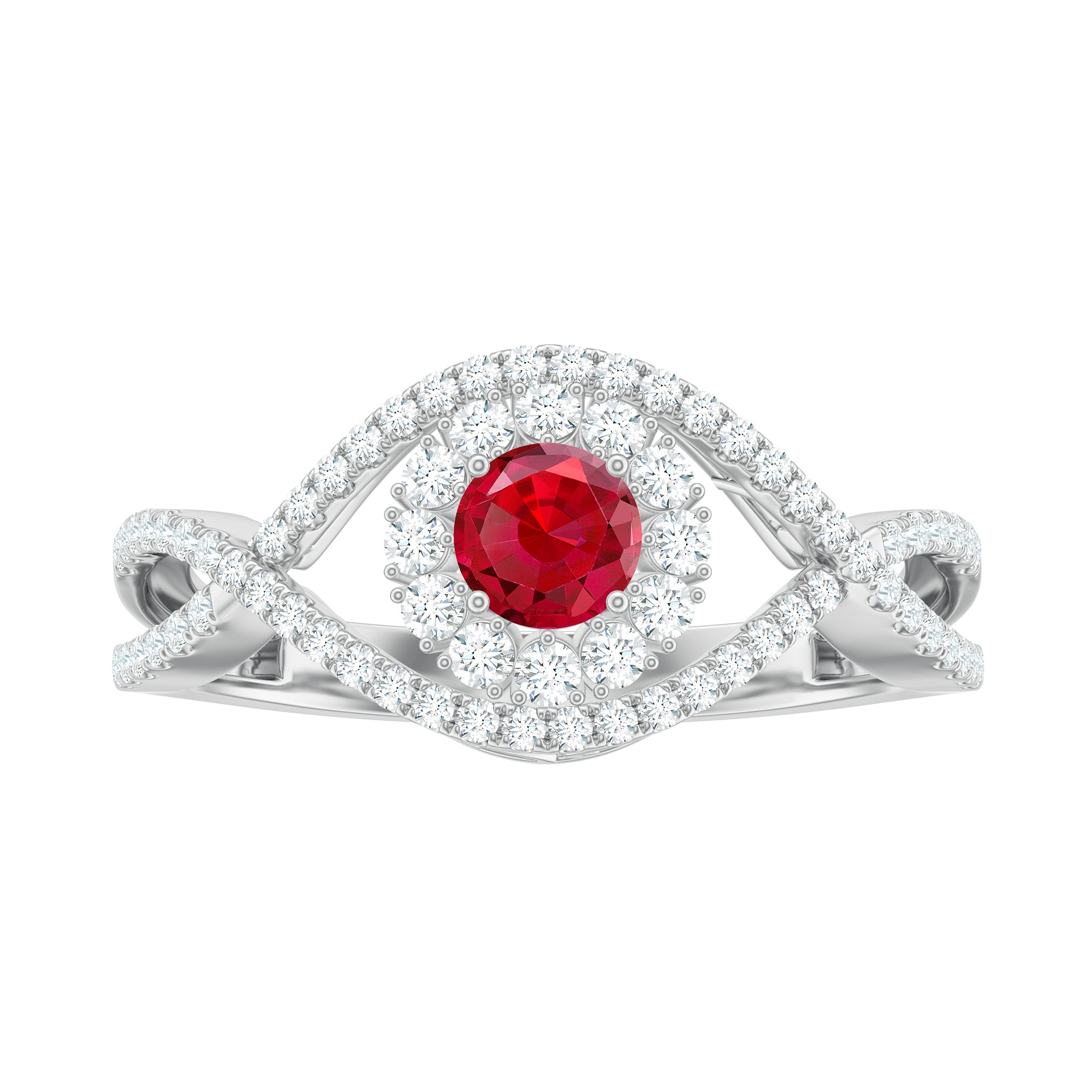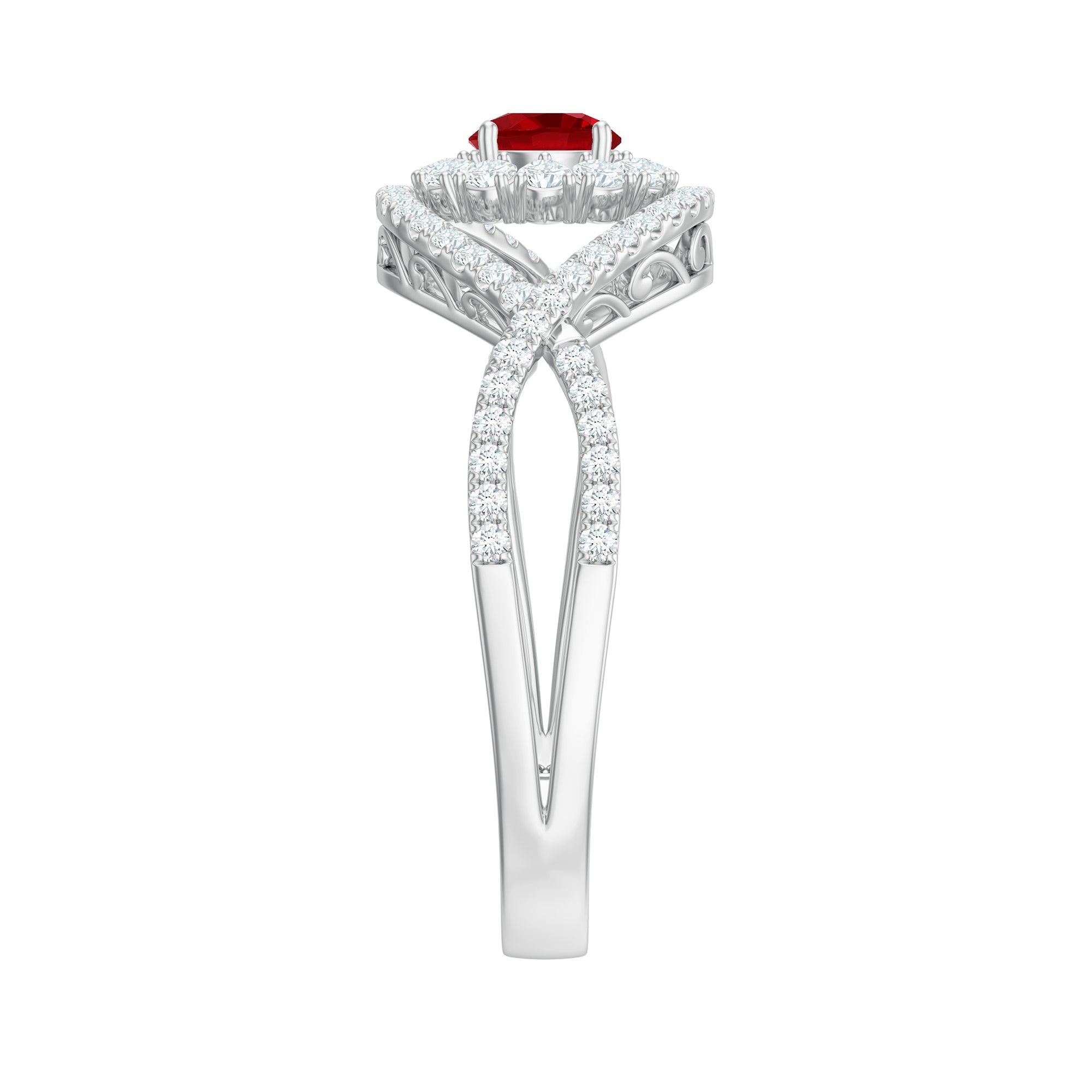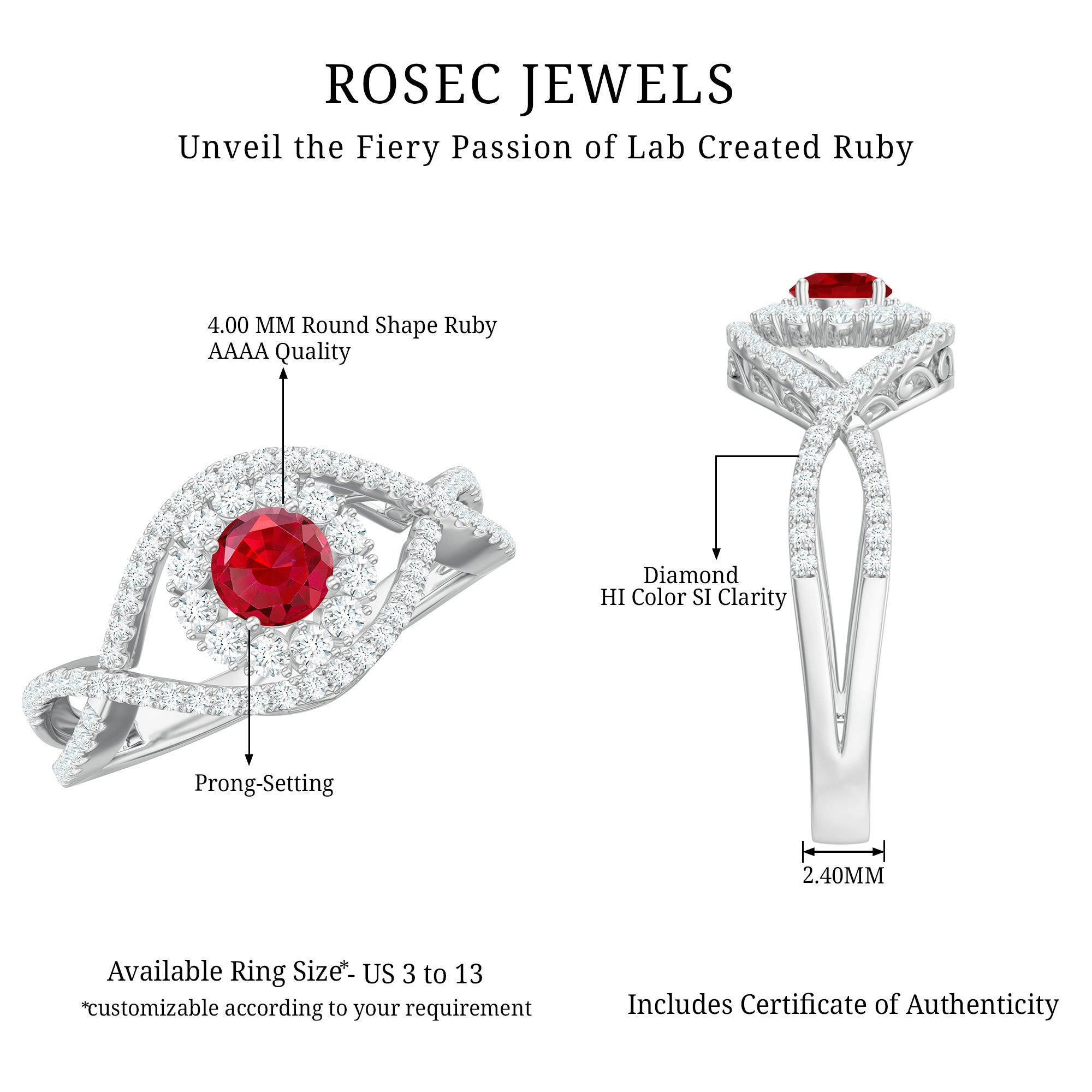 Two paths, one promise, that is the feeling this beautiful Ruby and Diamond Engagement Ring brings to life. Designed to feel both romantic and timeless, it is the kind of piece that tells a story every time you look at it. At the center is a glowing 4 MM round cut lab created ruby, held securely in prong setting. Surrounding the center stone is a halo of sparkling diamonds, adding just the right amount of brilliance to highlight the ruby without stealing its spotlight. What makes this Ruby and Diamond Ring even more special is the crossover shank design, two bands that gently twist together like two lives coming together as one. The band is finished with more round diamonds along the twist, giving the Crossover Ring extra sparkle from every angle. Made for someone who loves elegant styles with a modern twist, this Criss Cross Engagement Ring is full of charm and grace. Every detail, from the contrasting stones to the crossover band, is crafted with care and quality. It is beautiful, meaningful, and easy to wear every day, ready to become part of your love story, today and always.