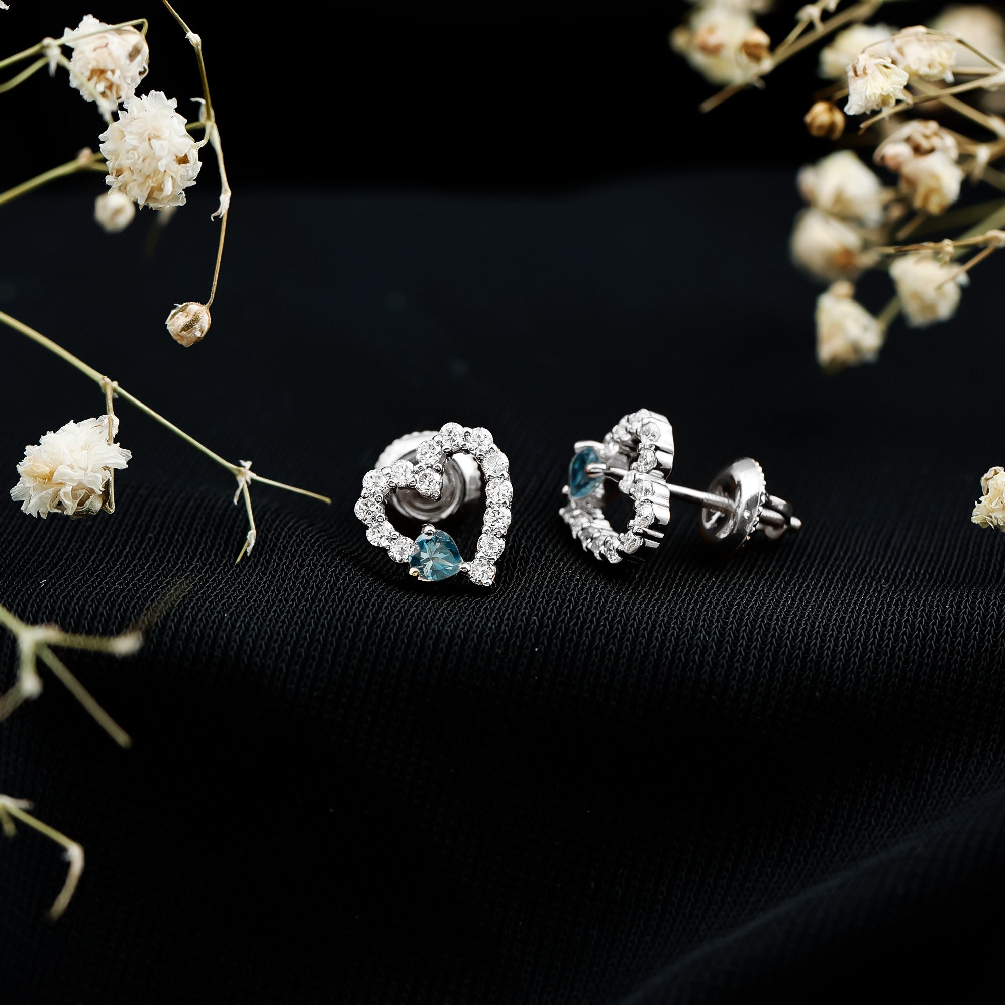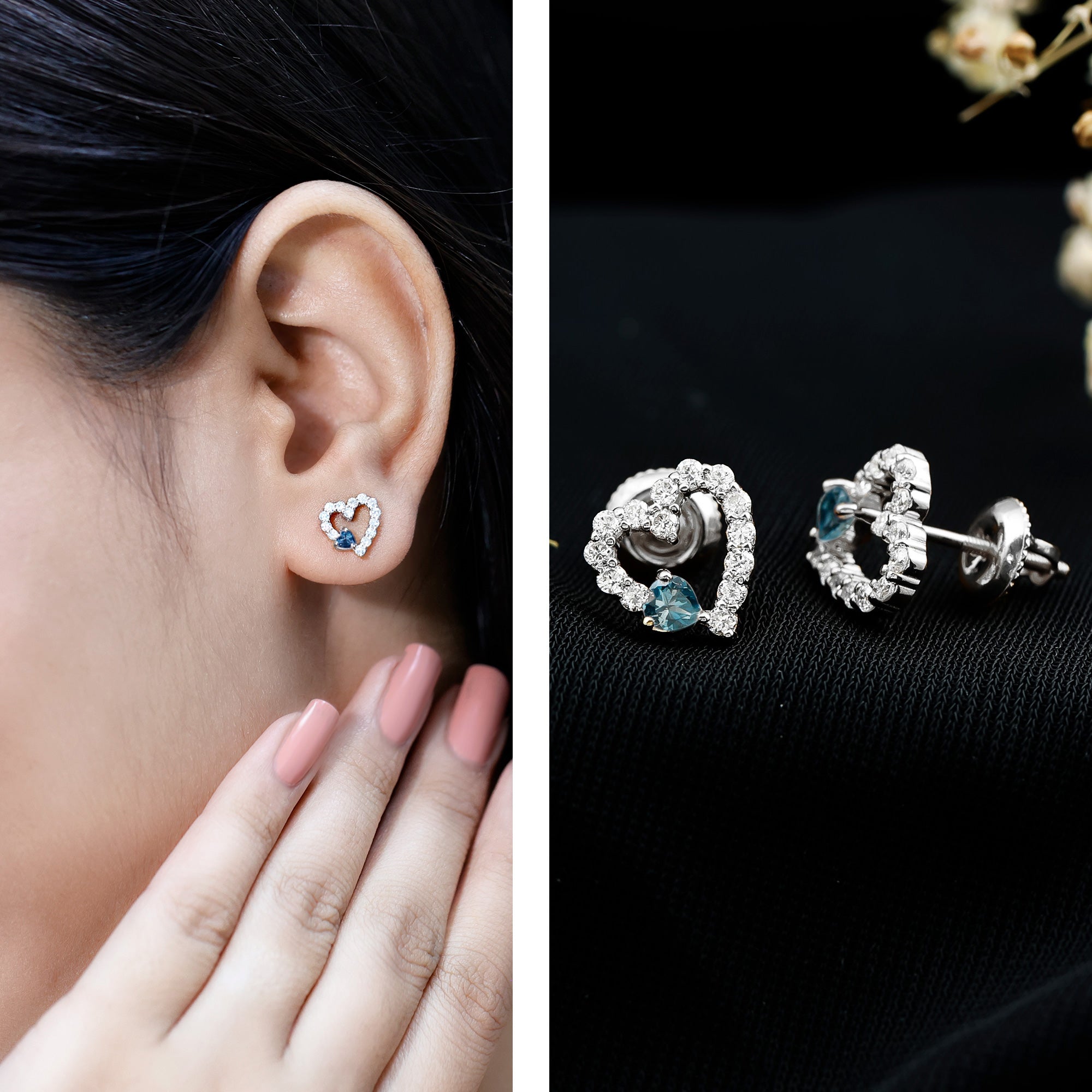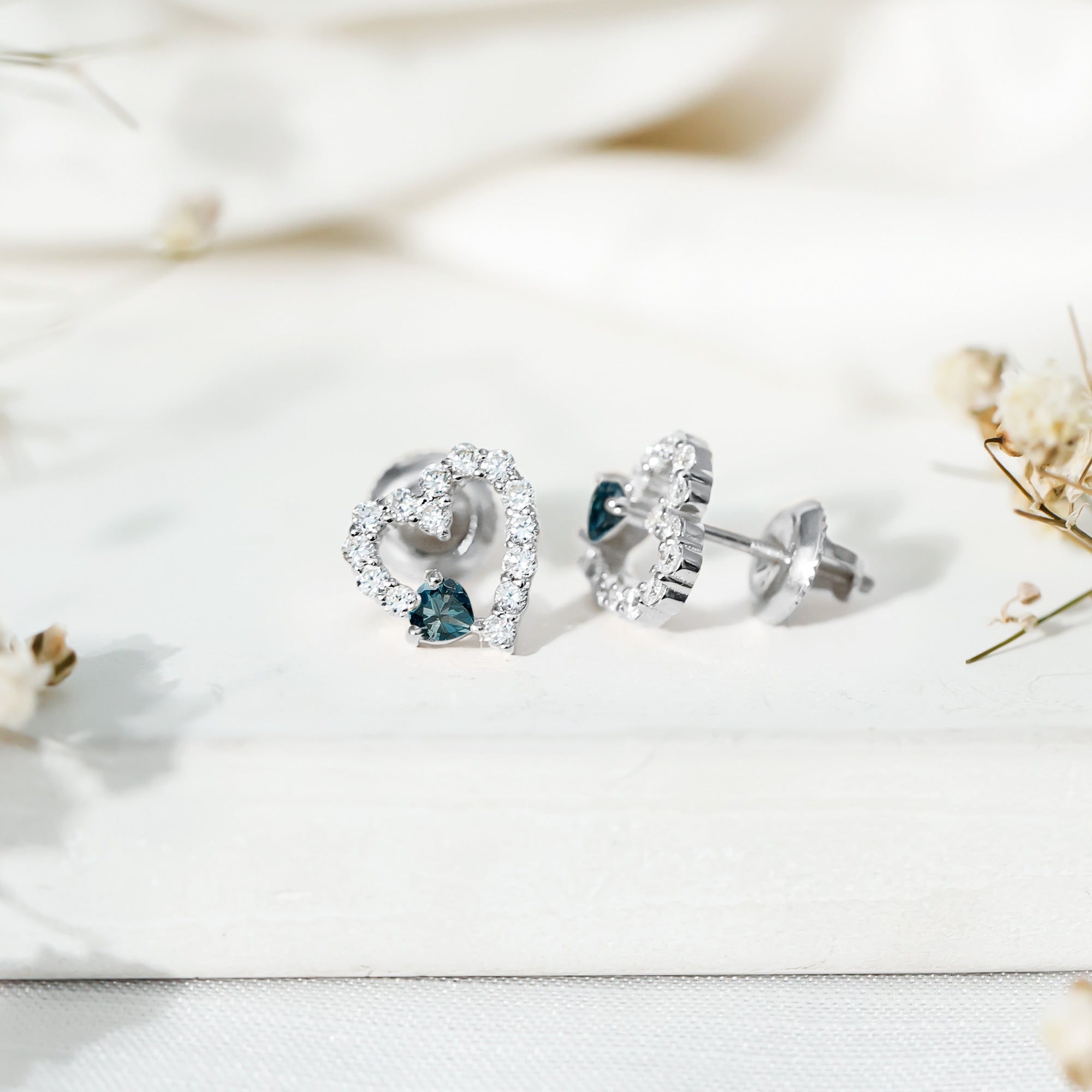 Designed to feel close and personal, these London Blue Topaz Earrings bring together thoughtful details and everyday wearability. Made in 14k white gold plated silver, these delicate Topaz Stud Earrings are styled with a romantic touch. At the center sits a 3 MM heart shaped London Blue Topaz, held securely in prong setting that lets the shape shine through. To make the design even more special, the open heart is gently accented with round lab created diamonds, placed with care to catch the light at every angle. Whether you are heading to work or dressing up for dinner, these Blue Topaz and Diamond Earrings are easy to wear and hard to overlook. They come with screw back closures for a snug and secure fit, so you can wear them all day with comfort and confidence. Crafted with AAA quality London Blue Topaz and EF-VS quality lab grown diamonds, these Heart Earrings blend fine craftsmanship with emotional charm. Add them to your jewelry box and wear them as a symbol of your unique story, simple, elegant, and full of heart.