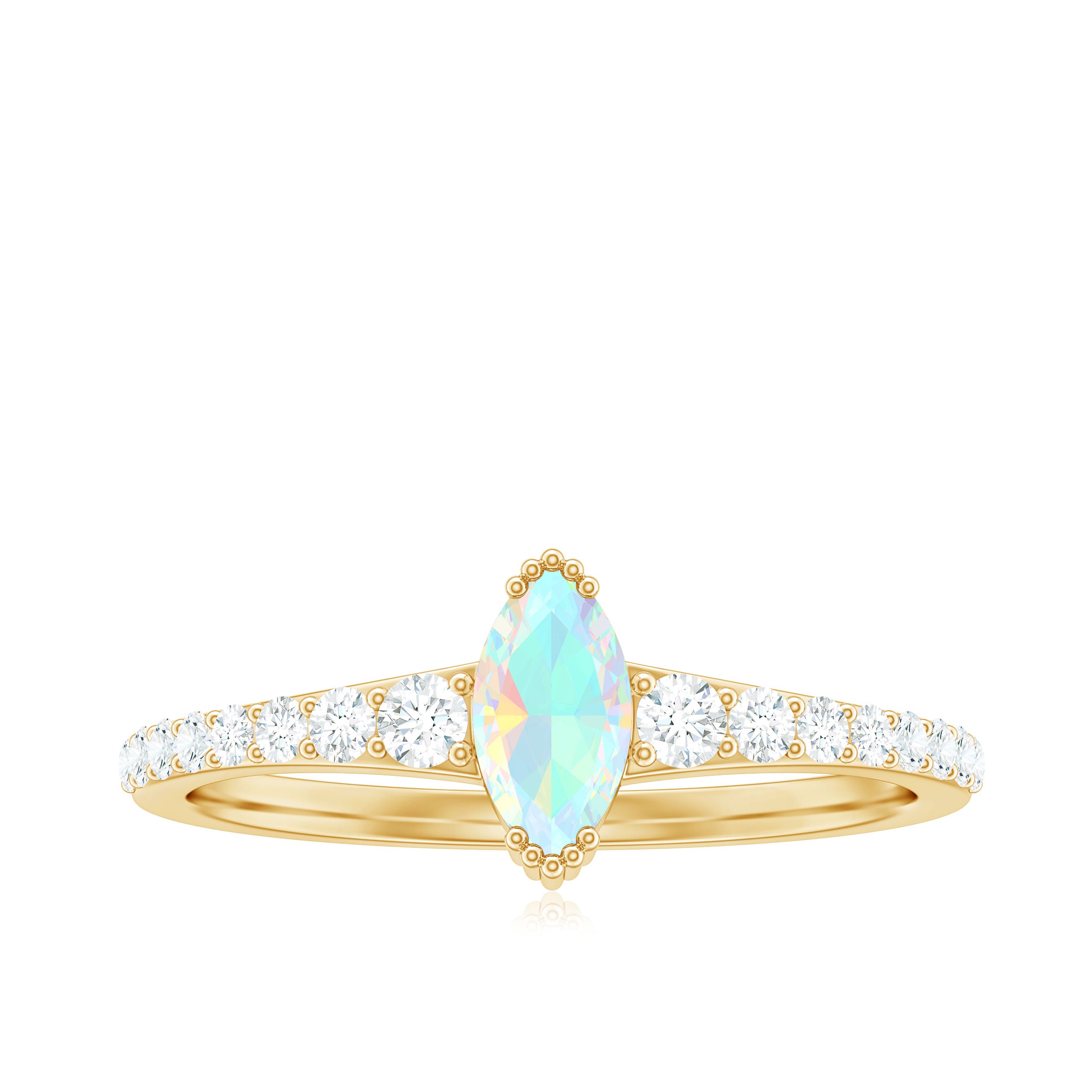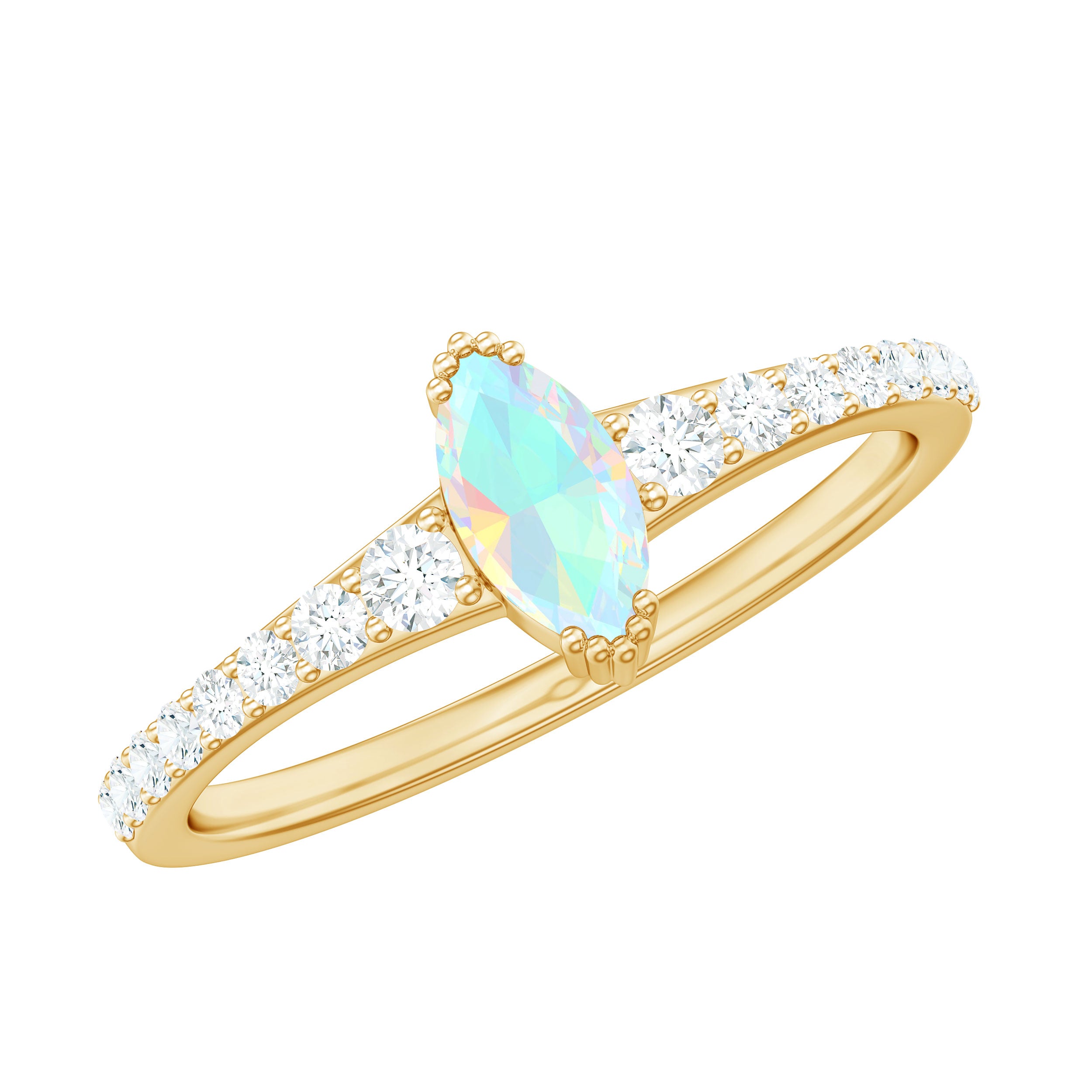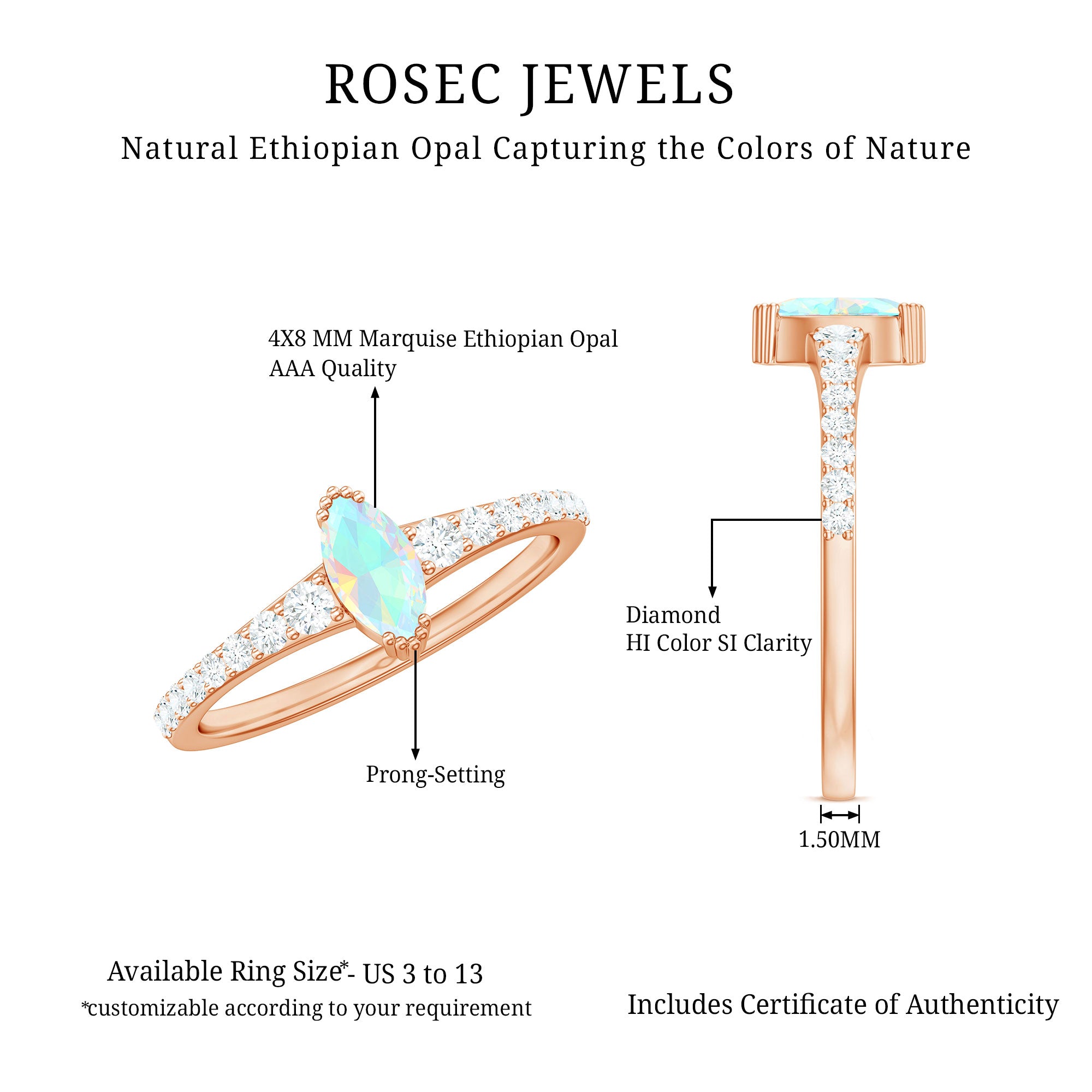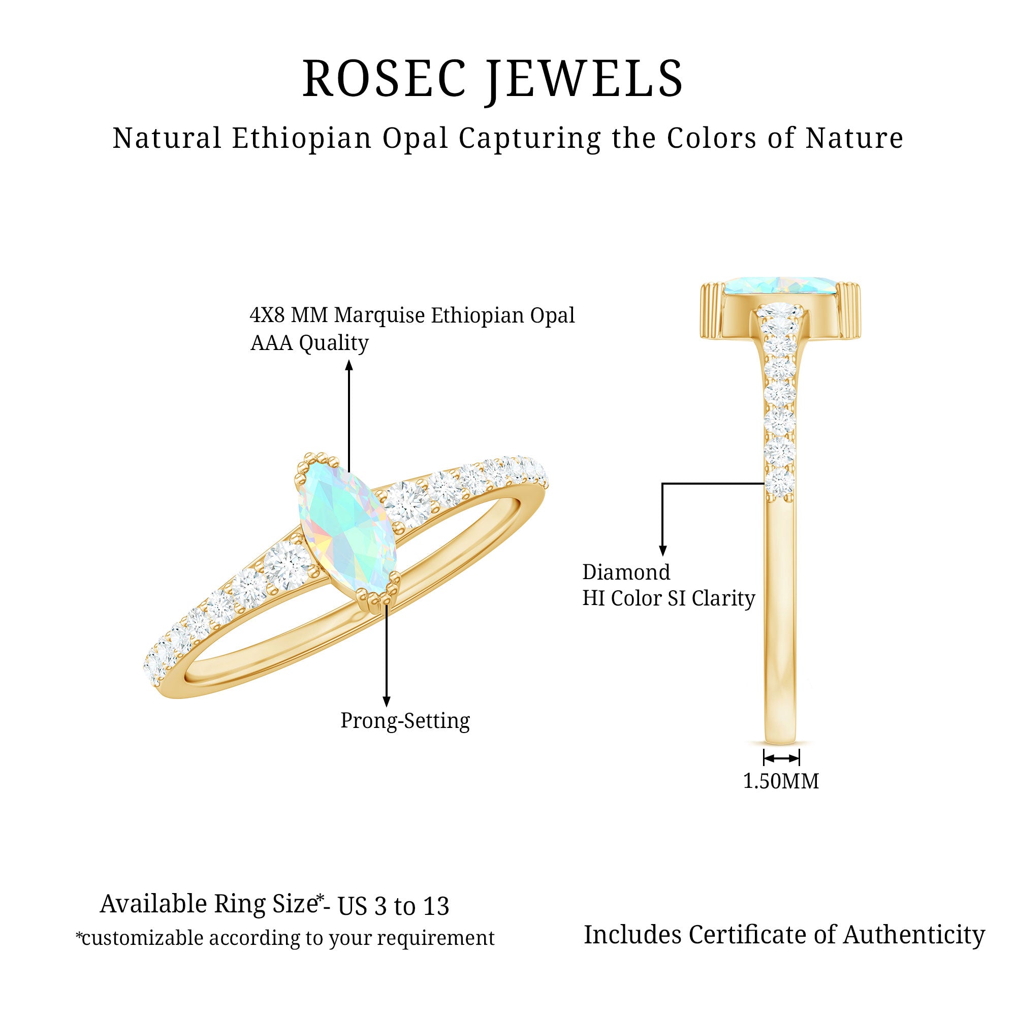 Make a promise that sparkles with meaning through this enchanting Ethiopian Opal Promise Ring, an elegant expression of love, hope and new beginnings. The centerpiece, a 4X8 mm Marquise Shape Ethiopian Opal, radiates with rainbow hues, shifting beautifully with every movement to reflect the journey of your relationship. Framing this luminous opal are dazzling Diamond side stones, adding just the right amount of brilliance and contrast to elevate the natural magic of opal. The slender band adds a refined touch, creating a look that is both delicate and captivating. Whether it is a symbol of a growing bond or a meaningful gift for someone who holds your heart, this Promise Engagement Ring is the perfect way to say I am yours. Thoughtfully designed for daily wear yet special enough to turn heads, this Marquise Opal Ring blends simplicity with a hint of luxury. Available in various ring sizes and packaged in an elegant jewelry box, this Opal Diamond Ring is ready to surprise and delight on any occasion.