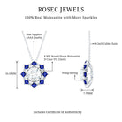 This Lab Grown Blue Sapphire Pendant is precisely crafted with 14K White Gold Plated Silver. The pendant features an 8 MM Round Shape Moissanite surrounded by smaller Round Shape Moissanite and Lab Created Sapphire. This Halo Pendant beholds the classic shine of D-VS1 Quality Moissanite and AAAA Quality Synthetic Sapphire securely placed in Prong Setting. This can be styled with a wedding outfit. This Designer Pendant is accentuated with a hidden bail and comes with a premium quality velvet pouch with the certificate of authenticity.