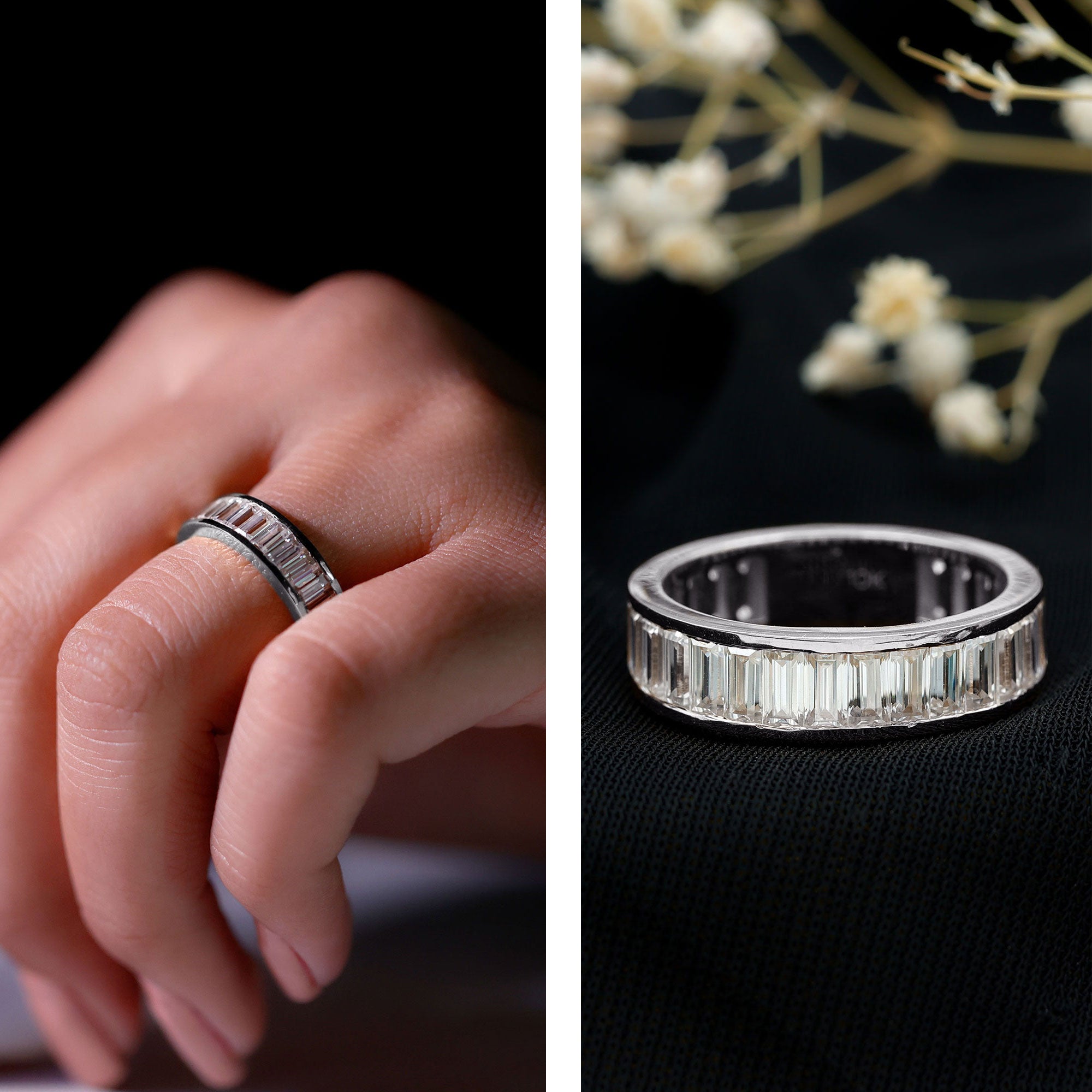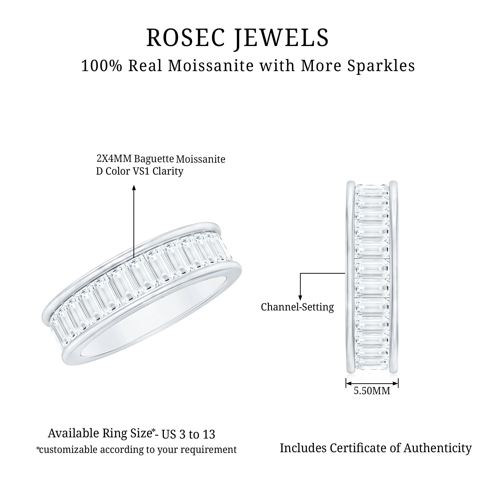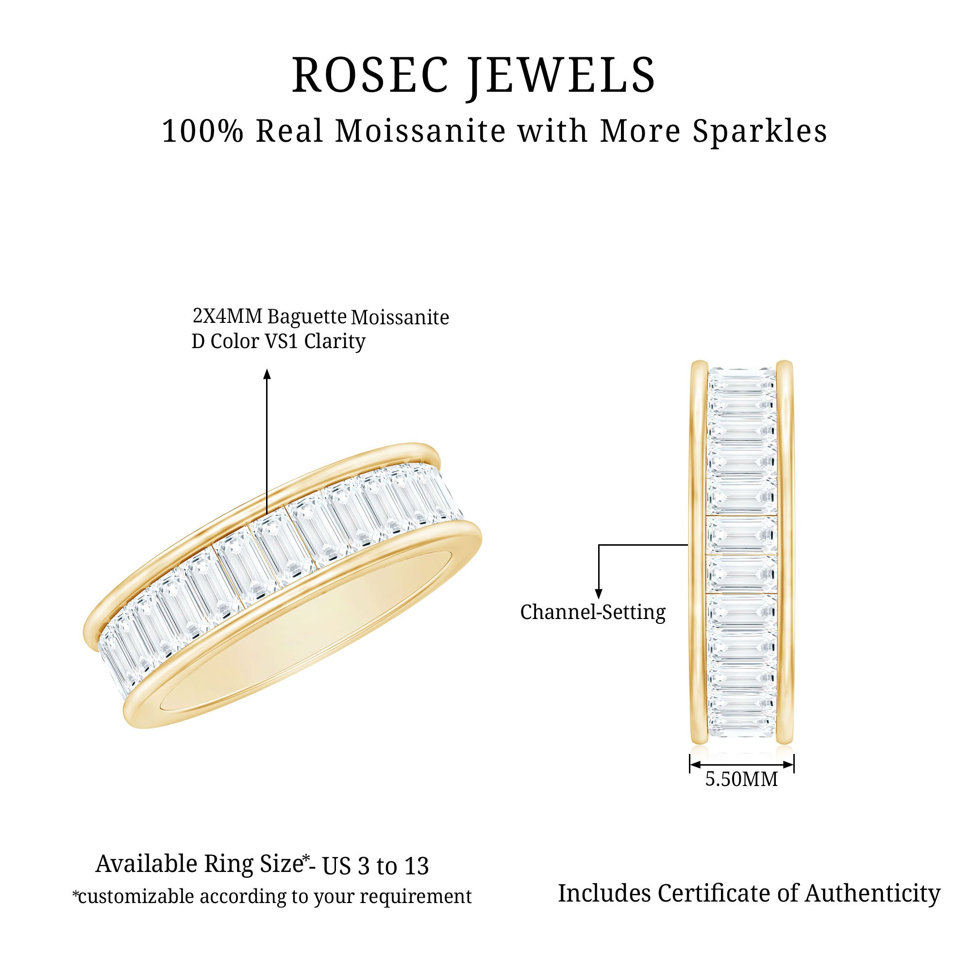 Elegantly designed, this Moissanite Band Ring is accented with Baguette Cut Moissanite securely placed in Channel Setting on a wide band. Perfect for any occasion, this ring is a trendy jewelry accessory. This Baguette Wedding Band is designed with elegance which creates an everlasting trail of the gemstone. The Ring dazzles with D-VS1 Quality Moissanites which symbolizes the unbreakable bond. This Wide Band Ring will be delivered to you in the premium quality packaging.