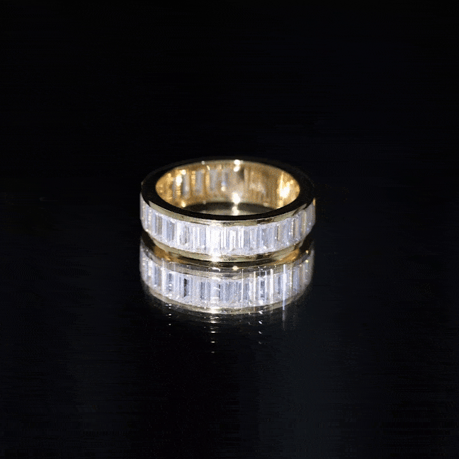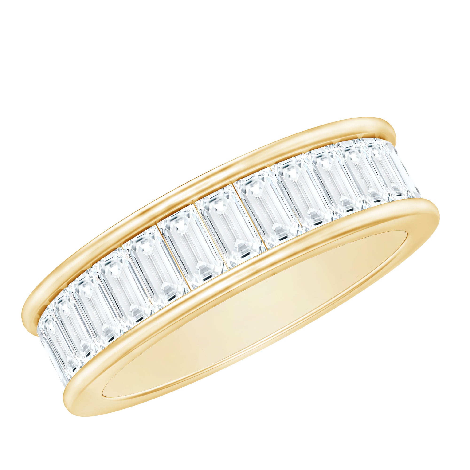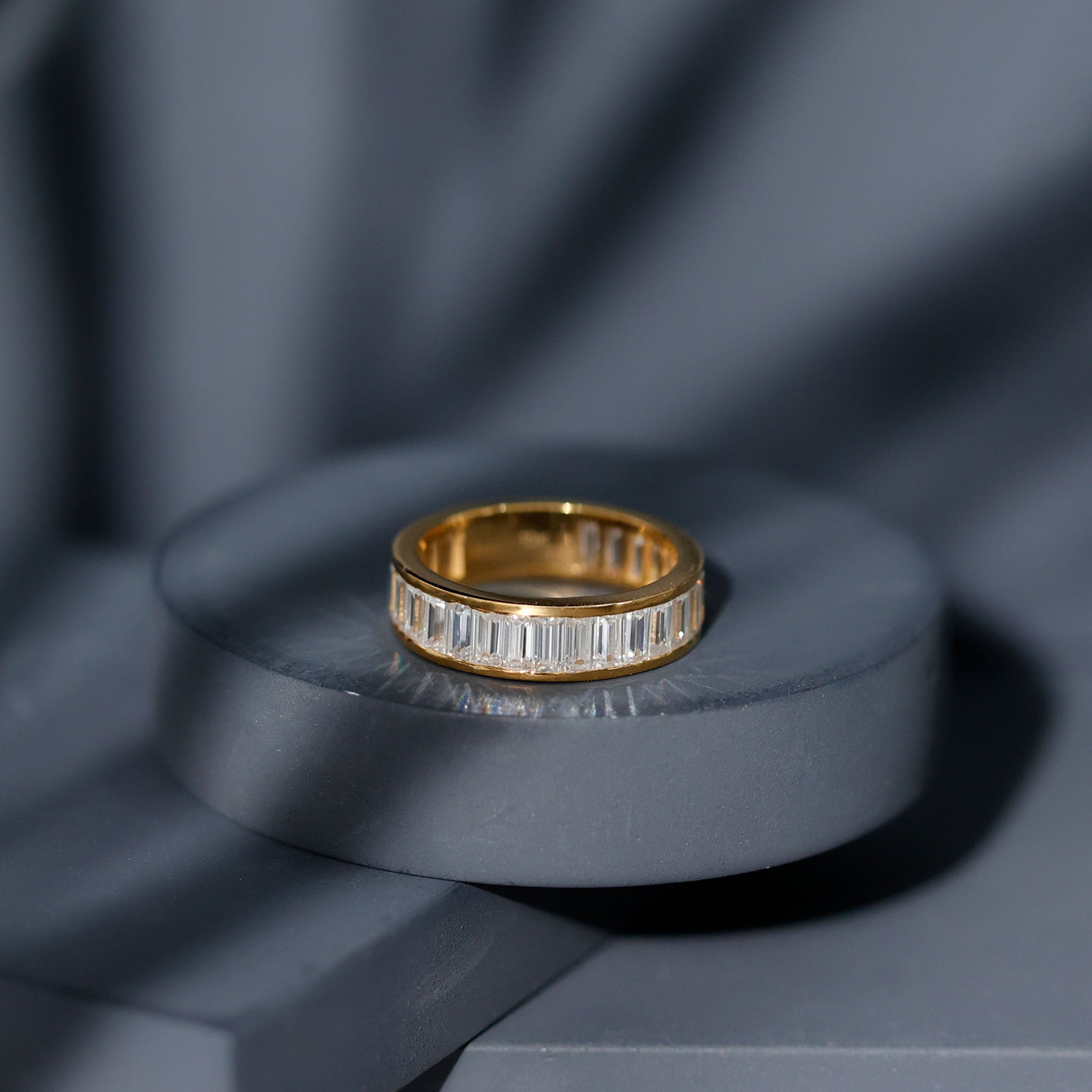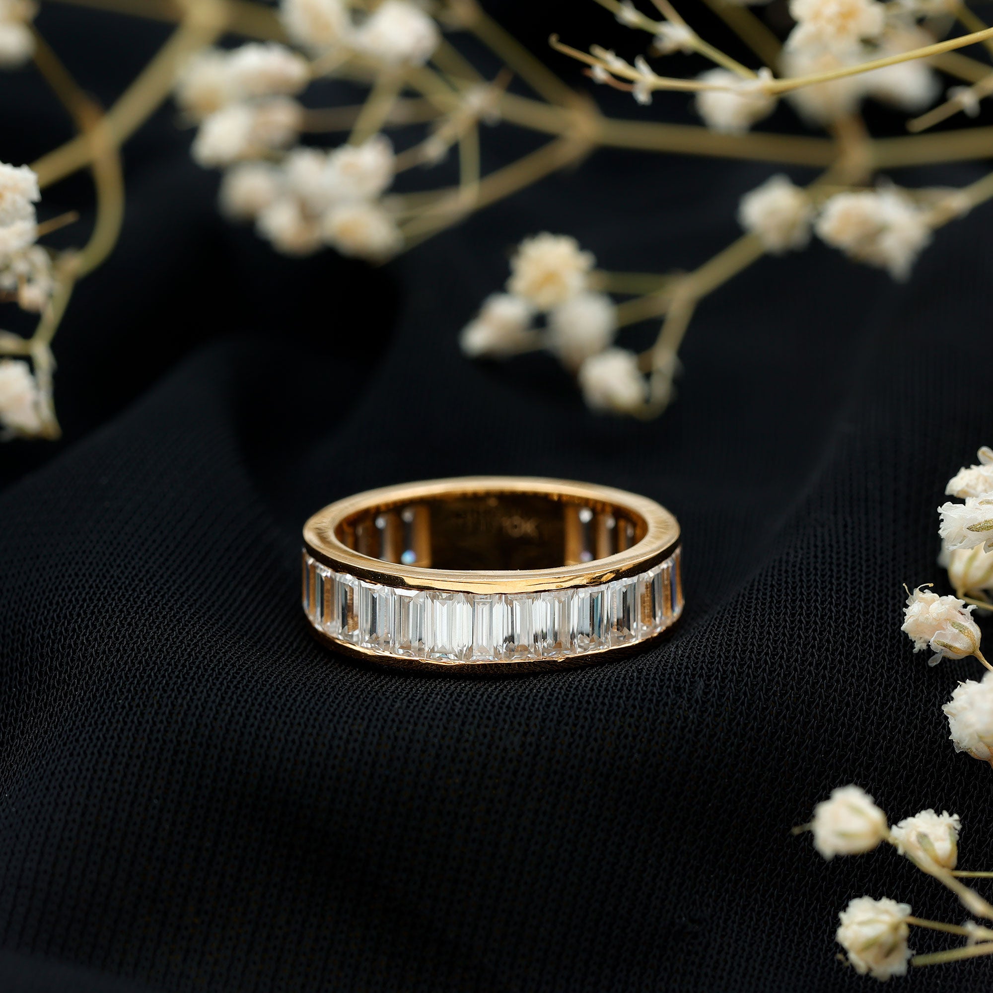 Elegantly designed, this Moissanite Band Ring is accented with Baguette Cut Moissanite securely placed in Channel Setting on a wide band. Perfect for any occasion, this ring is a trendy jewelry accessory. This Baguette Wedding Band is designed with elegance which creates an everlasting trail of the gemstone. The Ring dazzles with D-VS1 Quality Moissanites which symbolizes the unbreakable bond. This Wide Band Ring will be delivered to you in the premium quality packaging.
