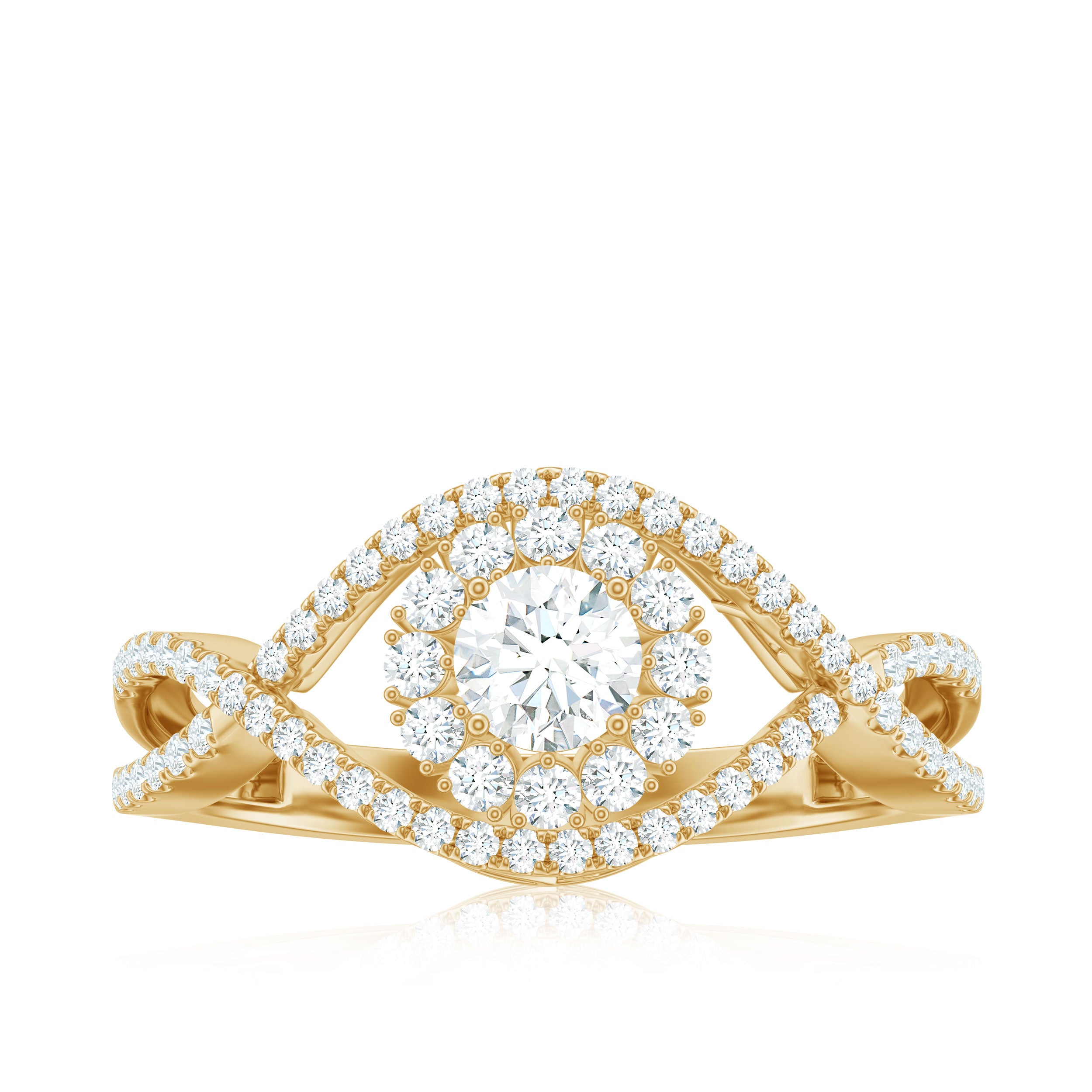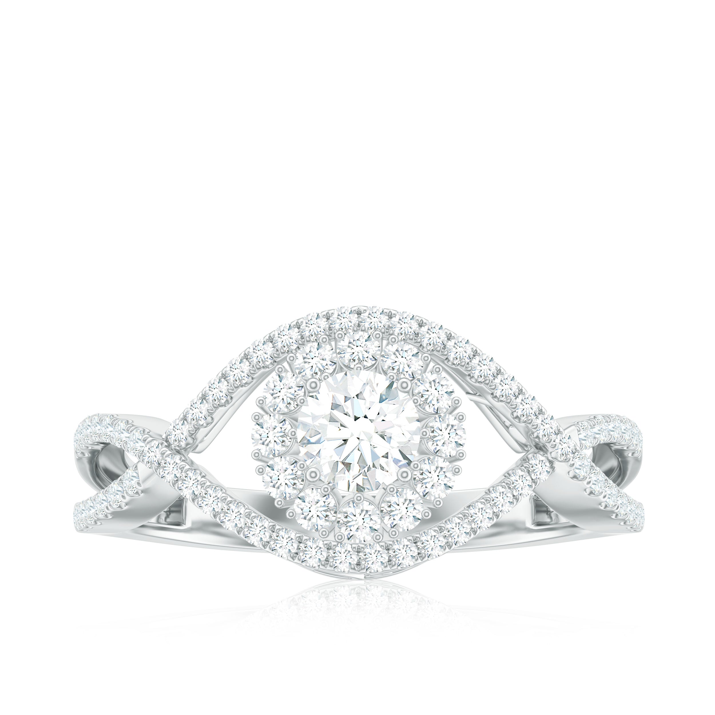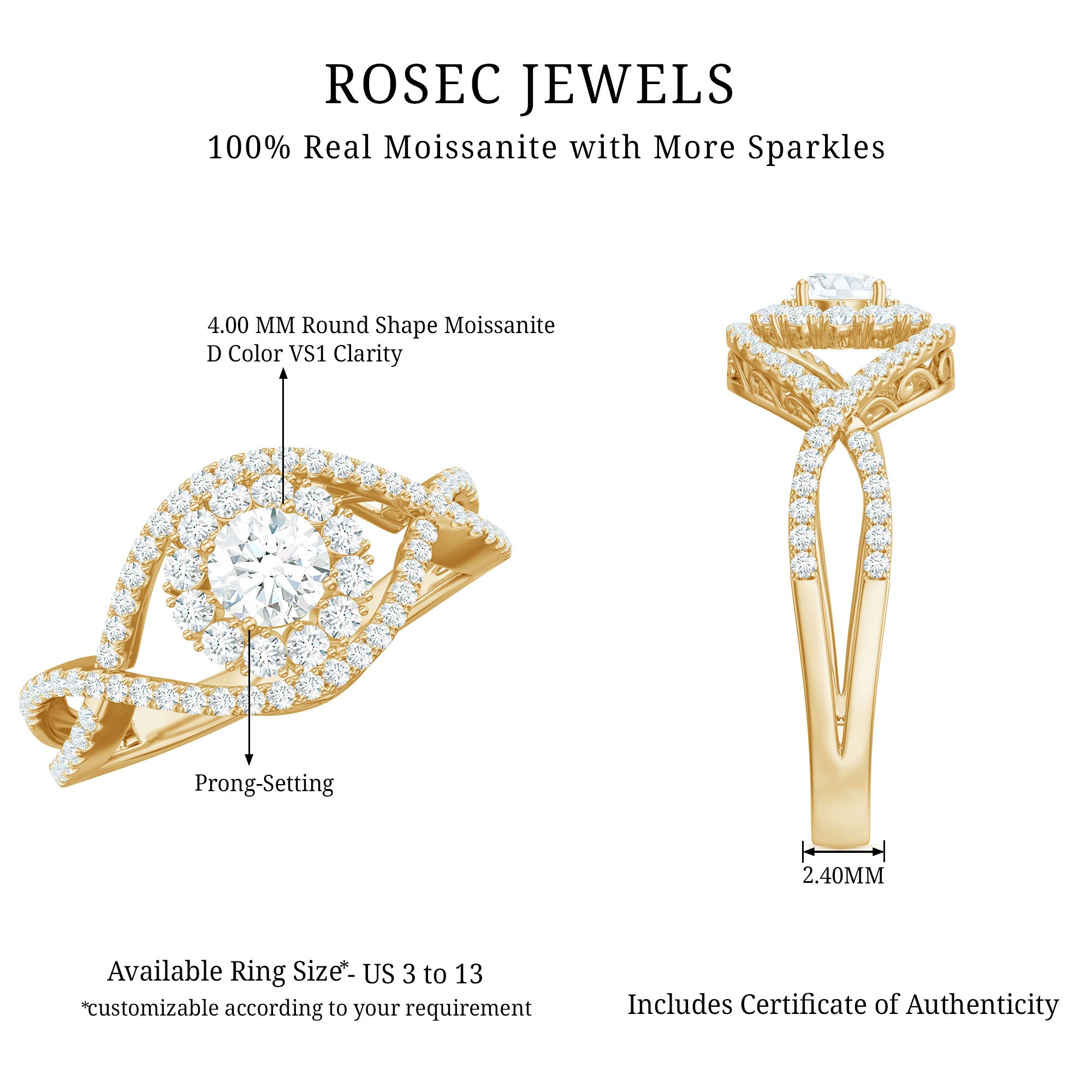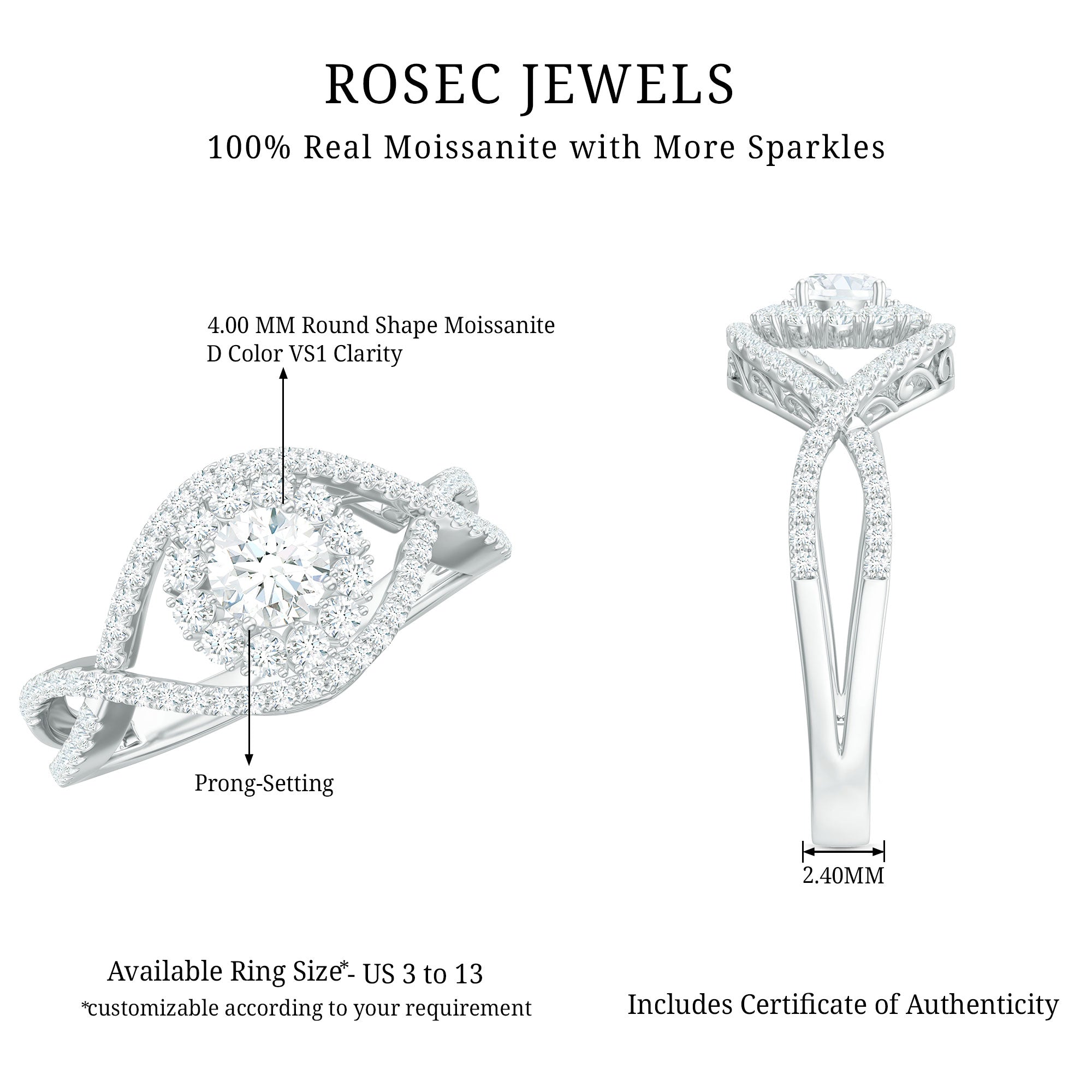 Embrace your uniqueness with this Halo Moissanite Engagement Ring, a stunning homage to modern love and classic sophistication. Crafted for the woman who values her individuality, this Criss Cross Engagement Ring merges unique design with significant symbolism, making it an ideal expression of your everlasting affection. At the heart of this enchanting piece is a 4 MM round cut moissanite, held securely in prong setting. A halo of small round moissanites surrounds the center stone, boosting its brilliance and providing a radiant shine that captures attention from all angles. The highlight of this Crossover Engagement Ring is its infinity shank, a beautifully designed feature adorned with sparkling moissanite accents that glimmer with every move. The band symbolizes the intertwining of two lives, embodying unity, balance, and the beauty of a shared path. Meticulously handcrafted and set with D-VS1 quality moissanites, this Round Engagement Ring guarantees maximum sparkle with ethical luxury. Its delicate yet bold design is perfect for the bride-to-be who loves both tradition and modern style. Delivered in an elegant jewelry box, this Halo Engagement Ring is all set to illuminate your forever moment.