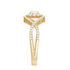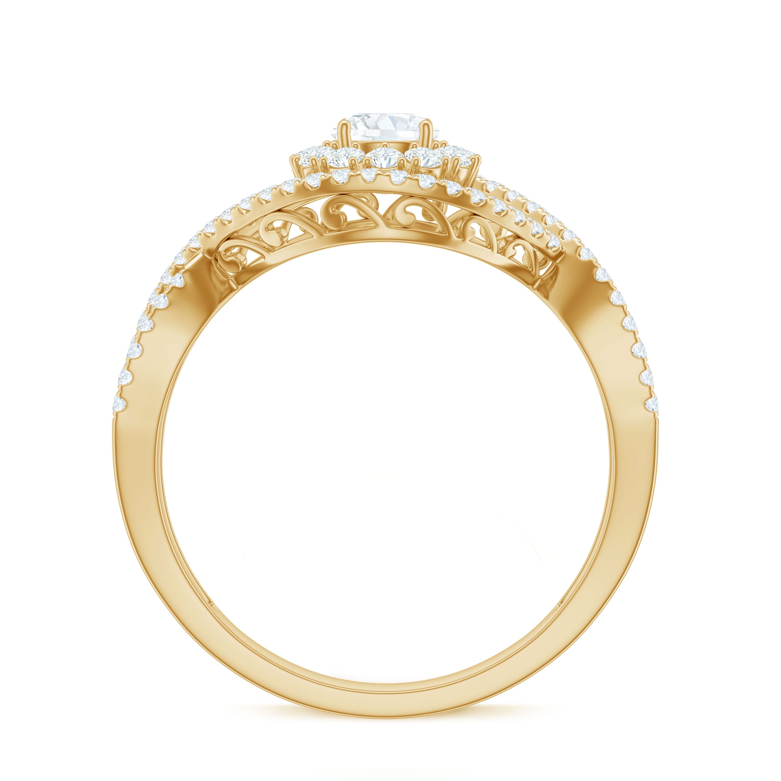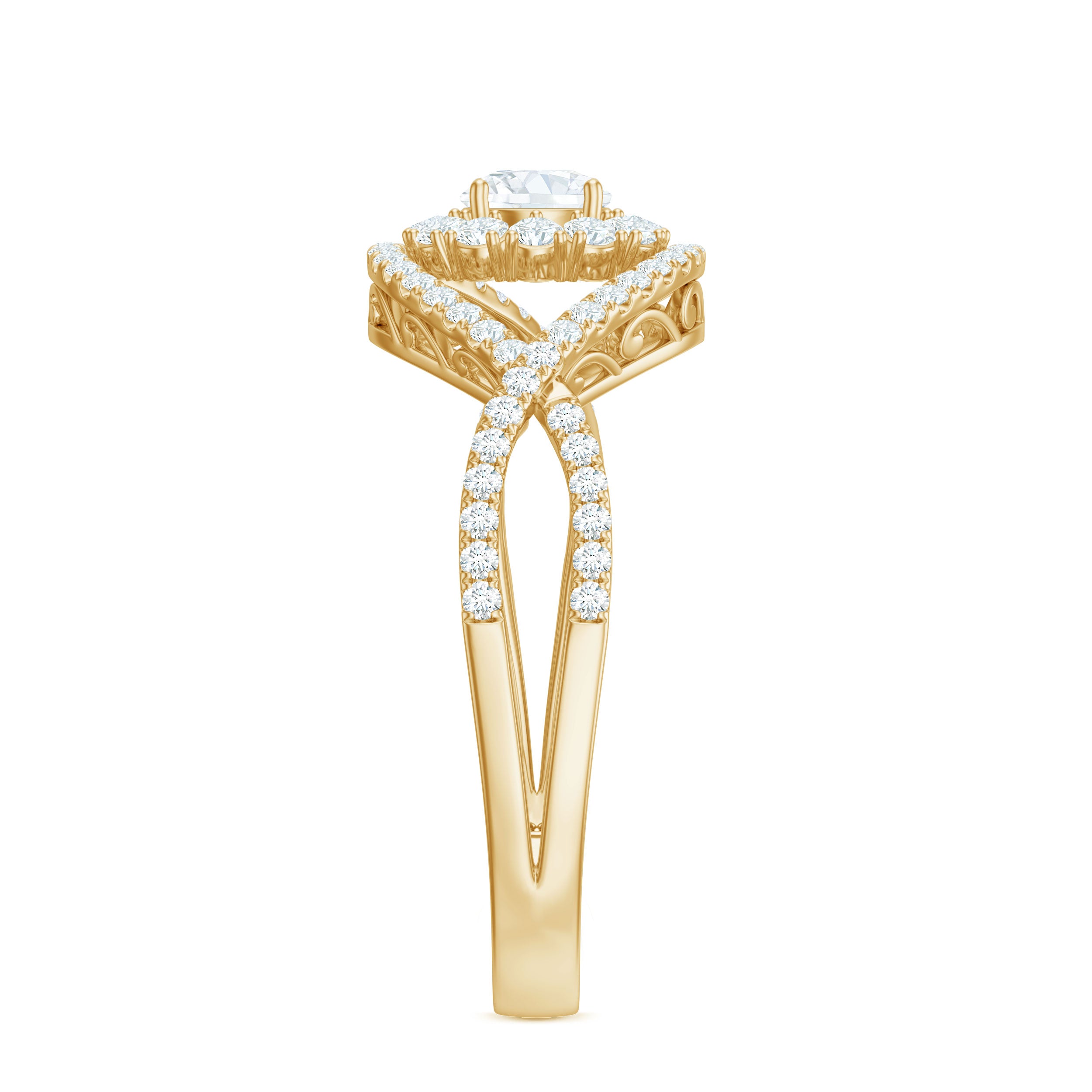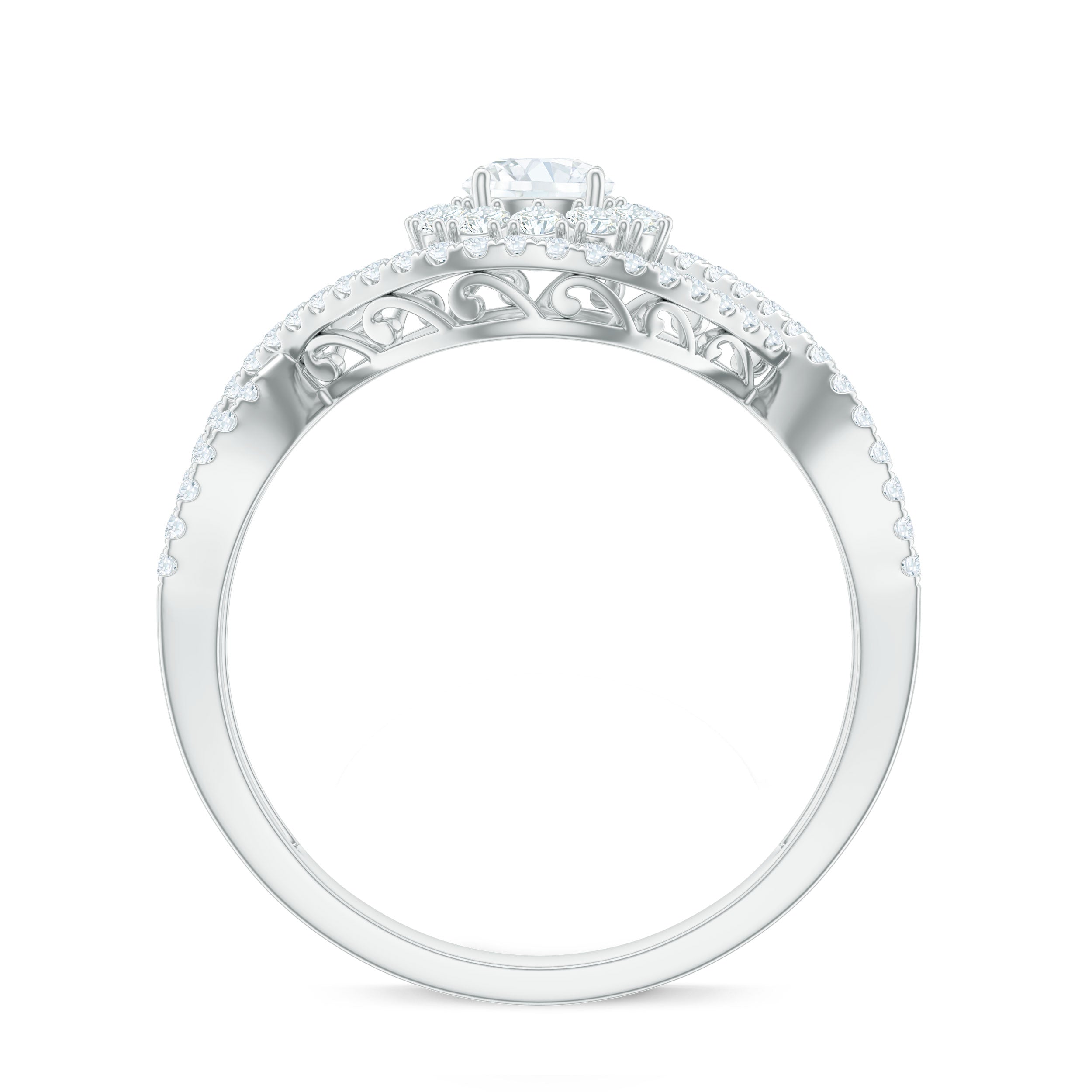 Embrace your uniqueness with this Halo Moissanite Engagement Ring, a stunning homage to modern love and classic sophistication. Crafted for the woman who values her individuality, this Criss Cross Engagement Ring merges unique design with significant symbolism, making it an ideal expression of your everlasting affection. At the heart of this enchanting piece is a 4 MM round cut moissanite, held securely in prong setting. A halo of small round moissanites surrounds the center stone, boosting its brilliance and providing a radiant shine that captures attention from all angles. The highlight of this Crossover Engagement Ring is its infinity shank, a beautifully designed feature adorned with sparkling moissanite accents that glimmer with every move. The band symbolizes the intertwining of two lives, embodying unity, balance, and the beauty of a shared path. Meticulously handcrafted and set with D-VS1 quality moissanites, this Round Engagement Ring guarantees maximum sparkle with ethical luxury. Its delicate yet bold design is perfect for the bride-to-be who loves both tradition and modern style. Delivered in an elegant jewelry box, this Halo Engagement Ring is all set to illuminate your forever moment.