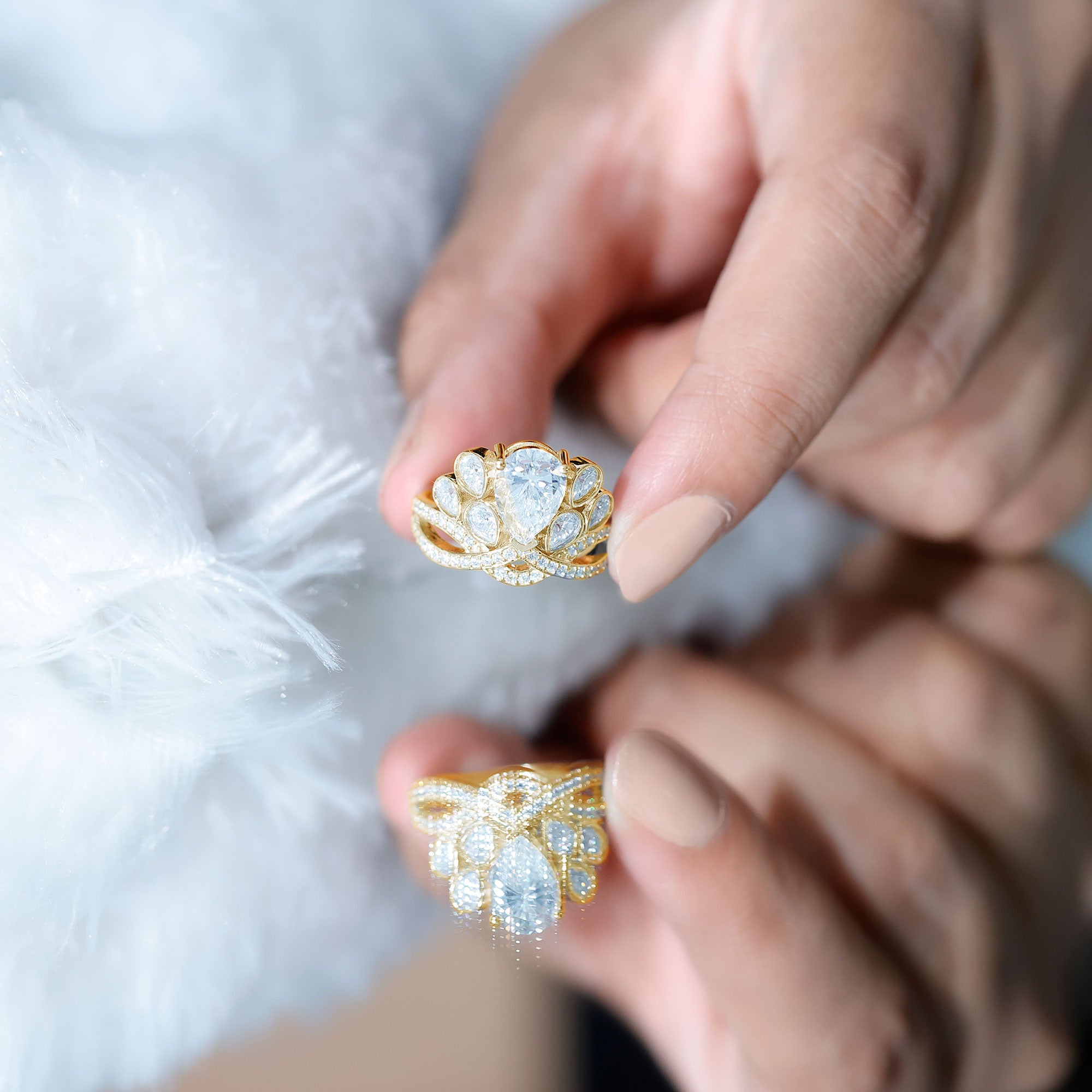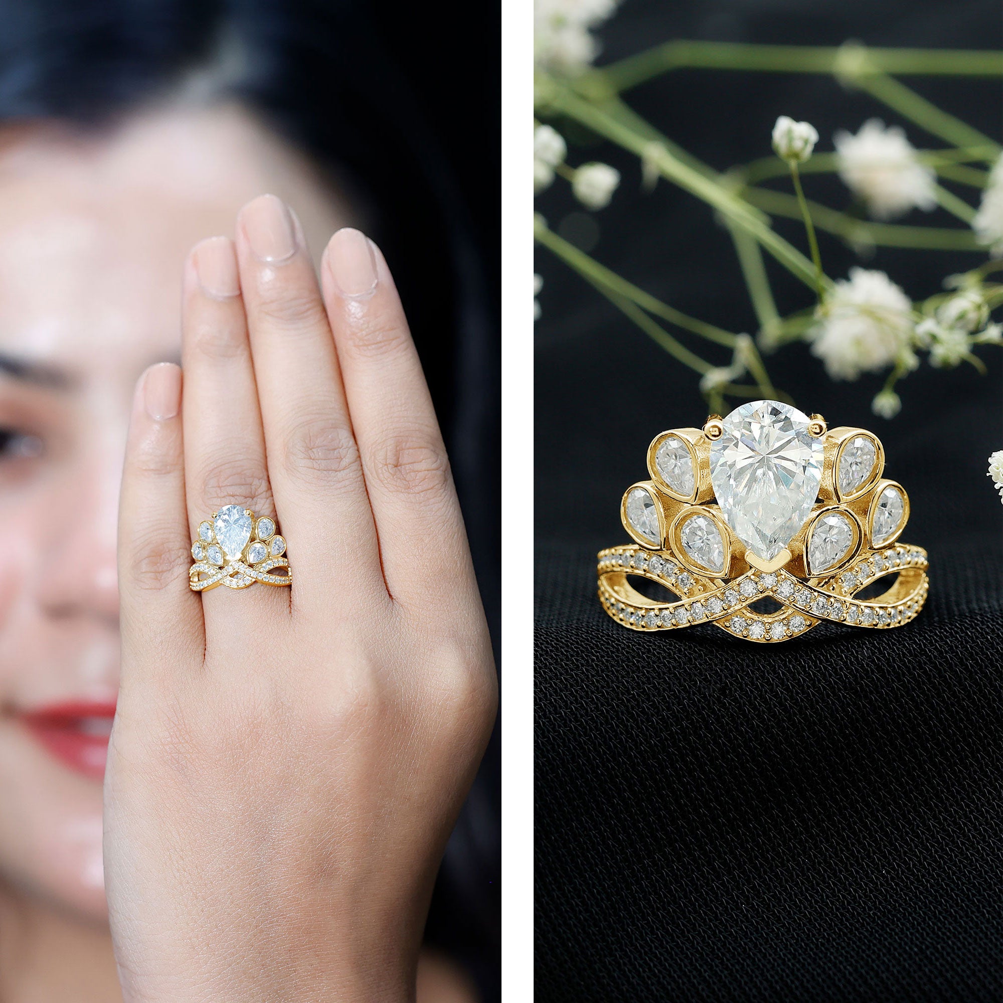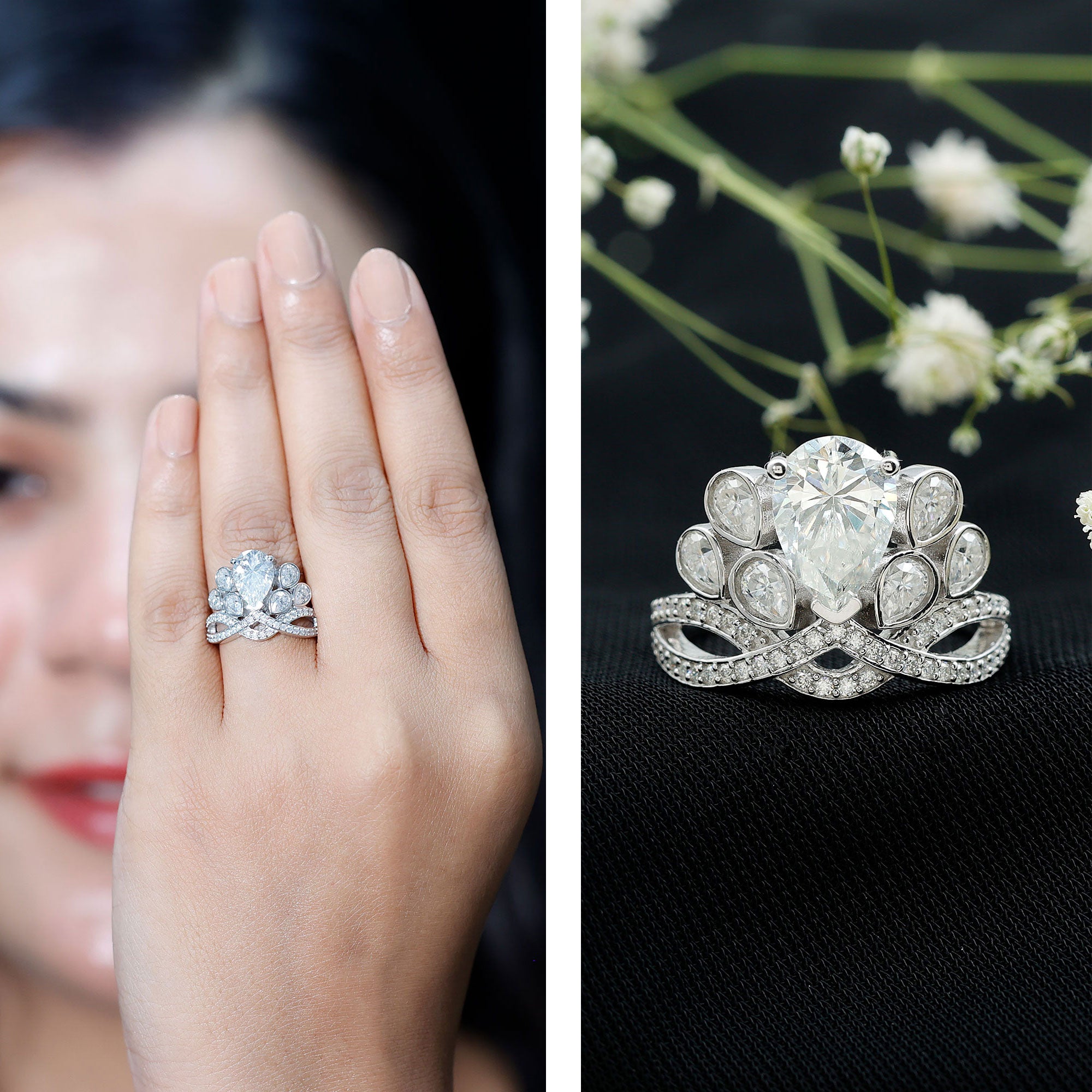 Nothing can make her feel like a queen the way this breathtaking Princess Crown Engagement Ring does. A masterpiece that brings royalty to your fingertips. Inspired by the elegance of a royal crown, this Designer Ring is the perfect blend of regal beauty and modern brilliance. Features a 7X10 MM pear shaped moissanite stone in the center set in secure prong setting. Accented by smaller bezel set pear cut Moissanite stones, mimicking the delicate arches of a tiara. The design flows into a beautifully detailed band, featuring a crisscross pattern studded with round cut Moissanites. The intricate craftsmanship and layered structure create a unique visual, giving the illusion of a finely sculpted crown resting on your finger. This Moissanite Engagement Ring for Women symbolizes commitment and celebrates a love that is grand, elegant, and everlasting. Celebrate your every occasion, whether it is an Engagement, Wedding, Anniversary, Cocktail Party or Birthday with our one-of-a-kind Chunky Ring.