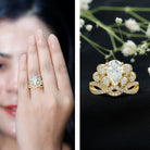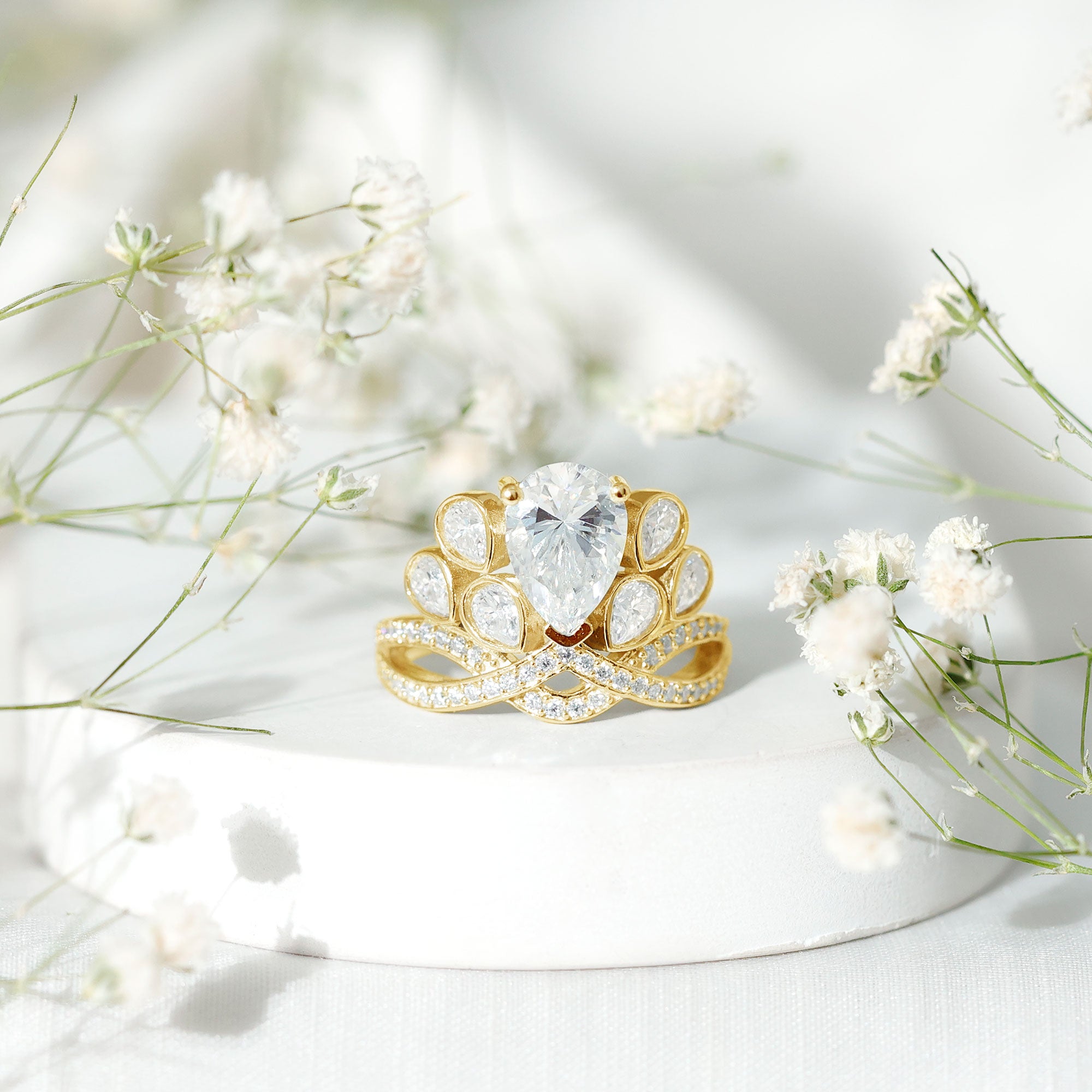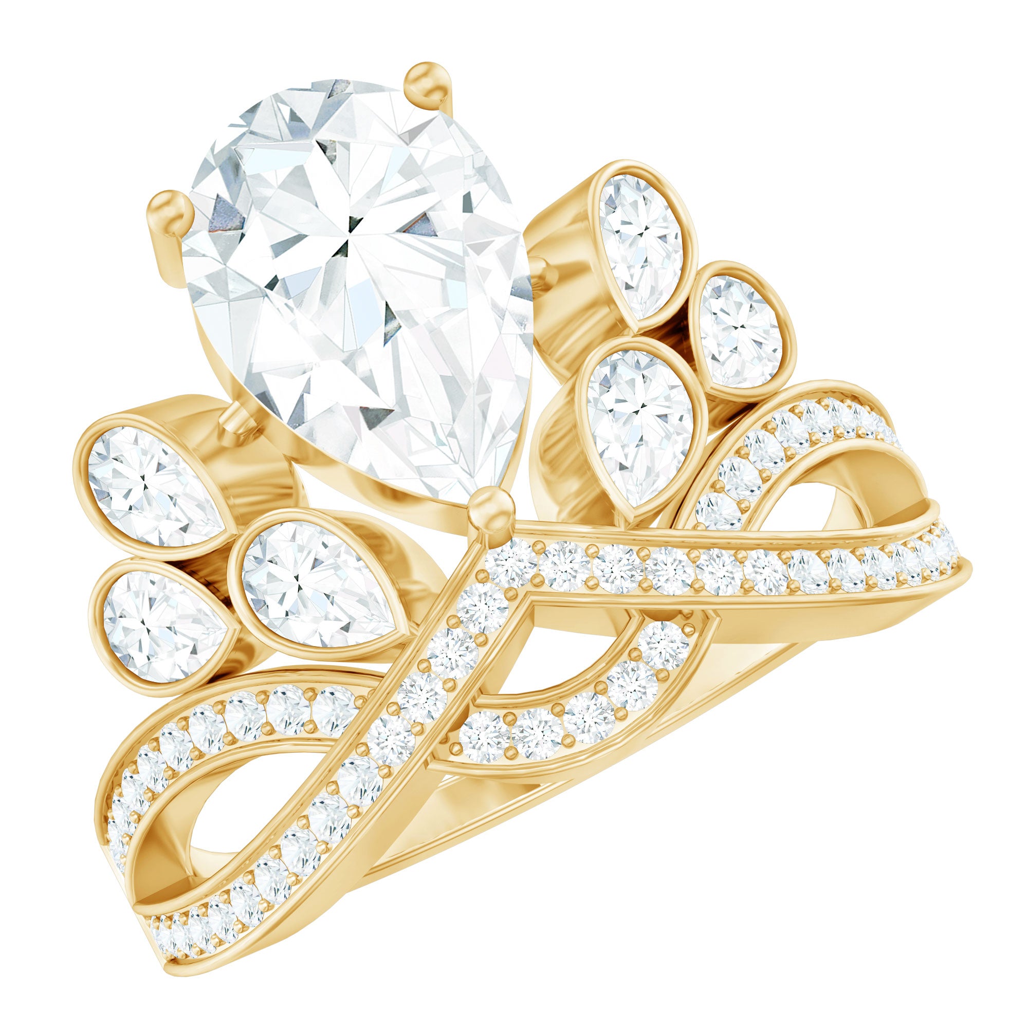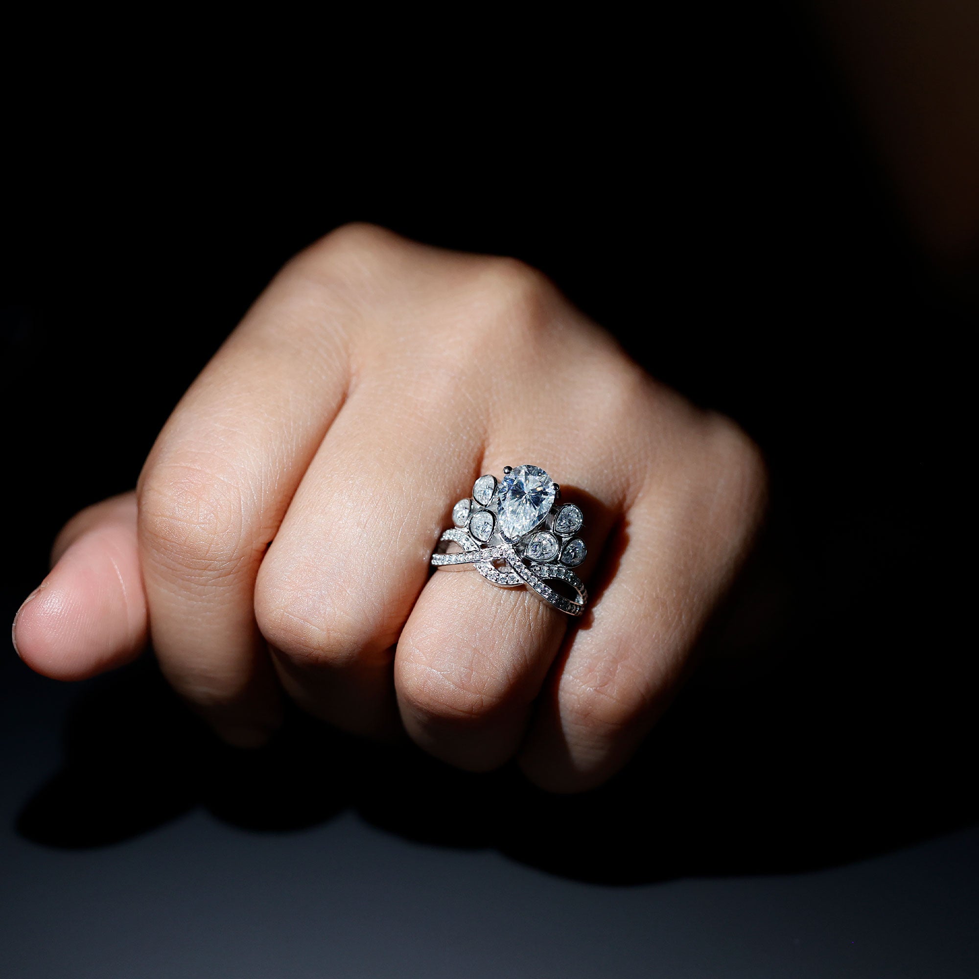 Nothing can make her feel like a queen the way this breathtaking Princess Crown Engagement Ring does. A masterpiece that brings royalty to your fingertips. Inspired by the elegance of a royal crown, this Designer Ring is the perfect blend of regal beauty and modern brilliance. Features a 7X10 MM pear shaped moissanite stone in the center set in secure prong setting. Accented by smaller bezel set pear cut Moissanite stones, mimicking the delicate arches of a tiara. The design flows into a beautifully detailed band, featuring a crisscross pattern studded with round cut Moissanites. The intricate craftsmanship and layered structure create a unique visual, giving the illusion of a finely sculpted crown resting on your finger. This Moissanite Engagement Ring for Women symbolizes commitment and celebrates a love that is grand, elegant, and everlasting. Celebrate your every occasion, whether it is an Engagement, Wedding, Anniversary, Cocktail Party or Birthday with our one-of-a-kind Chunky Ring.