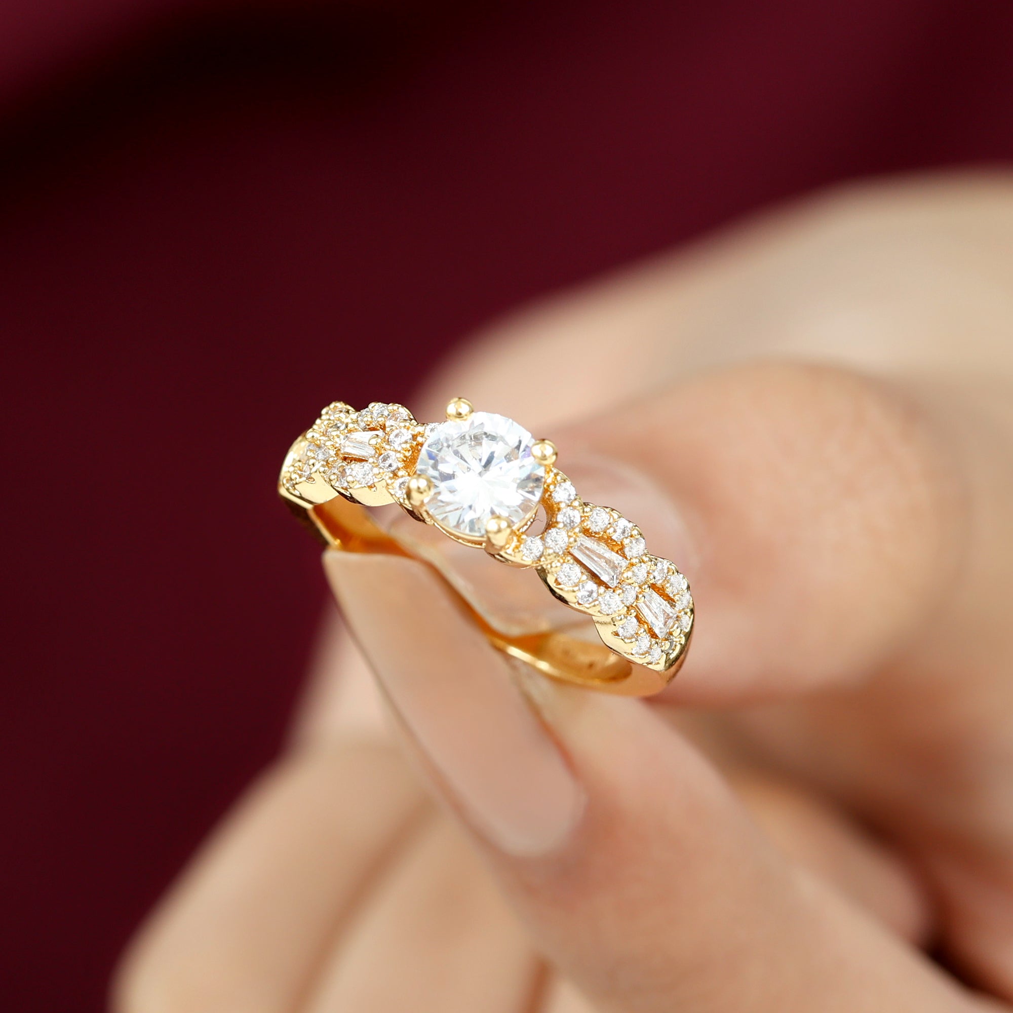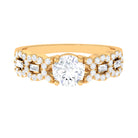 Why settle for an ordinary Moissanite Engagement Ring when you can have this masterpiece, full of sparkle and modern charm. At the center of this remarkable design rests a dazzling 6 MM round moissanite set securely in prong setting, radiating a fiery brilliance that captures attention from every angle. The central stone is beautifully complemented by an intricate arrangement of round and baguette moissanites along the band, creating a luxurious and balanced composition. This Designer Engagement Ring speaks of refined artistry and detailed craftsmanship. The timeless detailing and stunning sparkle makes it an ideal choice for someone who appreciates bold elegance and thoughtful design. Whether viewed from the top or admired from the side, the brilliance of the stones and the finesse of the setting offer an enchanting experience. Perfect for a proposal or a meaningful gift, this Round Cut Engagement Ring is more than just a symbol of love - it is a statement of sophistication and individuality, designed to be treasured for a lifetime.