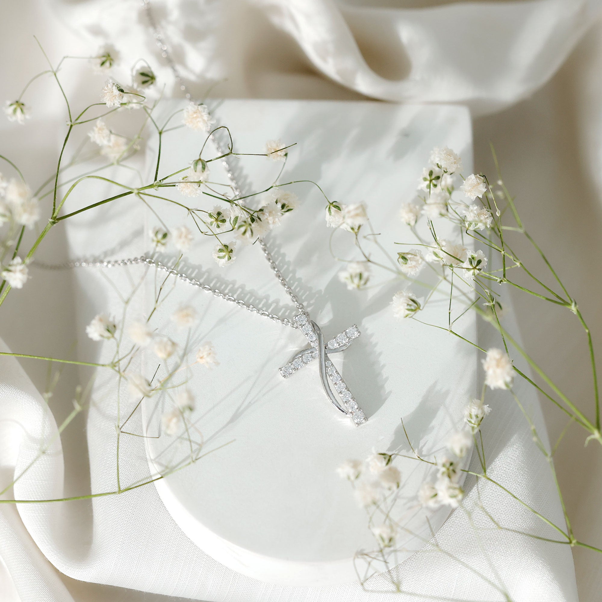 Rosec Jewels handcrafted this Double Cross Necklace to double the good vibes, double the charm and double the sparkle. Made in 14k white gold plated silver, this Silver Cross Necklace is not just sparkles, but it glows with meaning and style. The design features two overlapping cross signs, one lined with round cut sparkling Moissanite stones in prong setting, while the second one is crafted in plain metal. The Moissanite Cross Necklace dangles from a sleek chain that sits just right on the collarbone, making it ideal for layering or rocking on its own. Whether you are dressing up for special events or just want something meaningful to wear on daily, this Religious Necklace is a whole vibe.