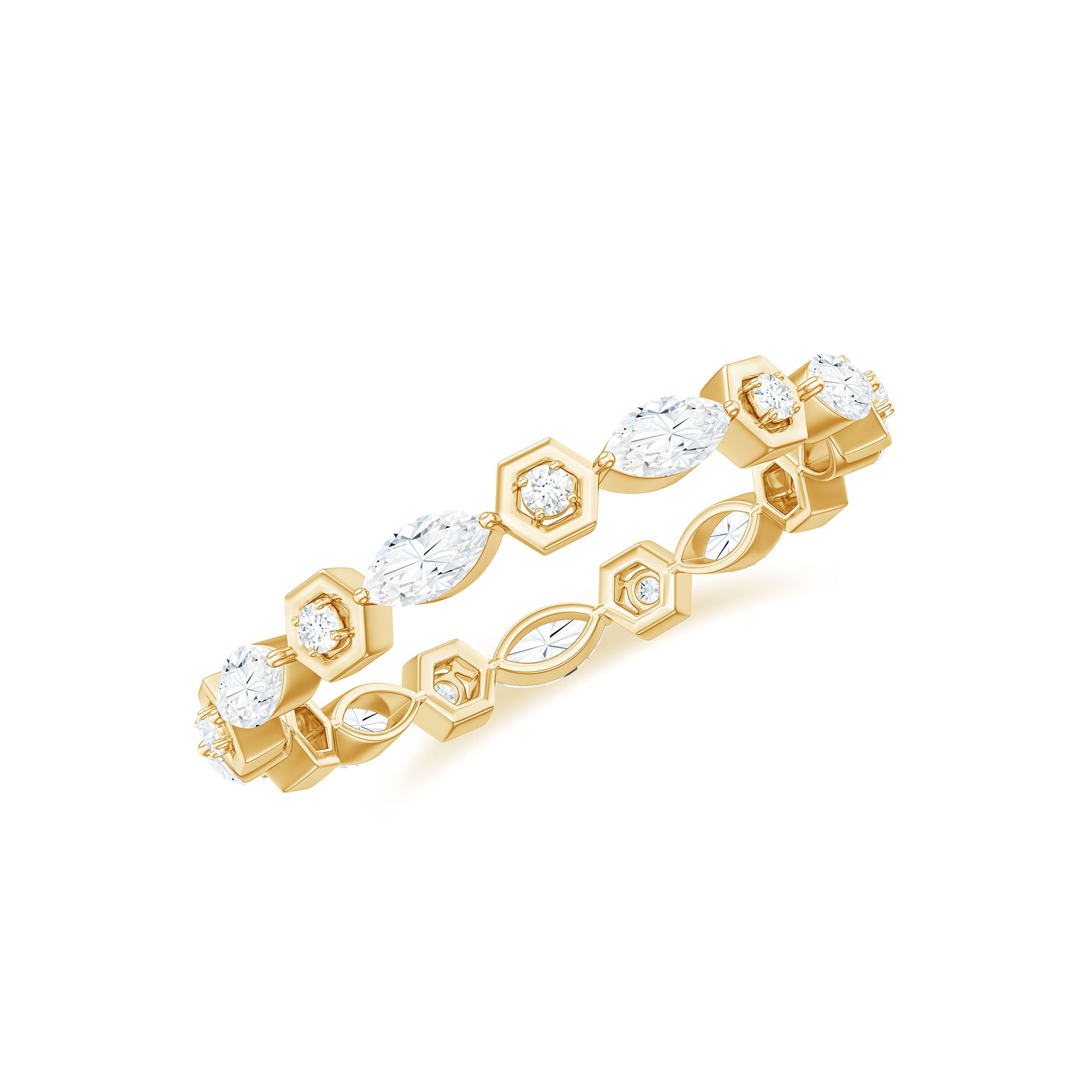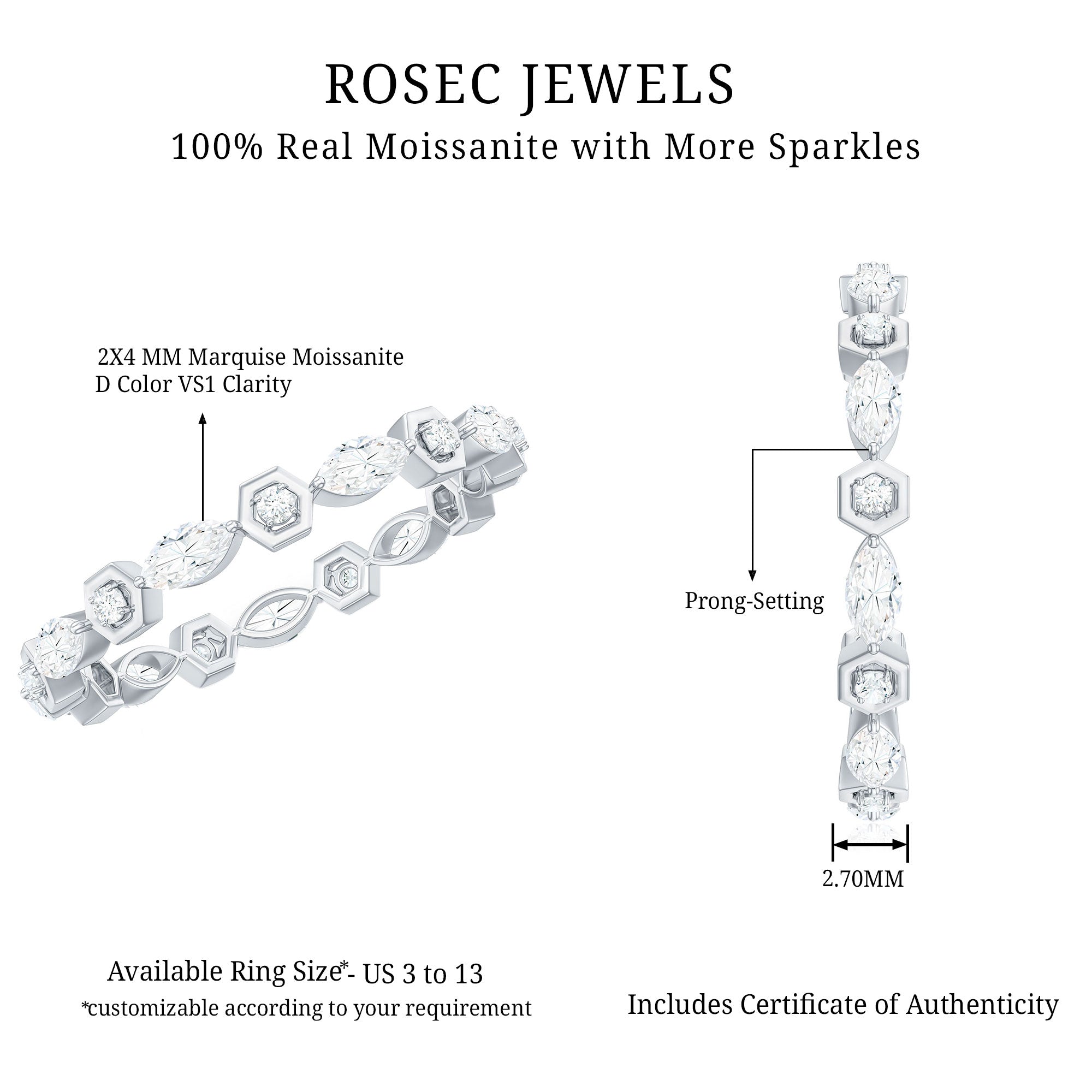 Simple and elegant this Moissanite Band Ring is a perfect jewelry for your wedding day. Celebrate the milestone of your life by presenting this Eternity Band Ring as a token of your love. The Marquise and Round Cut Moissanite held securely in Prong Setting on Eternity Band Ring can perfectly be stacked with your engagement ring or wedding band. This Colorless Moissanite Band Ring pairs perfectly with any outfit for a minimalist, yet sophisticated look.