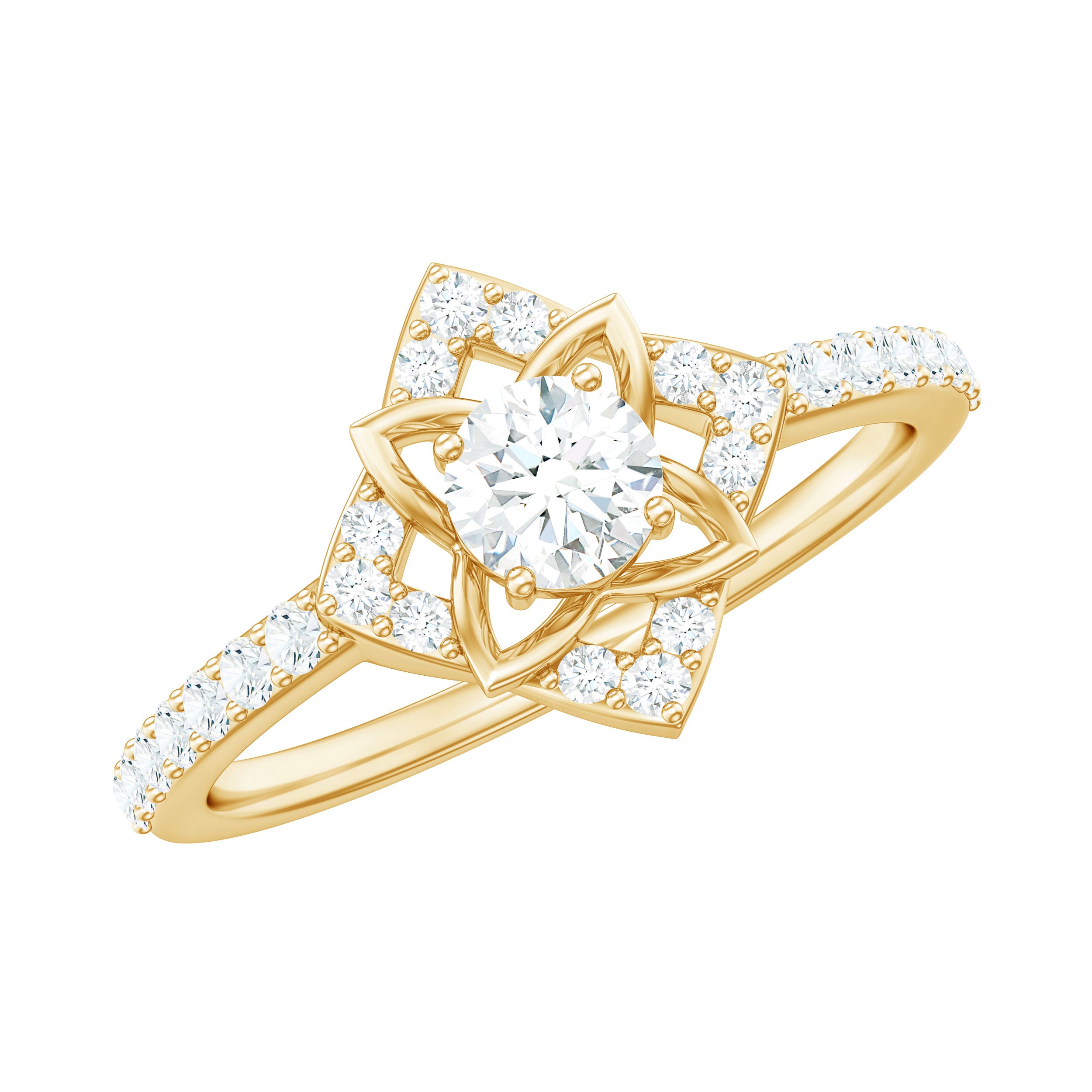 Experience the timeless elegance of this exquisite Flower Engagement Ring, featuring a dazzling 4 MM round cut moissanite at its heart. Expertly set in secure prong setting, this centerpiece stone radiates remarkable brilliance and fire, drawing the eye with its captivating sparkle. Surrounding the central moissanite is an intricate floral design crafted from a delicate arrangement of shimmering stones, forming a beautiful blossom that symbolizes love, growth, and new beginnings. Each moissanite in this ring is carefully selected for its exceptional quality, boasting a D color and VS1 clarity. The design gracefully combines classic sophistication with a contemporary floral motif, making it a perfect symbol of romance and individuality. Whether chosen as an engagement ring or a meaningful gift, this Moissanite Engagement Ring is a celebration of beauty, purity, and commitment. Its refined sparkle and elegant craftsmanship make it an heirloom-worthy treasure to cherish for a lifetime. Celebrate your unique love story with this stunning Flower Ring for Women, a harmonious blend of nature’s inspiration and enduring elegance, destined to shine bright through all of life’s most cherished moments.
