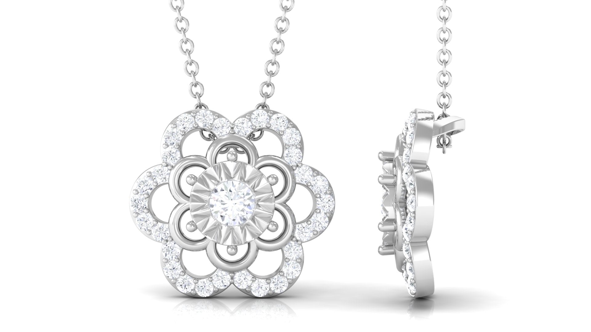 Get this Moissanite Floral Pendant Necklace for your special one, embellished with Round Shape Moissanite in the center secured by Illusion Setting and Round Moissanite studded on a Floral Design. This Moissanite Pendant Necklace deserves to be a part of your jewelry collection, this Flower Pendant is the perfect birthday present for the one you love.
