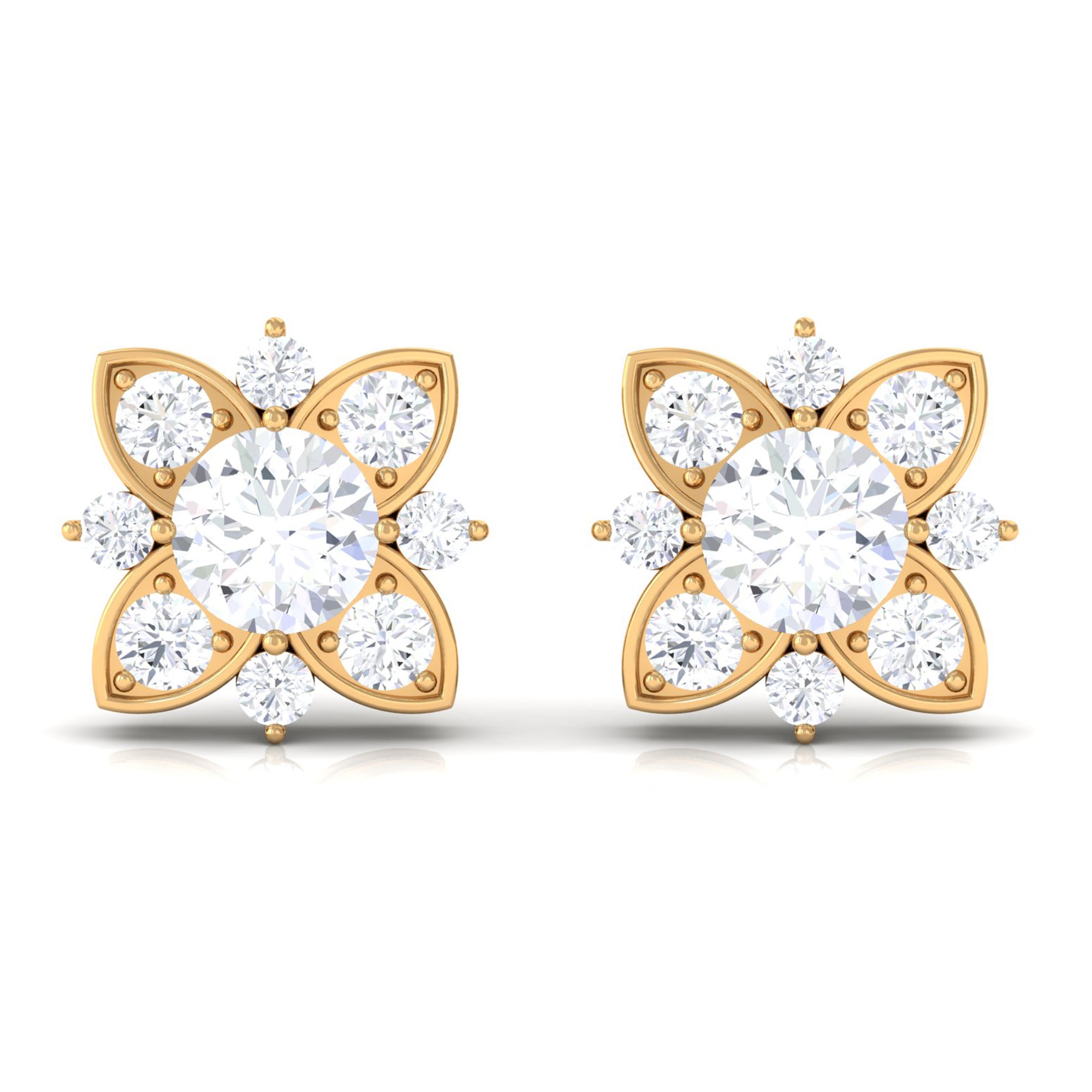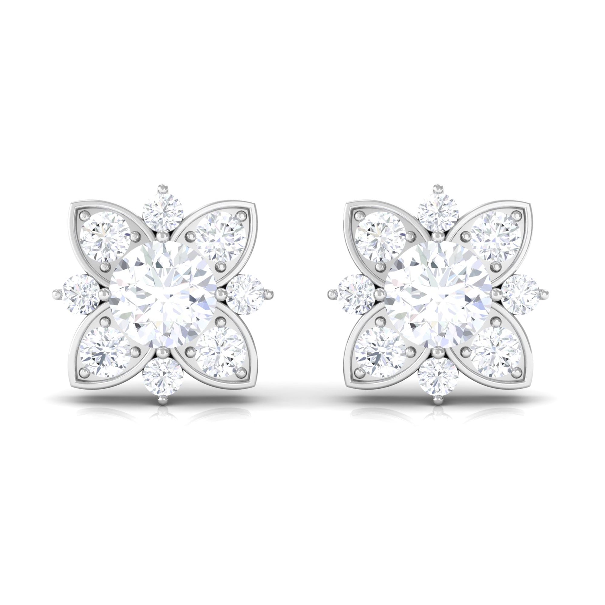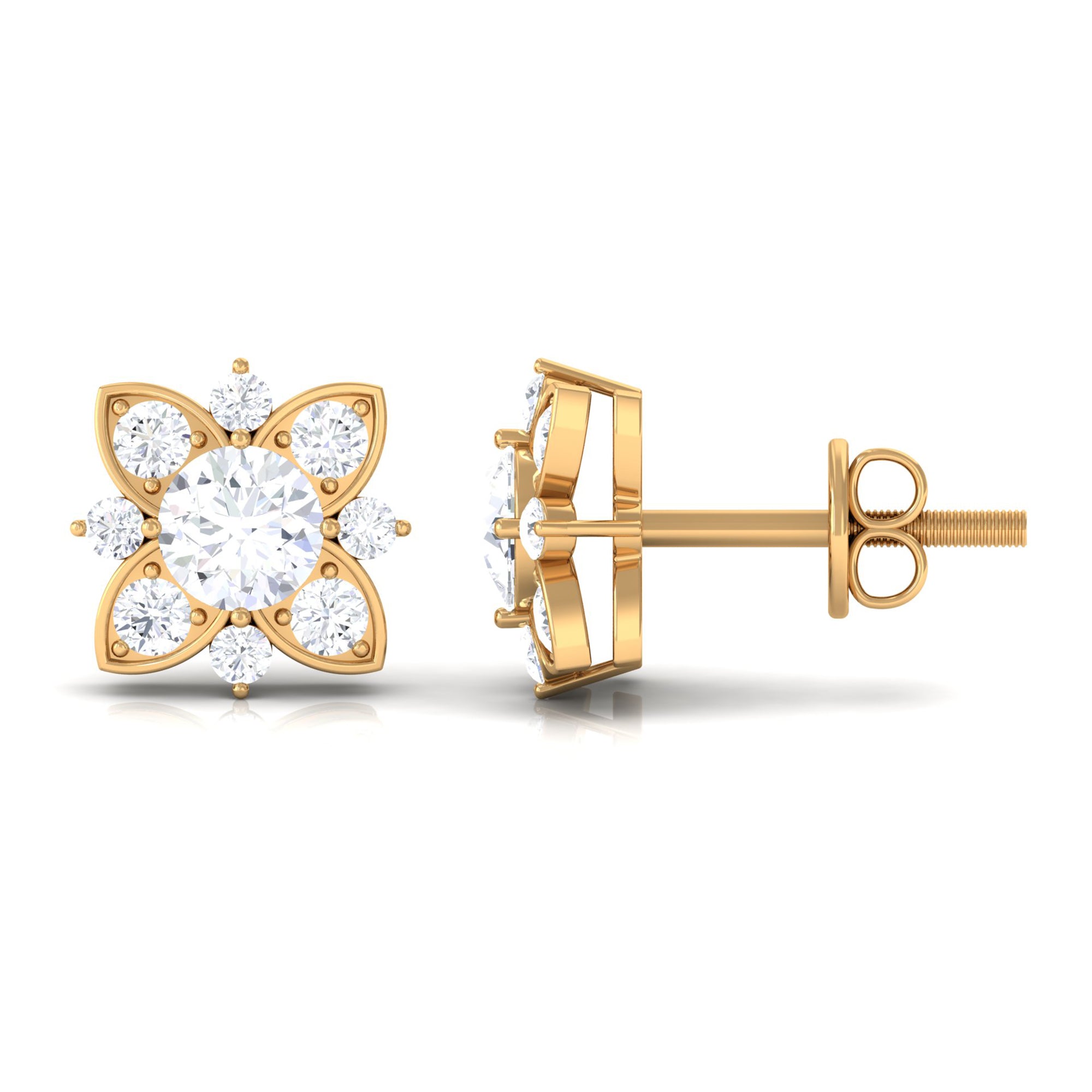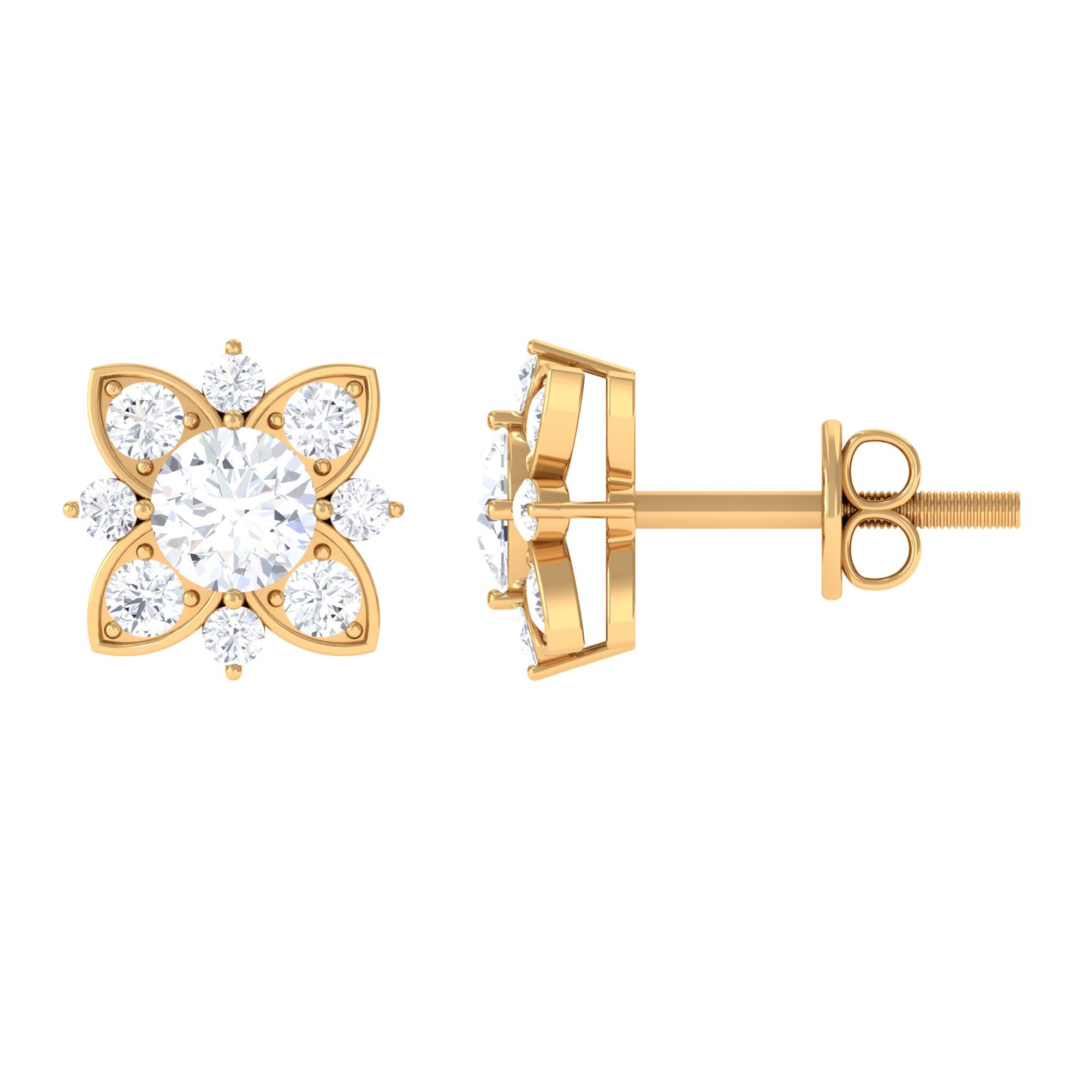 Surprise her with these Certified Moissanite Stud Earrings. Adorned with 4 MM Round Cut Moissanite in Prong Setting in the center that makes a stunning flower design on Classic Floral Earrings. With the perfect Screw Back closure these Colorless Moissanite Earrings also makes a unique present for your loved ones or a perfect treat for yourself.