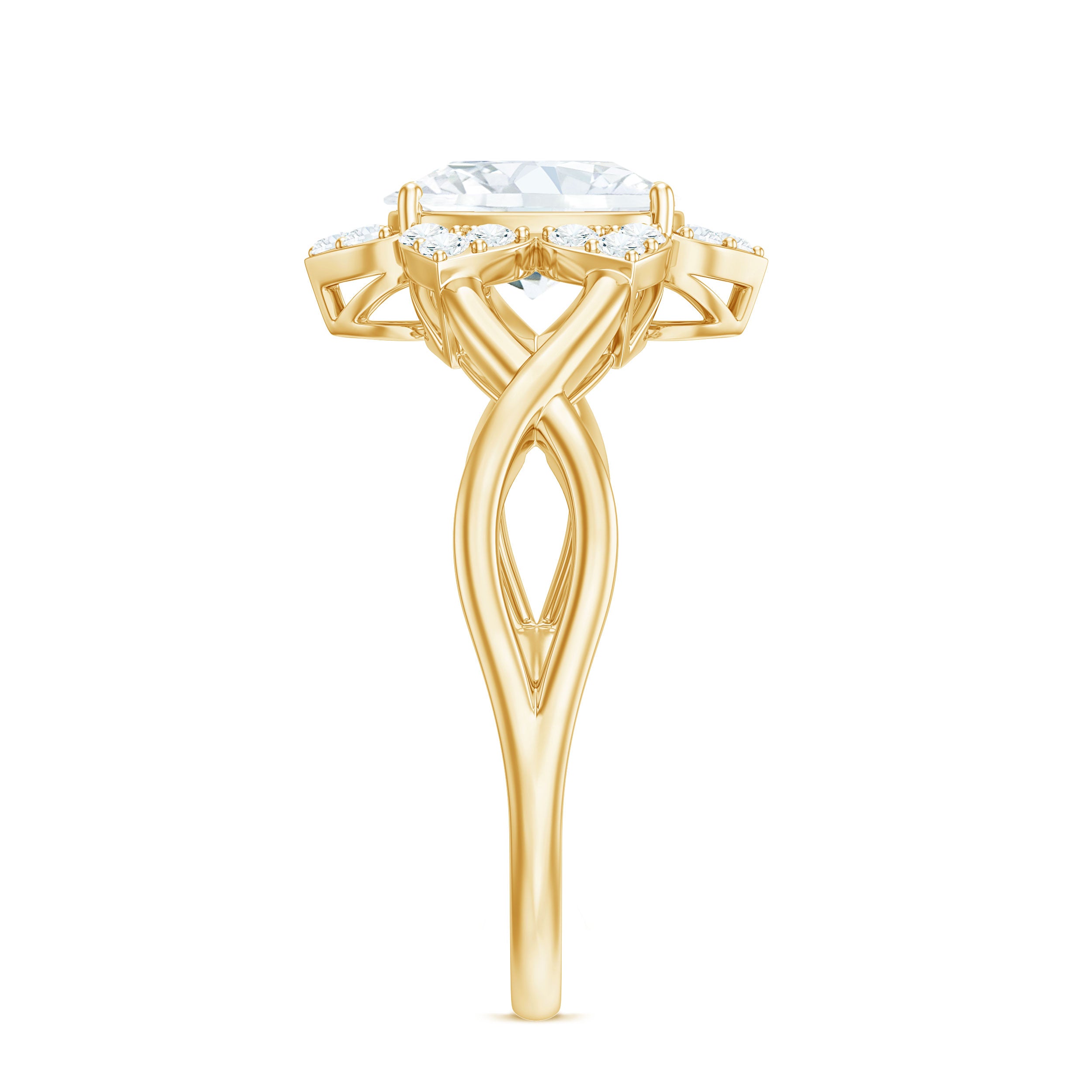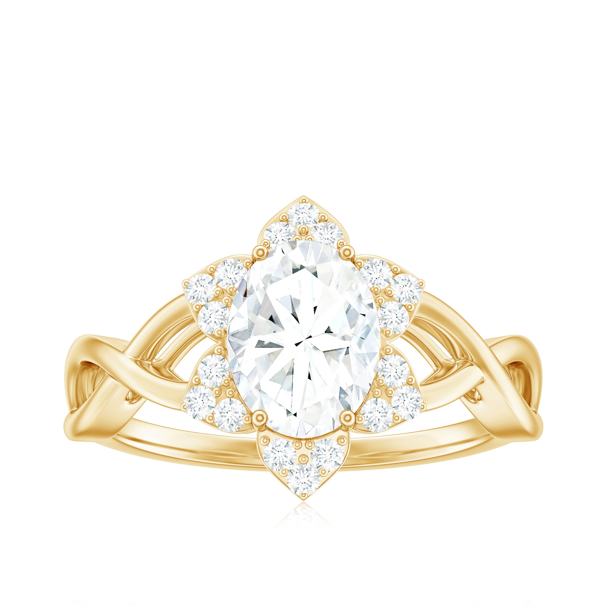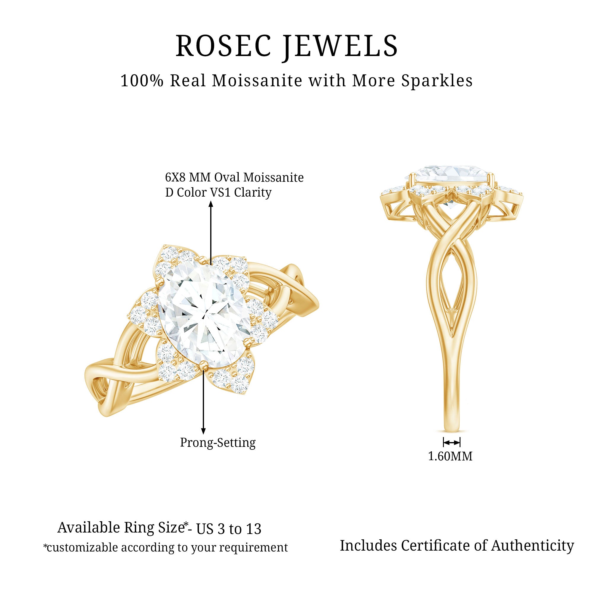 This Flower Engagement Ring is an enchanting piece that radiates both romance and brilliance. At its heart lies a 6X8 MM oval cut moissanite, elegantly set in prong setting, exuding fire and sparkle, making it the ideal centerpiece for such a significant item. Encircling the main stone is a halo inspired by flower, featuring smaller round moissanites arranged on delicate petal patterns that bloom in perfect unison. The design embodies the essence of natural beauty, showcases a flower in full bloom, timeless, fresh, and vibrant. The crisscross band offers a smooth, flowing design that feels both contemporary and classic. The crossover style introduces a distinctive twist, symbolizing two paths merging into one, making it perfect for commemorating your love story. Whether you are proposing, celebrating an anniversary, or indulging yourself with something special, this Oval Moissanite Engagement Ring presents an elegant yet playful appearance that fits any memorable occasion. Crafted with care and comfort in mind, the Criss Cross Engagement Ring is designed for everyday wear while still making a striking impression. The oval cut moissanite at the center delivers classic sparkle, while the floral halo and infinity band provide a modern, feminine touch. It is a piece that embodies the joy and uniqueness of the love it signifies, bright, beautiful, and eternally blooming.