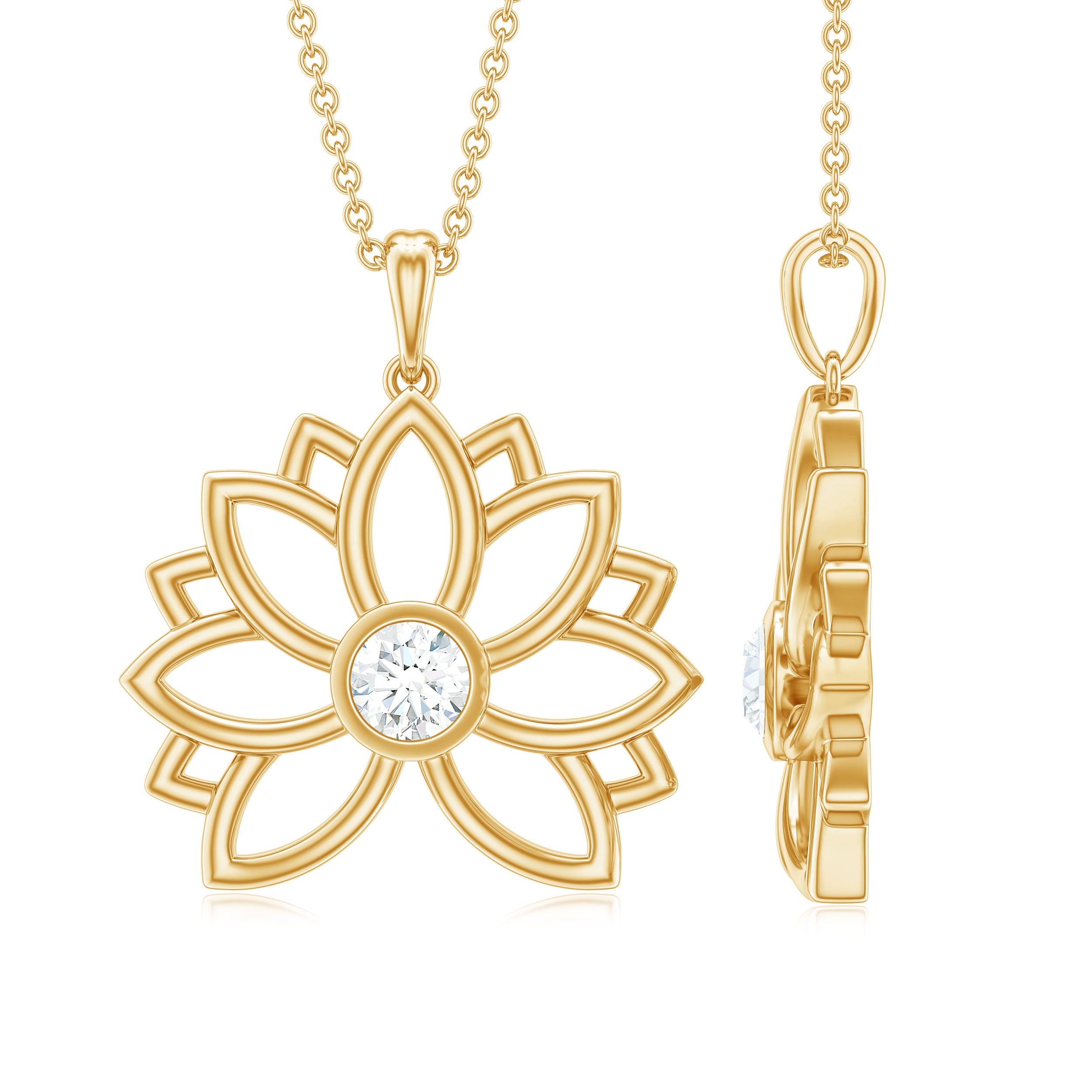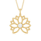The simple Moissanite Flower Pendant Necklace is adorned with a Round Shape Moissanite secured in Bezel Setting in the center of a floral design making it a marvelous choice. Enchant everyones attention with this unique Flower Pendant. Surprise your favorite person on a special day with this Moissanite Pendant Necklace and get that priceless smile on her face.