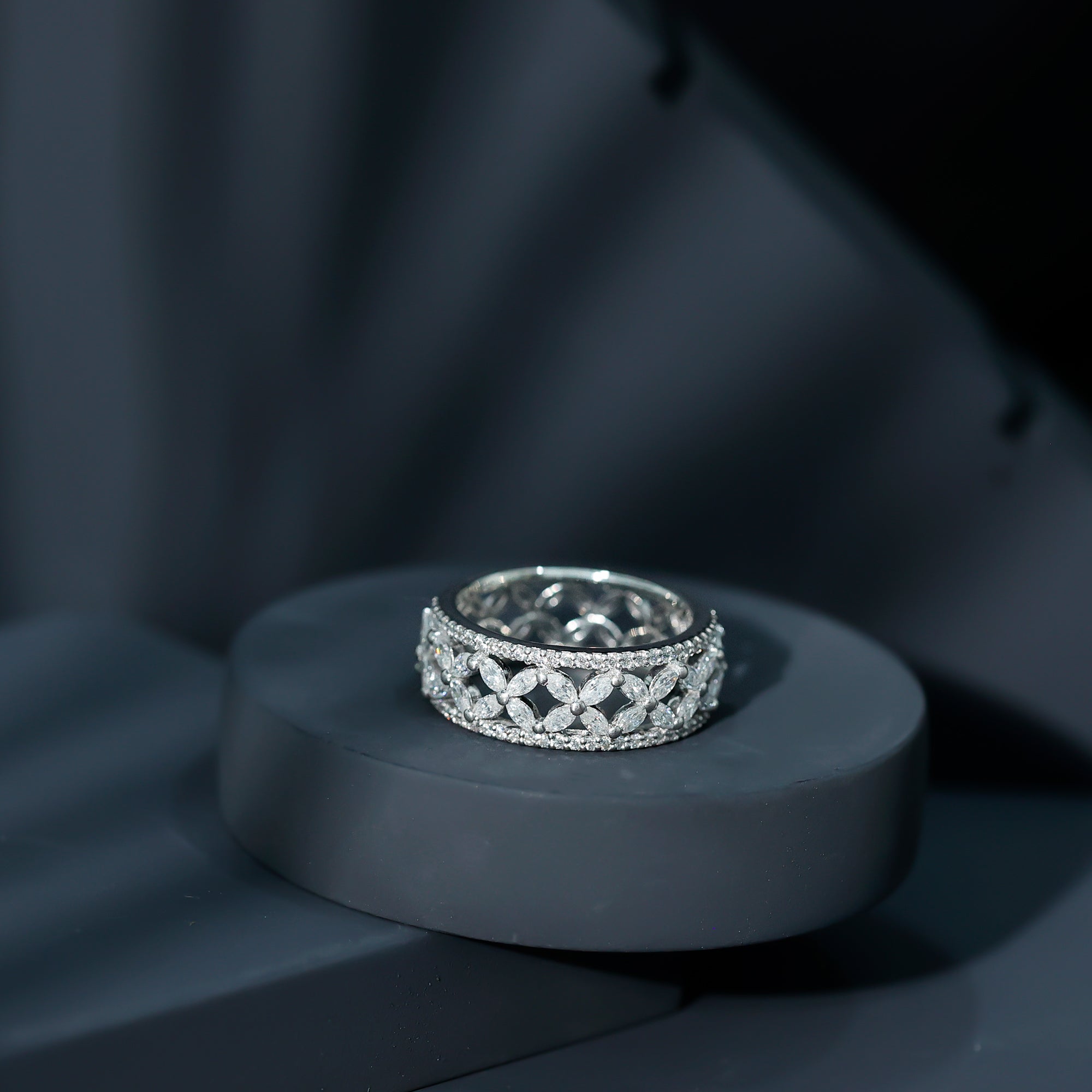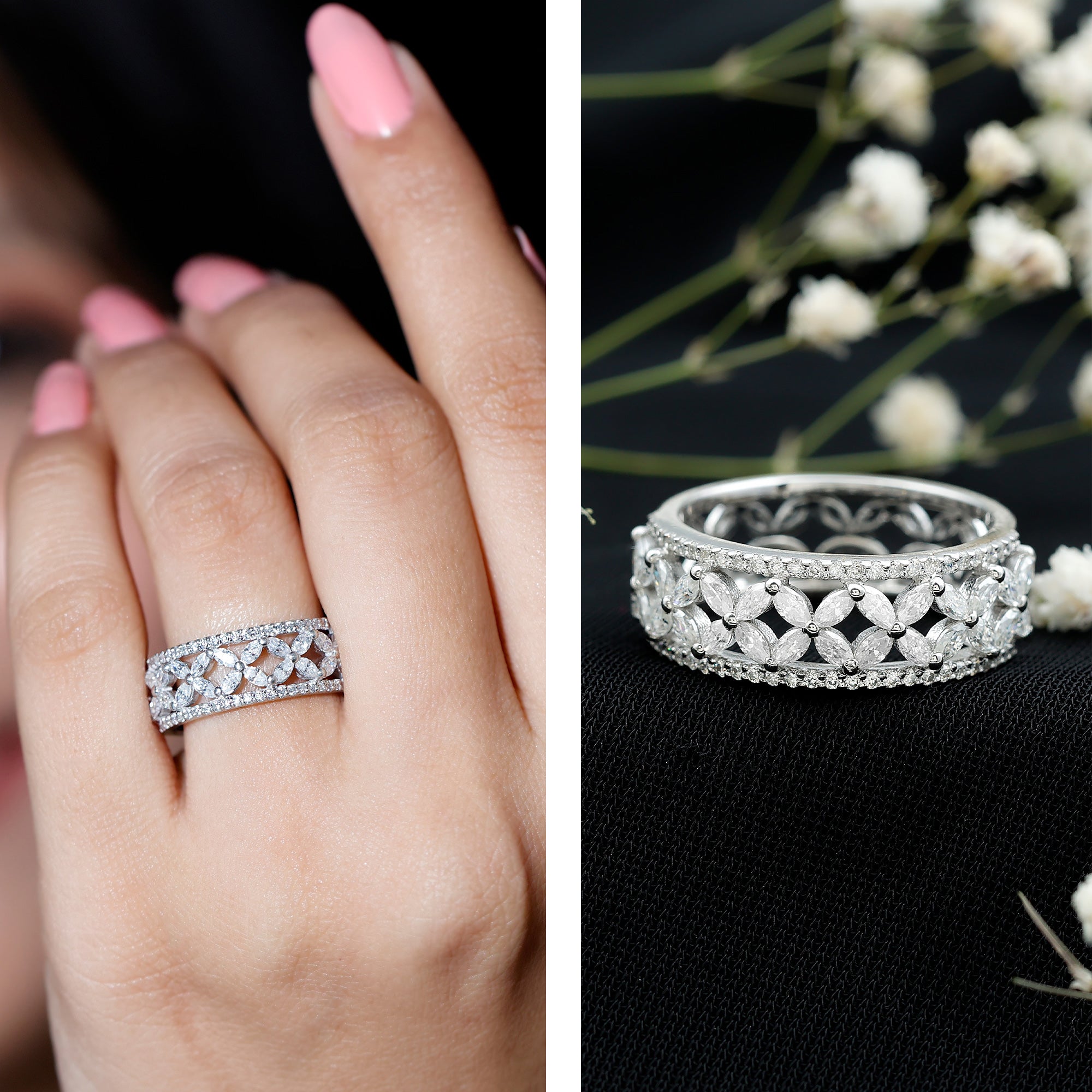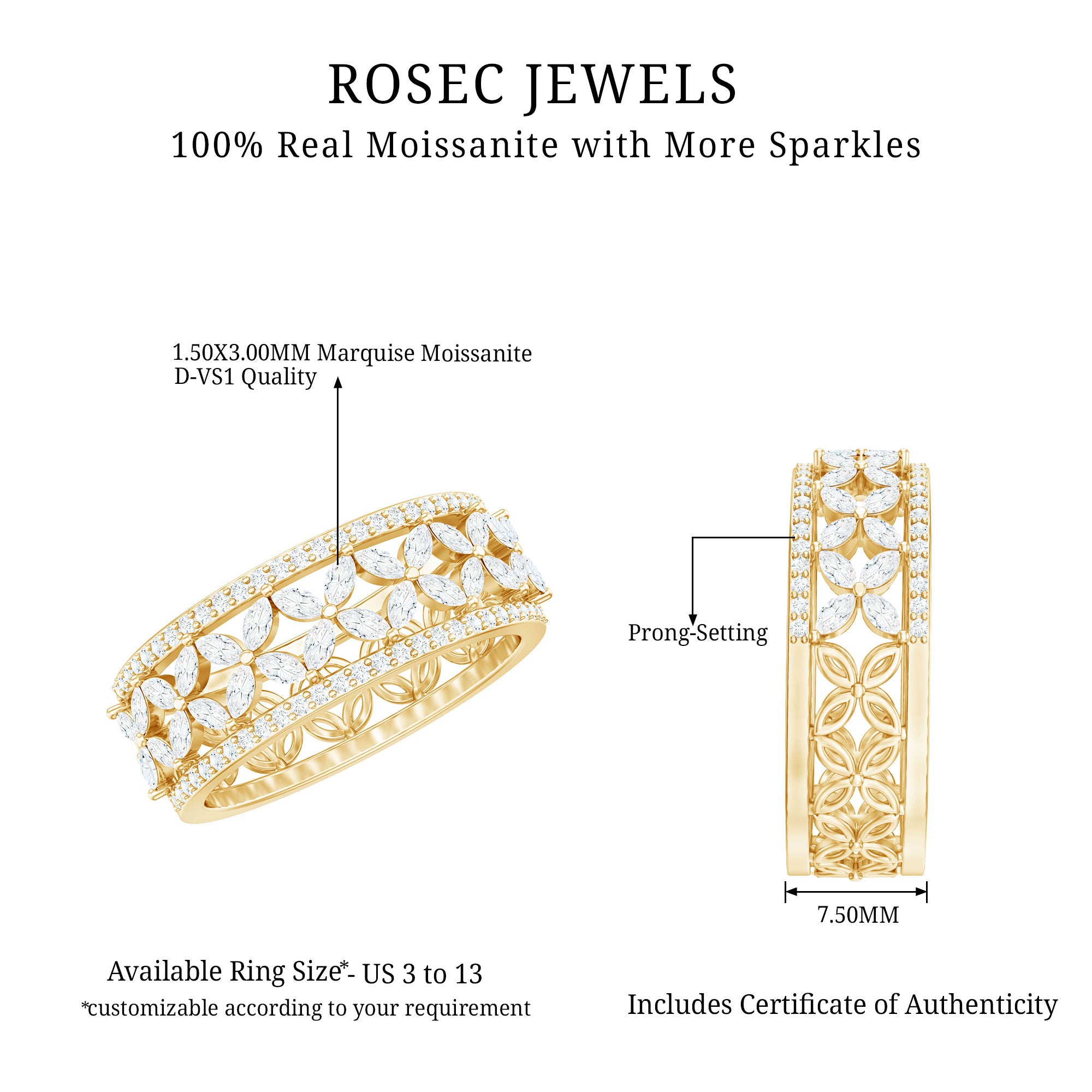A blooming statement of love, this Moissanite Wedding Band is crafted to captivate with its bold and beautiful design. The band features two striking rows of marquise cut moissanite stones, creating a flower design in the center and bordered with round brilliant cut moissanites that not only add extra sparkle but also enhance the floral illusion. With its wide silhouette, this Moissanite Anniversary Band is a bold expression of beauty, brilliance, and unmatched craftsmanship. Designed for those who adore statement pieces, this Wide Wedding Band instantly captures attention with its dazzling shimmer. To elevate its magnificence even further, each stone is held by prong setting for perfect security and comfort, giving it a refined sparkle from every angle. This Flower Band Ring makes a stunning standalone piece - ideal for weddings, anniversaries, or as a signature accessory for any special event. Whether you are walking down the aisle or attending an evening gala, this Moissanite Eternity Band promises to be the centerpiece of your look. It is a ring that does not just sit on your hand, but speaks of elegance, confidence, and unforgettable style.