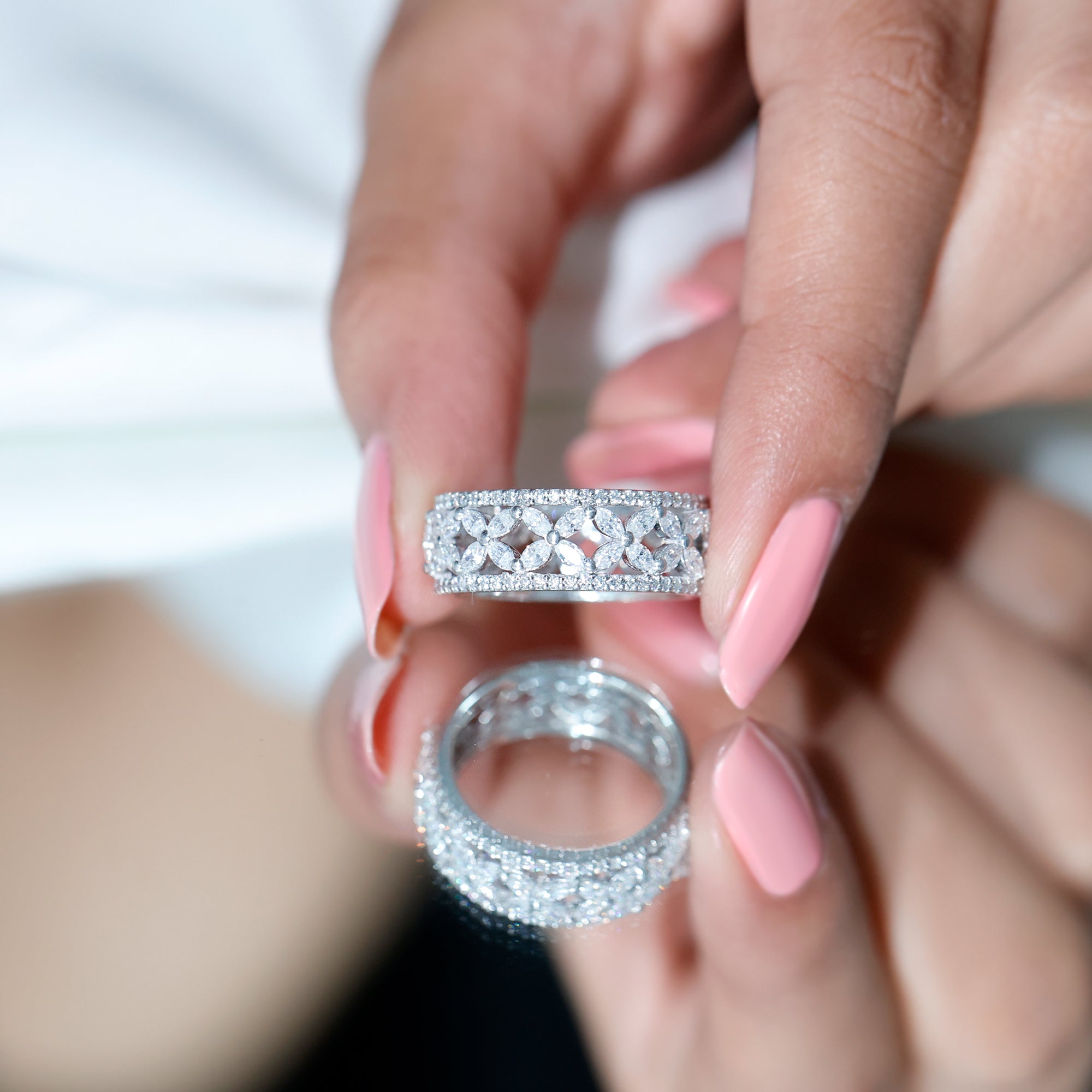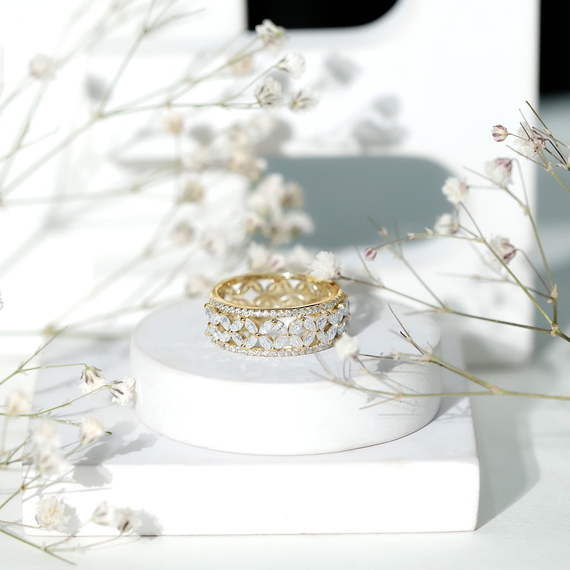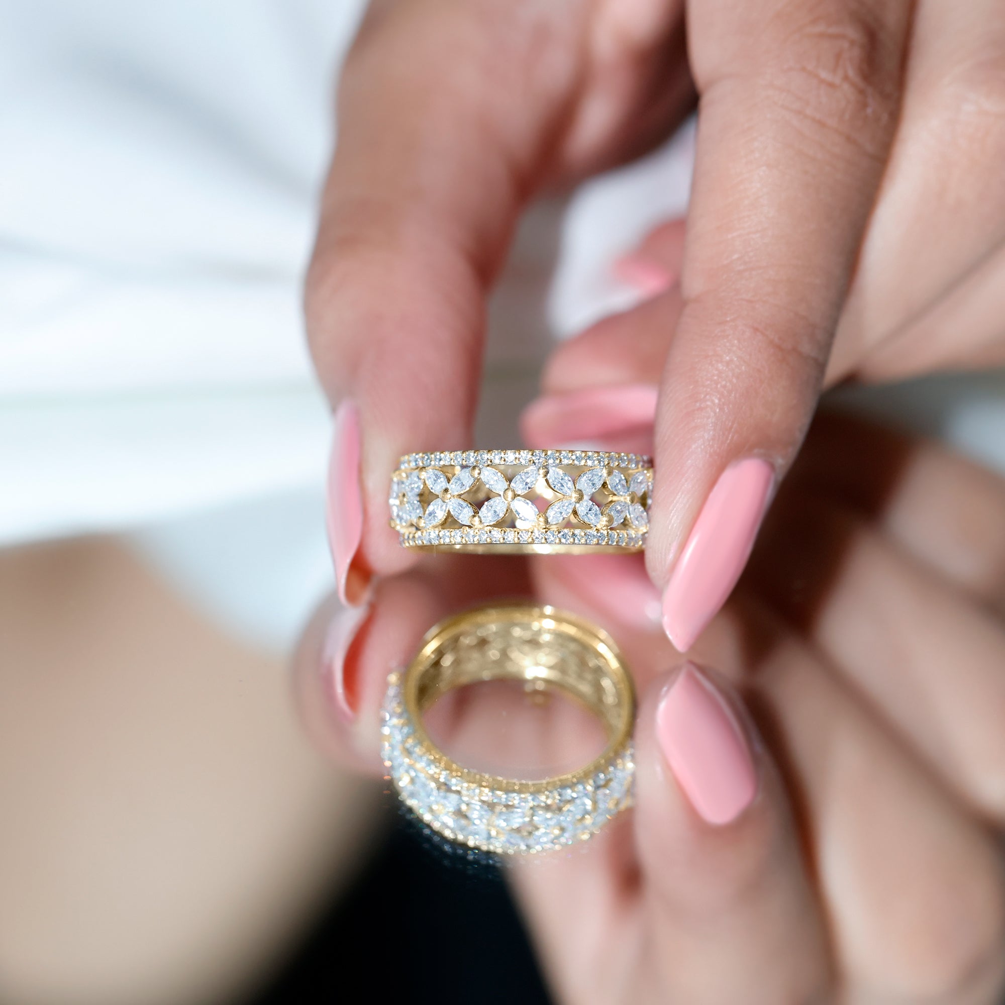A blooming statement of love, this Moissanite Wedding Band is crafted to captivate with its bold and beautiful design. The band features two striking rows of marquise cut moissanite stones, creating a flower design in the center and bordered with round brilliant cut moissanites that not only add extra sparkle but also enhance the floral illusion. With its wide silhouette, this Moissanite Anniversary Band is a bold expression of beauty, brilliance, and unmatched craftsmanship. Designed for those who adore statement pieces, this Wide Wedding Band instantly captures attention with its dazzling shimmer. To elevate its magnificence even further, each stone is held by prong setting for perfect security and comfort, giving it a refined sparkle from every angle. This Flower Band Ring makes a stunning standalone piece - ideal for weddings, anniversaries, or as a signature accessory for any special event. Whether you are walking down the aisle or attending an evening gala, this Moissanite Eternity Band promises to be the centerpiece of your look. It is a ring that does not just sit on your hand, but speaks of elegance, confidence, and unforgettable style.