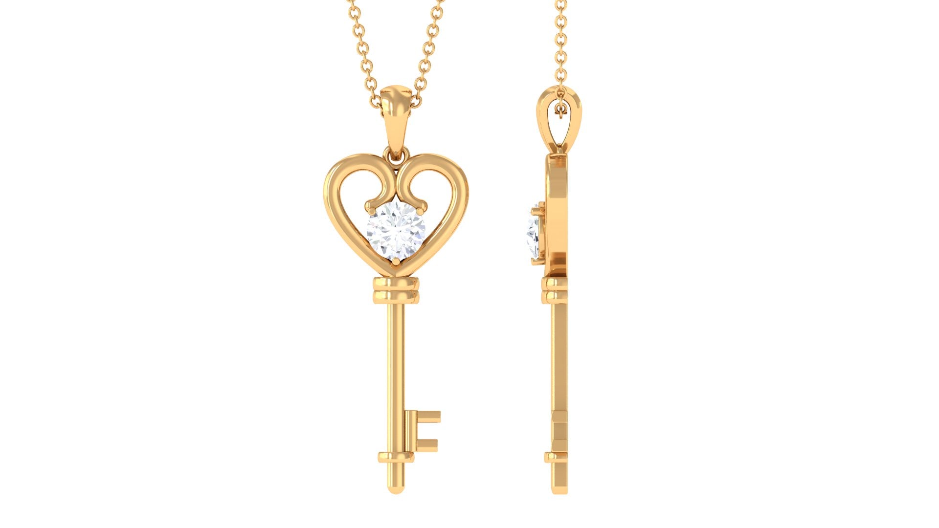 This Key Pendant Necklace is a stylish way to upgrade your jewelry collection. Showcasing Round Cut Moissanite secured by 3 Prong Setting in the center of a key design. You can style this Moissanite Pendant with your casual or dressy attires to stand out from the crowd.