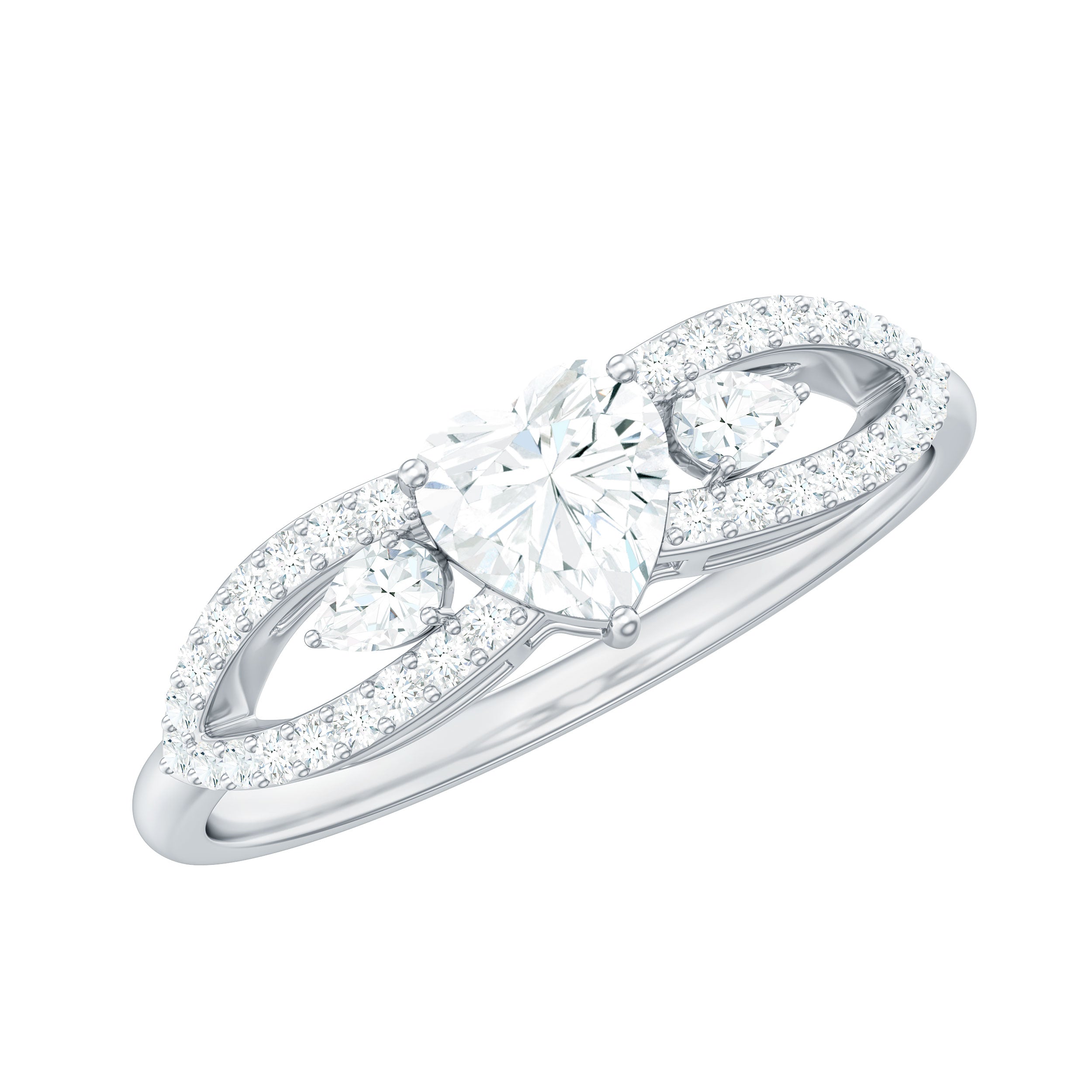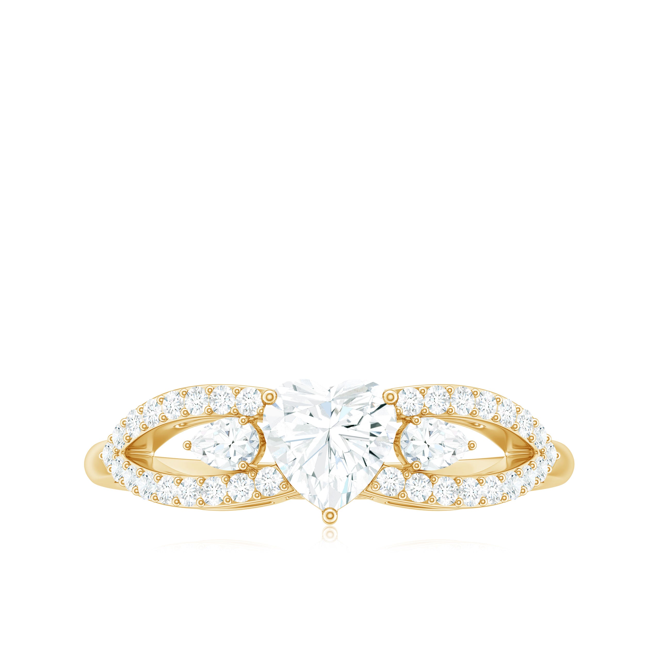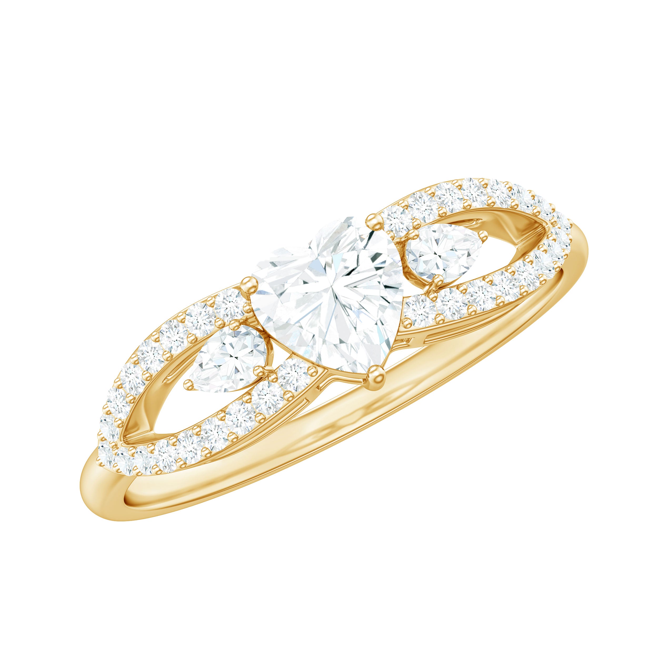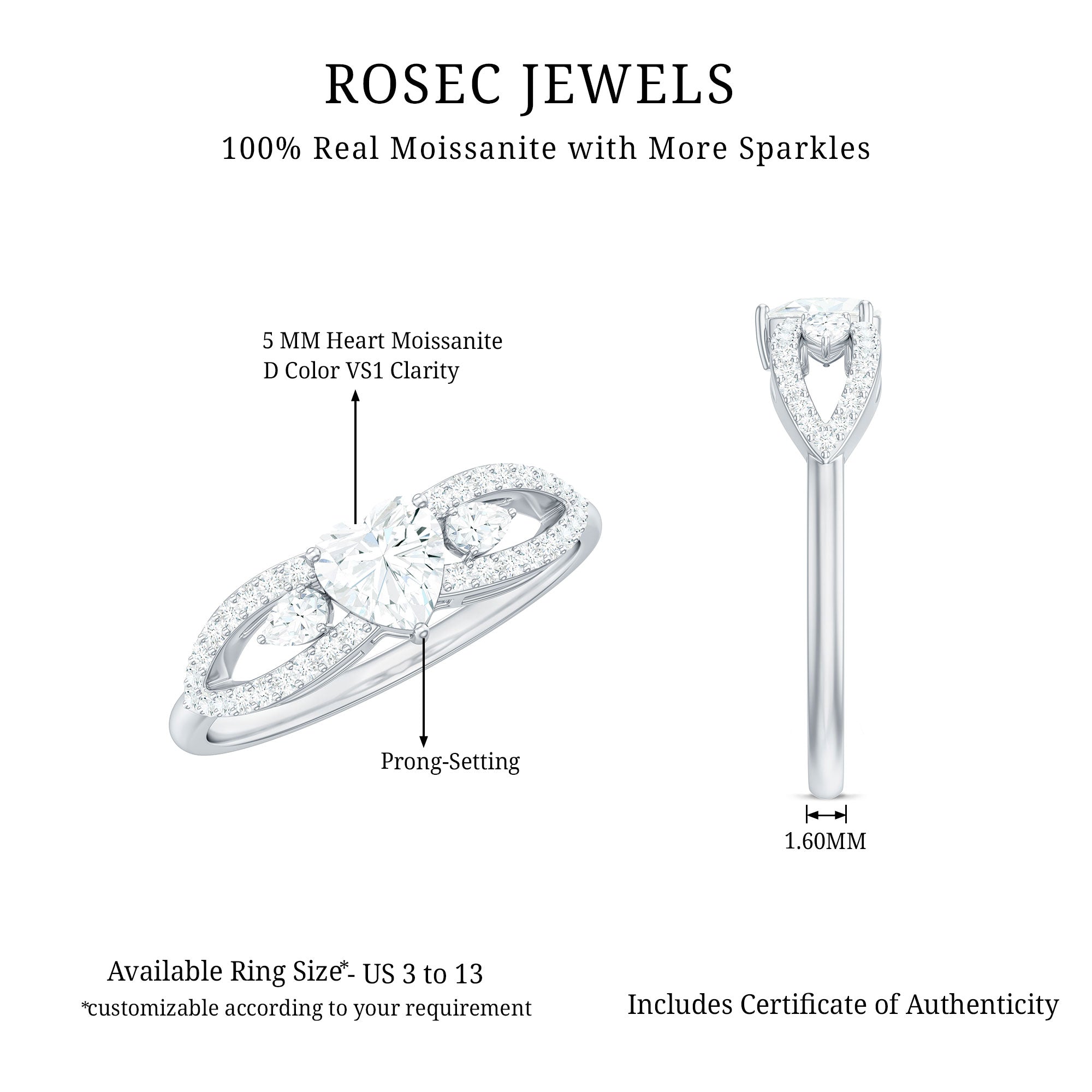 Express your love in the most heartfelt way with this exquisite Heart Shaped Moissanite Ring, a timeless symbol of affection, devotion, and enduring connection. Thoughtfully designed by Rosec Jewels, this stunning piece blends classic elegance with a touch of modern glamour, perfect for a proposal, anniversary, or promise of forever. At the center of this romantic design is a 5 MM heart shaped moissanite, set securely in prong setting that lets its brilliance shine from every angle. Adding to its enchanting charm, the Promise Engagement Ring features a split shank band, gracefully encrusted with round cut moissanite stones for added shimmer and elegance. Flanking the center stone are two pear shaped moissanites, beautifully positioned on each side to amplify the sparkle and create a balanced, eye-catching look. Crafted to embody the sentiment of everlasting love, this Moissanite Engagement Ring is available in a variety of precious metals, allowing you to choose the finish that best reflects her style. Offered in US ring sizes 3 to 13, you will find the perfect fit with ease. This Heart Promise Ring for Her arrives in an elegant signature jewelry box and includes a gemstone certification, making it gift-ready and deeply meaningful.
