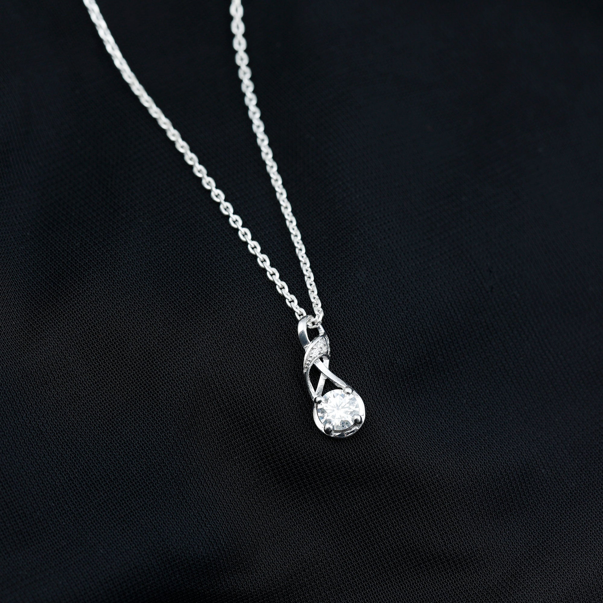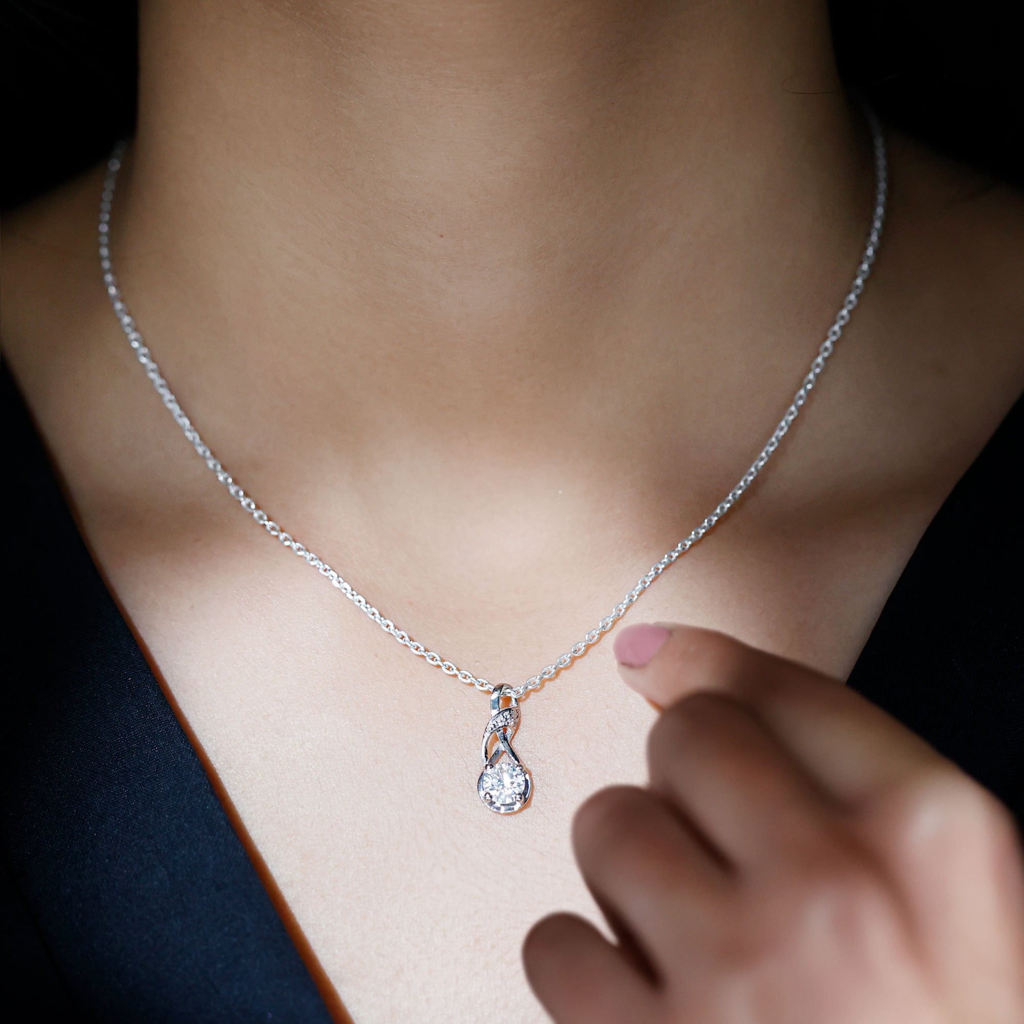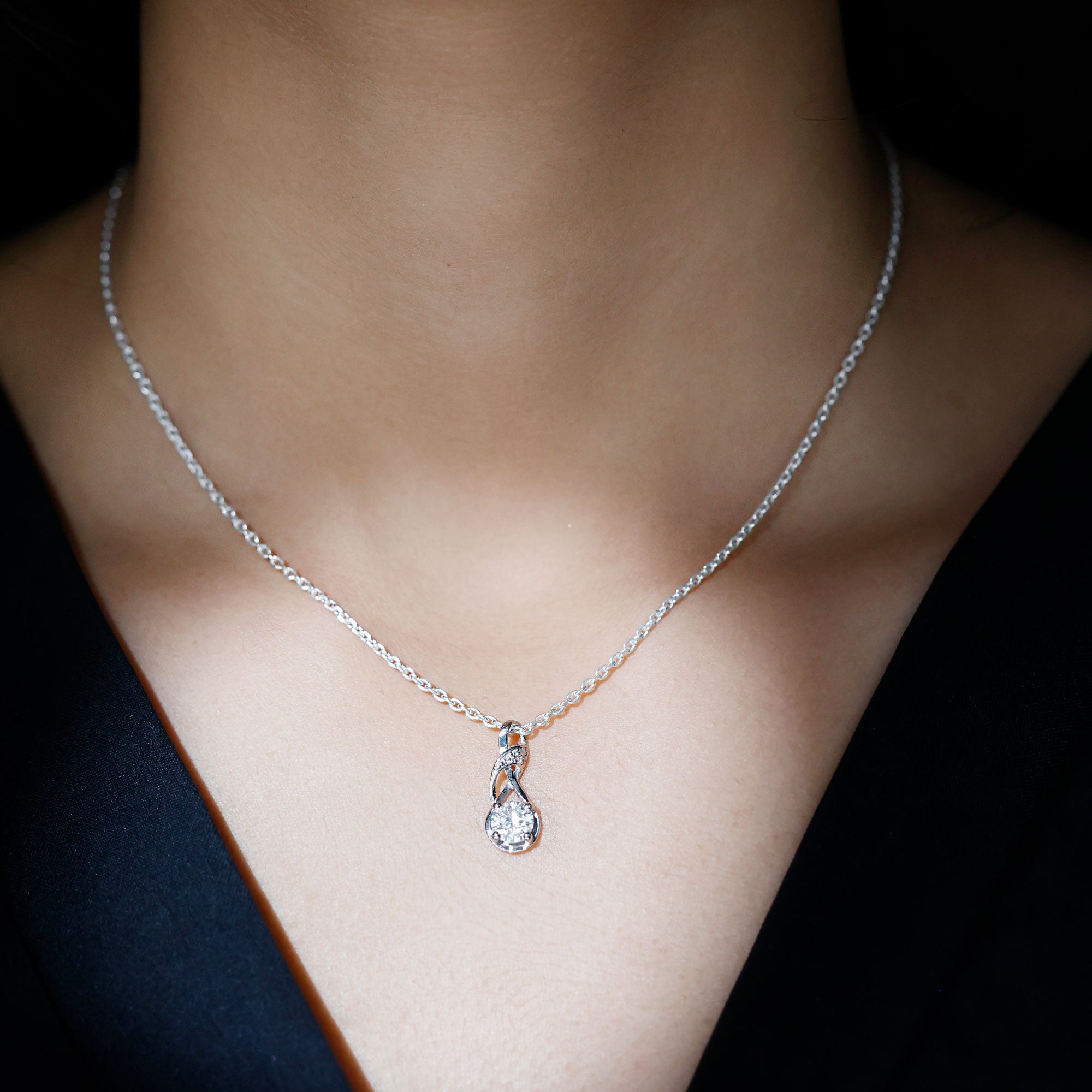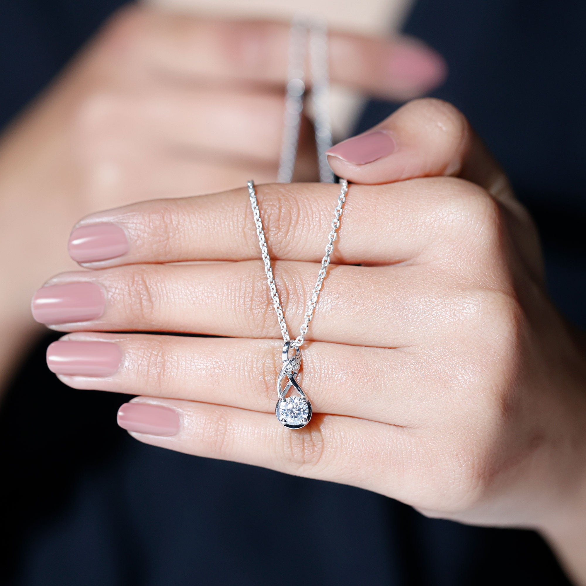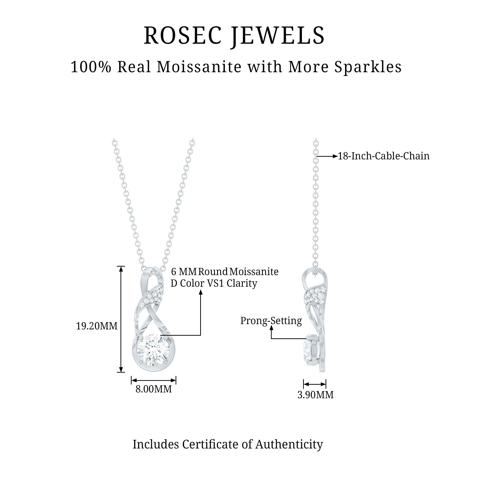Embrace the infinite with this stunning Moissanite Pendant Necklace, a beautiful symbol of your endless love. Adorn yourself with this shimmering Moissanite Infinity Pendant that ensures you shine brightly. At its heart lies a 6 MM Round Moissanite, elegantly set in a Prong Setting, surrounded by a delicate Infinity frame and graced with a unique twist of smaller Moissanite stones. The Forever Symbol Necklace sparkles with D-VS1 quality Moissanite, making it an ideal gift for someone special. This piece embodies eternal love, gracefully hanging from a cable chain with a lobster clasp for easy length adjustments, ensuring it rests perfectly on your neckline. Merging timeless elegance with lasting charm, this Infinity Symbol Necklace is designed to remain pristine for years. Made from White Gold Plated Silver, it symbolizes life’s most treasured relationships and enduring values. This Drop Necklace stands as a lasting tribute to the bond it signifies. With its vertical figure eight design, this Infinity Loop Necklace represents an eternal connection, symbolizing two souls united in commitment.