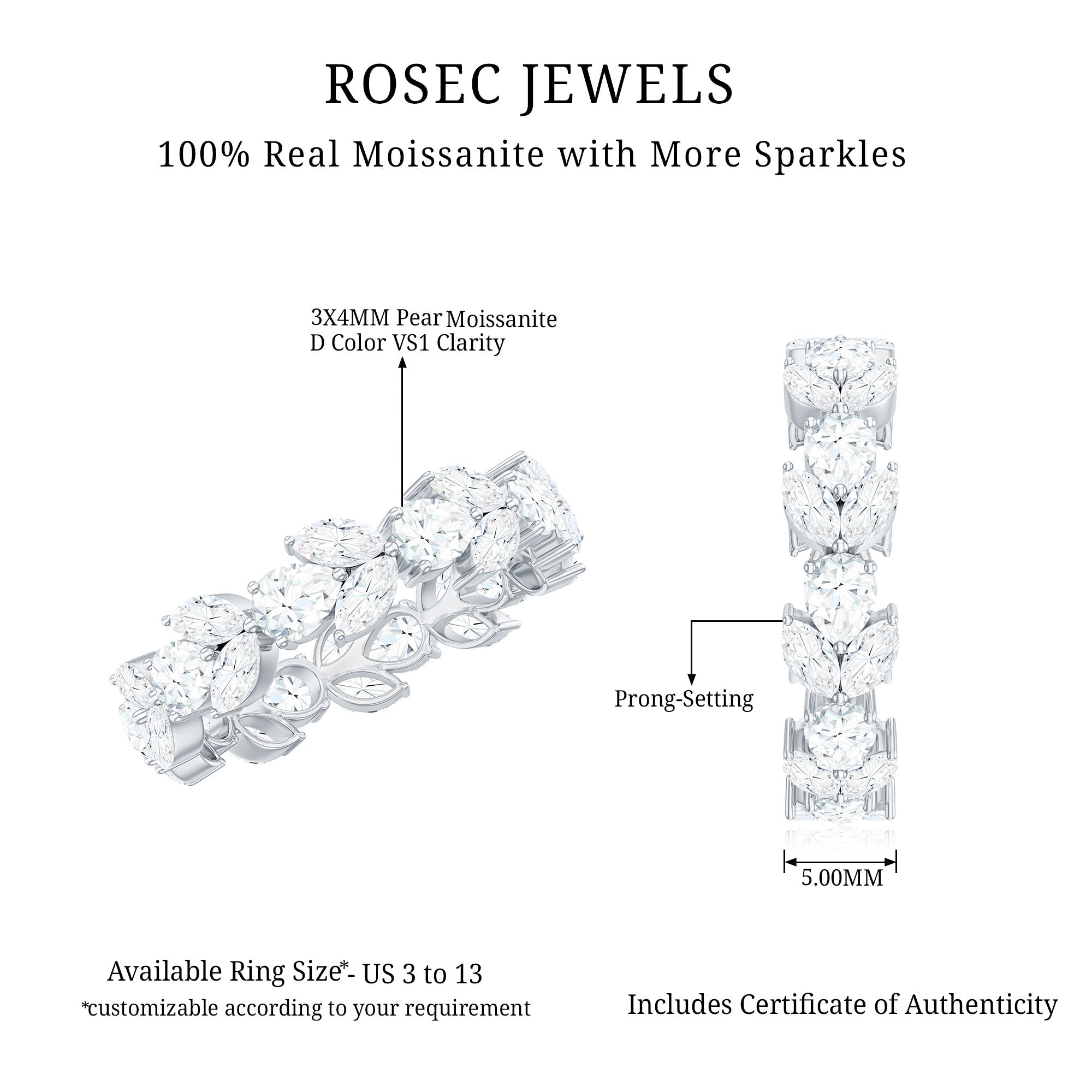 Charm up your look with this elegant Leaf Eternity Ring, a perfect choice for anyone who loves nature inspired jewelry. This Full Eternity Ring features Pear and Marquise Shape Moissanite gemstones set in Prong Setting. A celebration of natures beauty and your eternal bond, capturing moments that will forever be cherished. This Moissanite Eternity Ring is a beautiful option for a wedding, an anniversary, or any memorable occasion you wish to cherish forever. It is understated enough for daily wear, yet distinctive enough to shine on the most significant events. The Wedding Anniversary Ring features D-VS1 quality moissanites, ensuring the stones are clear, radiant, and full of brilliance. Each gemstone in this Leaf Wedding Band undergoes meticulous testing to guarantee its authenticity and adherence to high-quality standards. It brings sparkle to her hand and warmth to her heart. Whether for a wedding day or simply to express gratitude, this ring enhances the beauty of every moment.