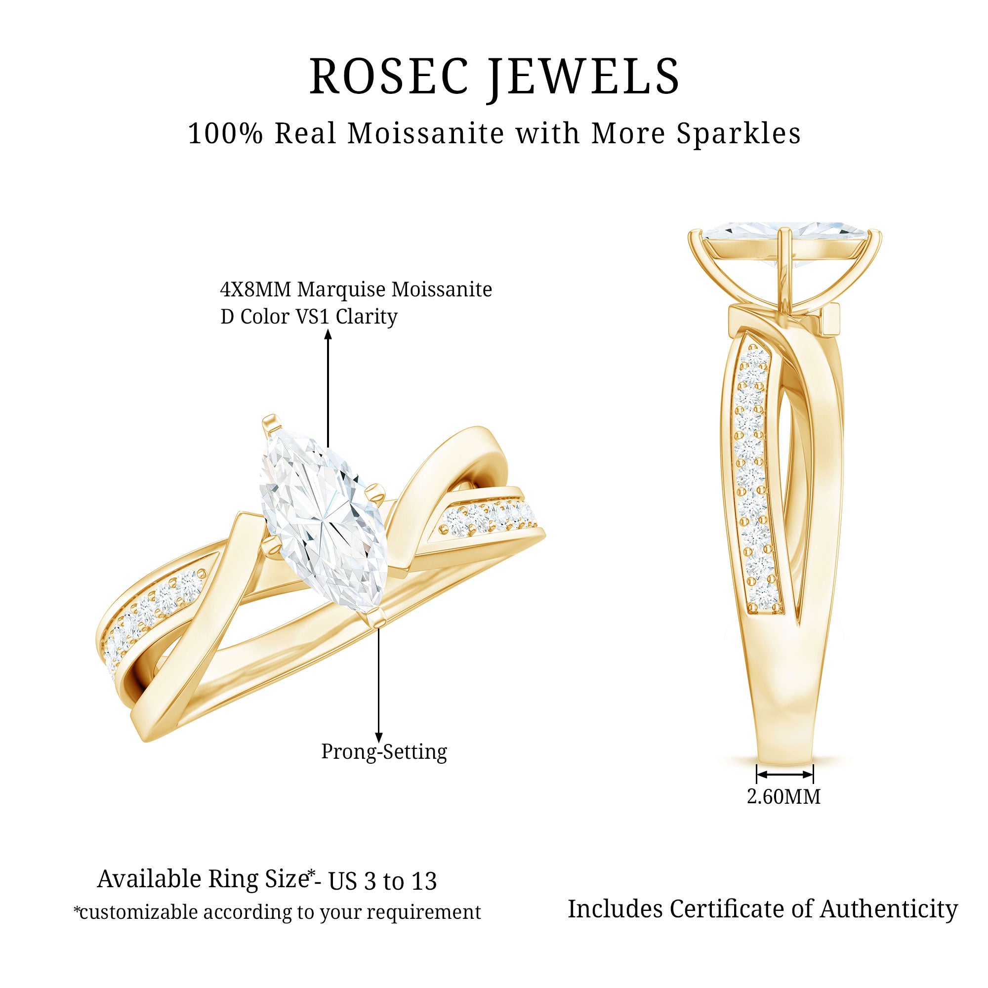This Moissanite Engagement Ring is all you want to make her smile. The ring features 4X8 MM Moissanite securely placed in 4 Prong Setting on the Criss Cross Shank adorned with petite moissanite. This Marquise Moissanite Ring adds a layer of glamour to her look. The ring beholds the adorable shine of D-VS1 Quality Moissanite that makes the celebration memorable forever. Get this Moissanite Solitaire Ring crafted precisely for your big day to be presented to your special one. This ring will be delivered to you in the signature jewelry box for storage.