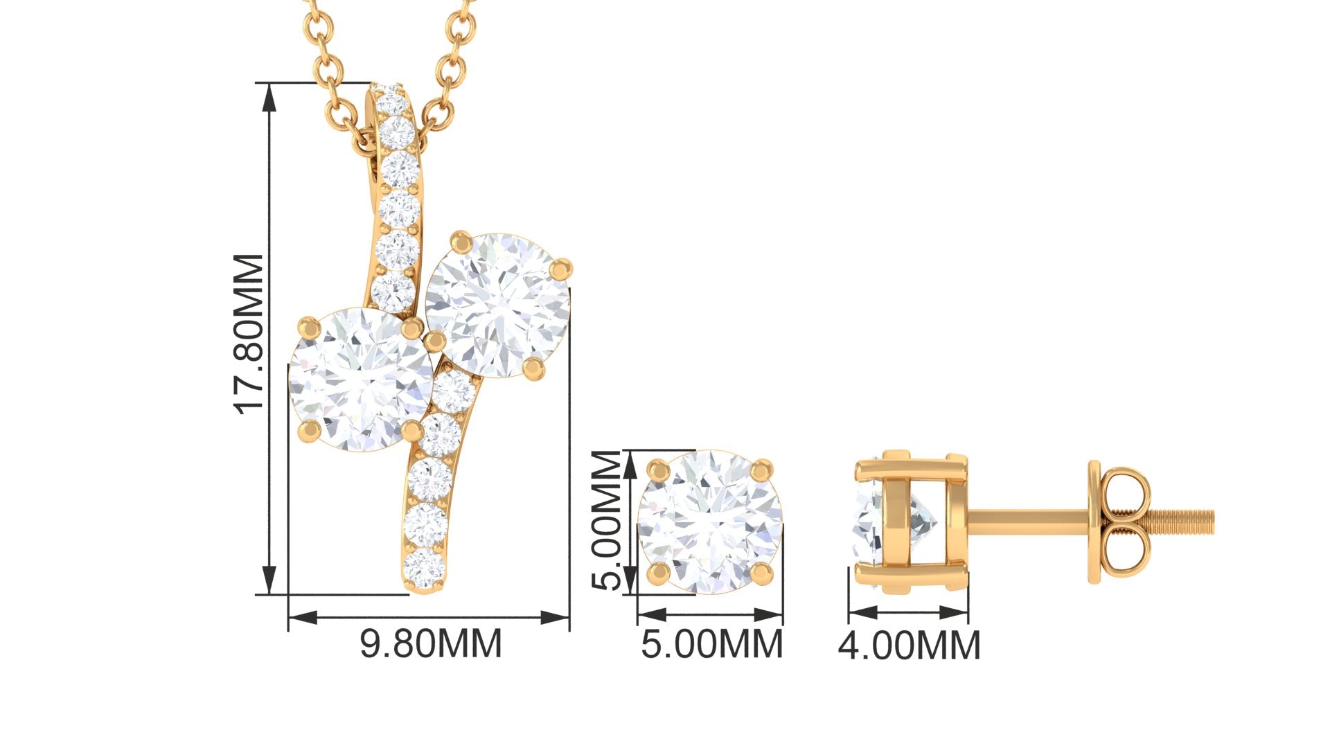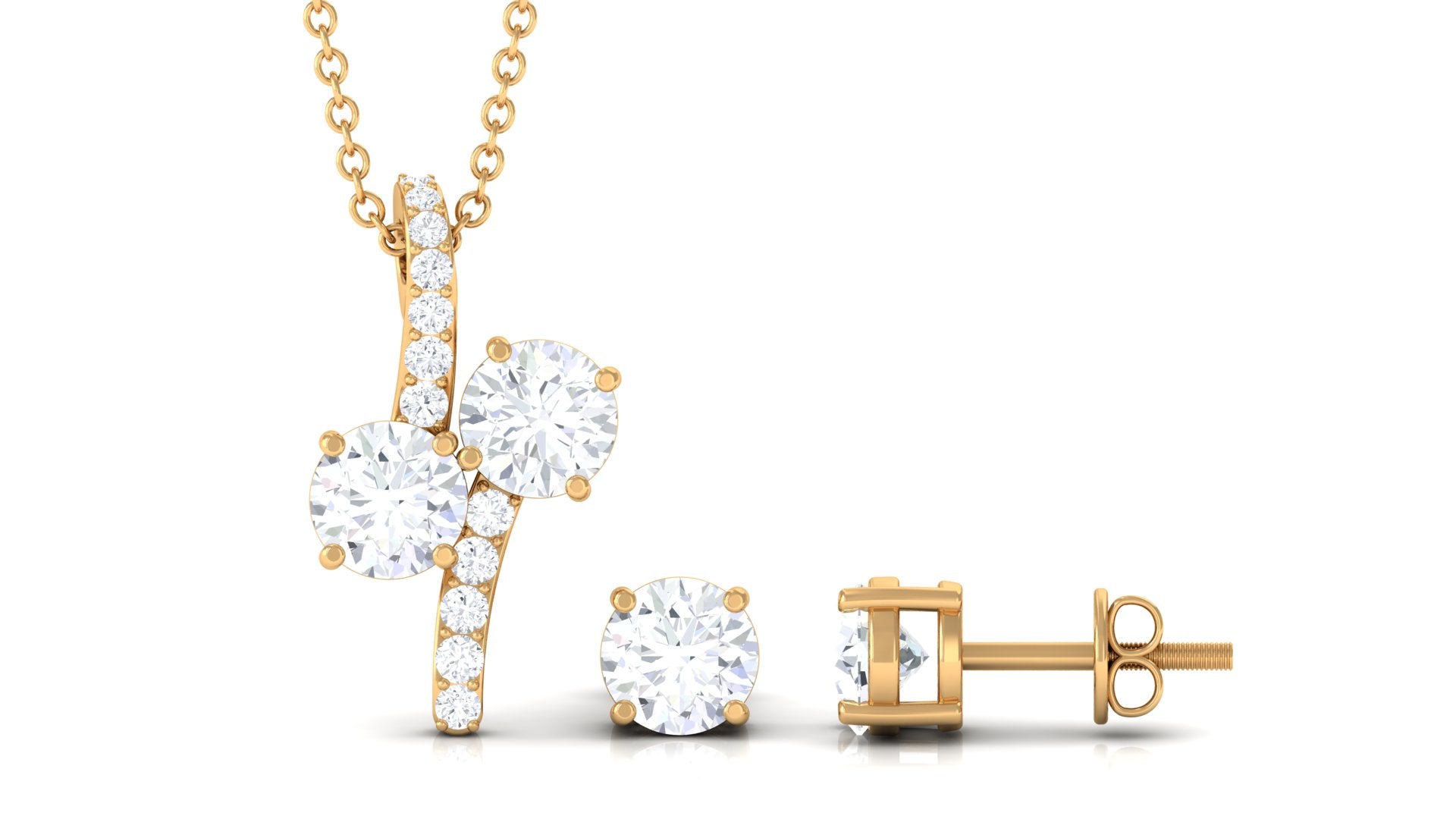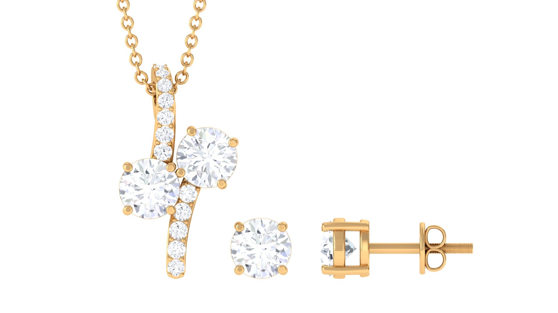 Unique and classy this Moissanite Pendant Necklace and Stud Earrings Set is a special treat for yourself or for your loved ones. The two Round Cut Moissanite in Prong Setting, decorated on the bail gives it a mesmerizing touch to your pendant necklace with a solitaire round Moissanite on earrings in Prong Setting with Screw Back closure keeping it secured for all day long.