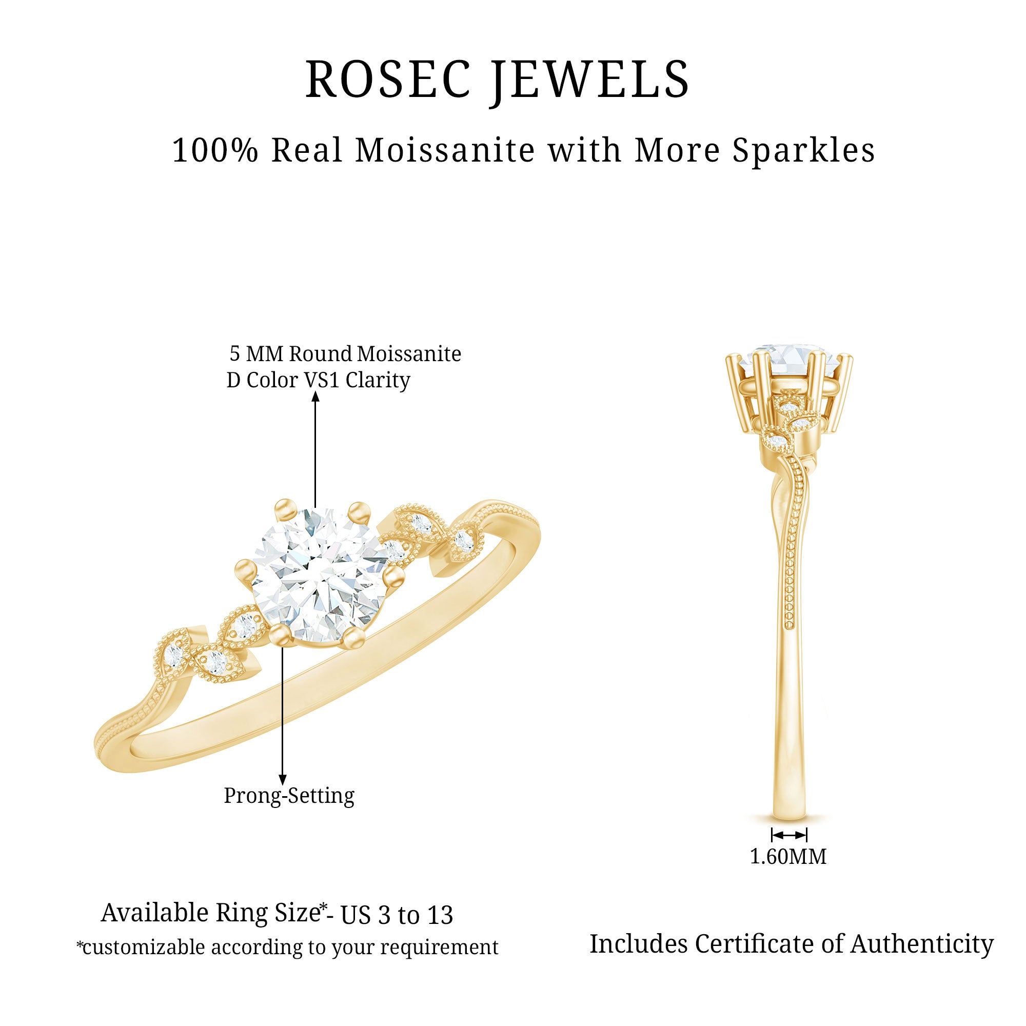 Celebrate your one-of-a-kind love story with this Moissanite Promise Ring, a perfect blend of meaning, beauty, and sparkle. Designed with a delicate beaded leaf motif band, this Nature Inspired Ring gracefully wraps around a dazzling 5 MM round moissanite, held securely in prong setting. With its D color and VS1 clarity, the center stone captures light beautifully, offering brilliance that matches traditional diamonds. This Leaf Ring is not just a pretty piece, it is a symbol of your journey, your bond, and the quiet moments that make your connection so special. Whether you are marking a milestone or sharing a heartfelt promise, this Half Carat Moissanite Ring brings your feelings to life in the most elegant way. Crafted with attention to detail and care, the soft leaf design adds an almost fairytale charm. It is ideal for nature lovers or anyone who wants something just a little different. Presented in a beautifully designed jewelry box, this Moissanite Solitaire Ring is ready to gift or to cherish for yourself. With size options from US 3 to 13, it offers the perfect fit for every hand and heart. Whether worn as a pinky promise ring, a commitment ring, or a meaningful gesture of love, this Moissanite Ring is a reminder of trust, growth, and a future you are building together.