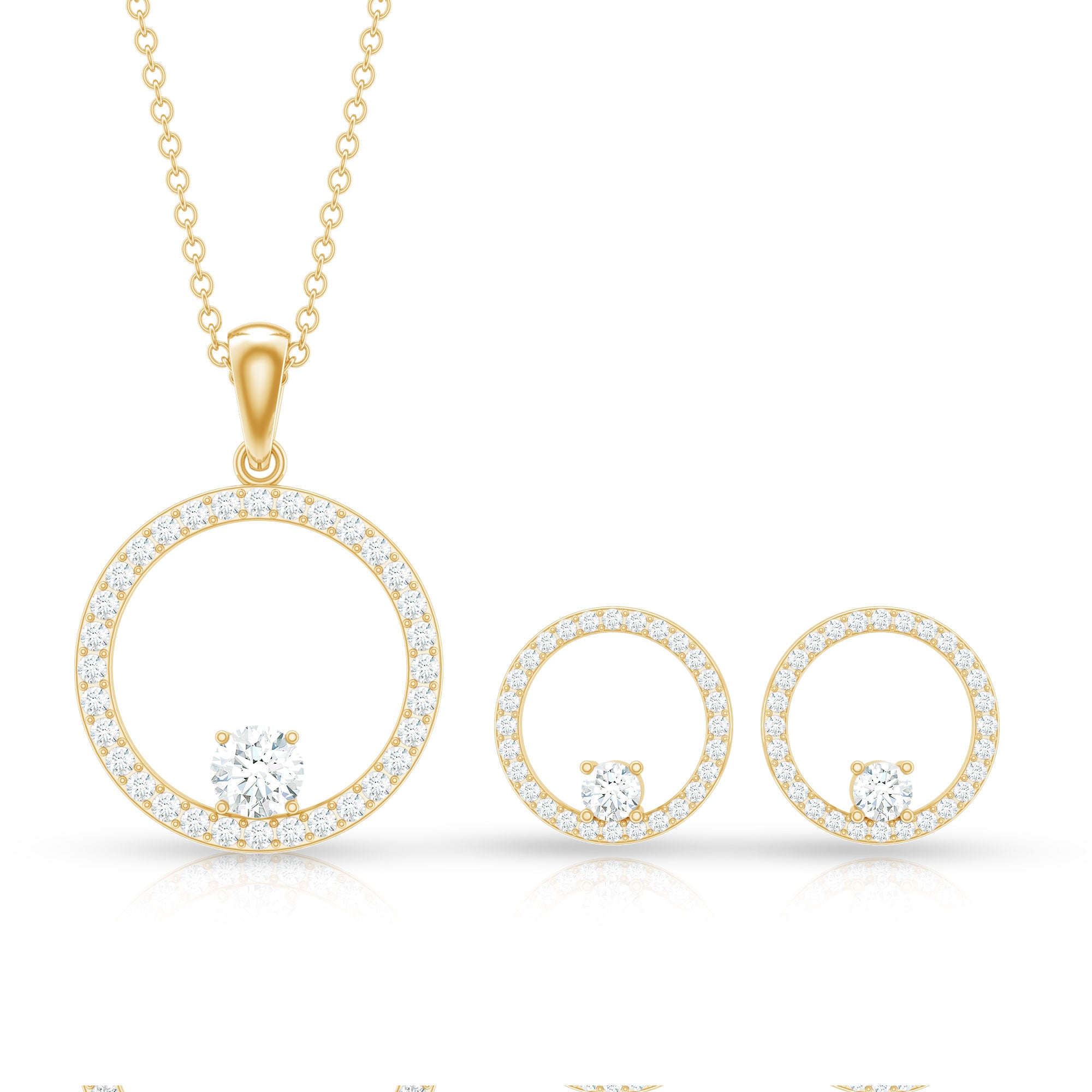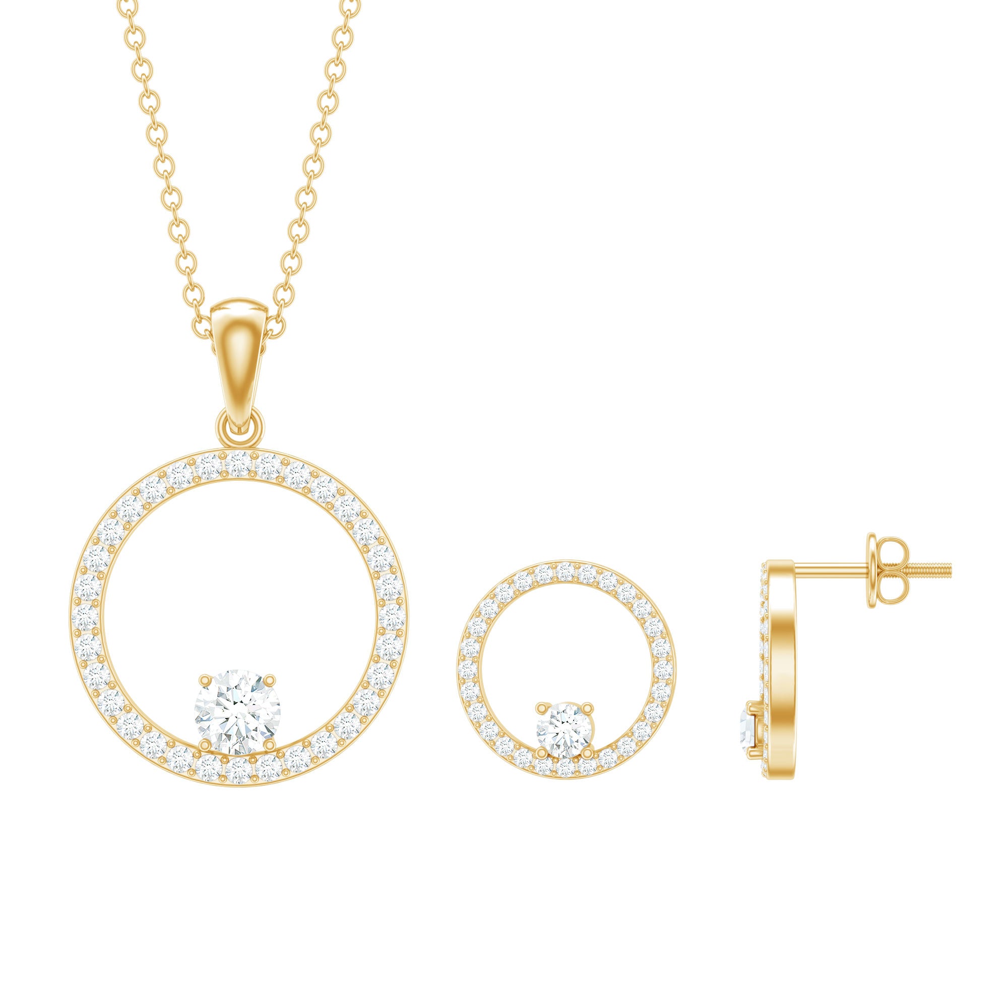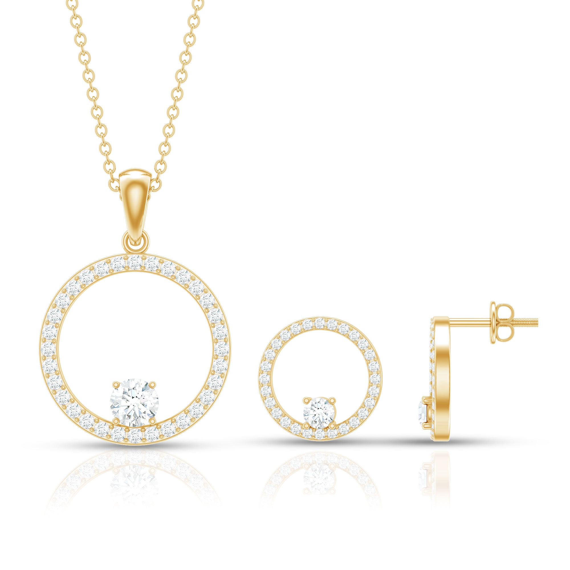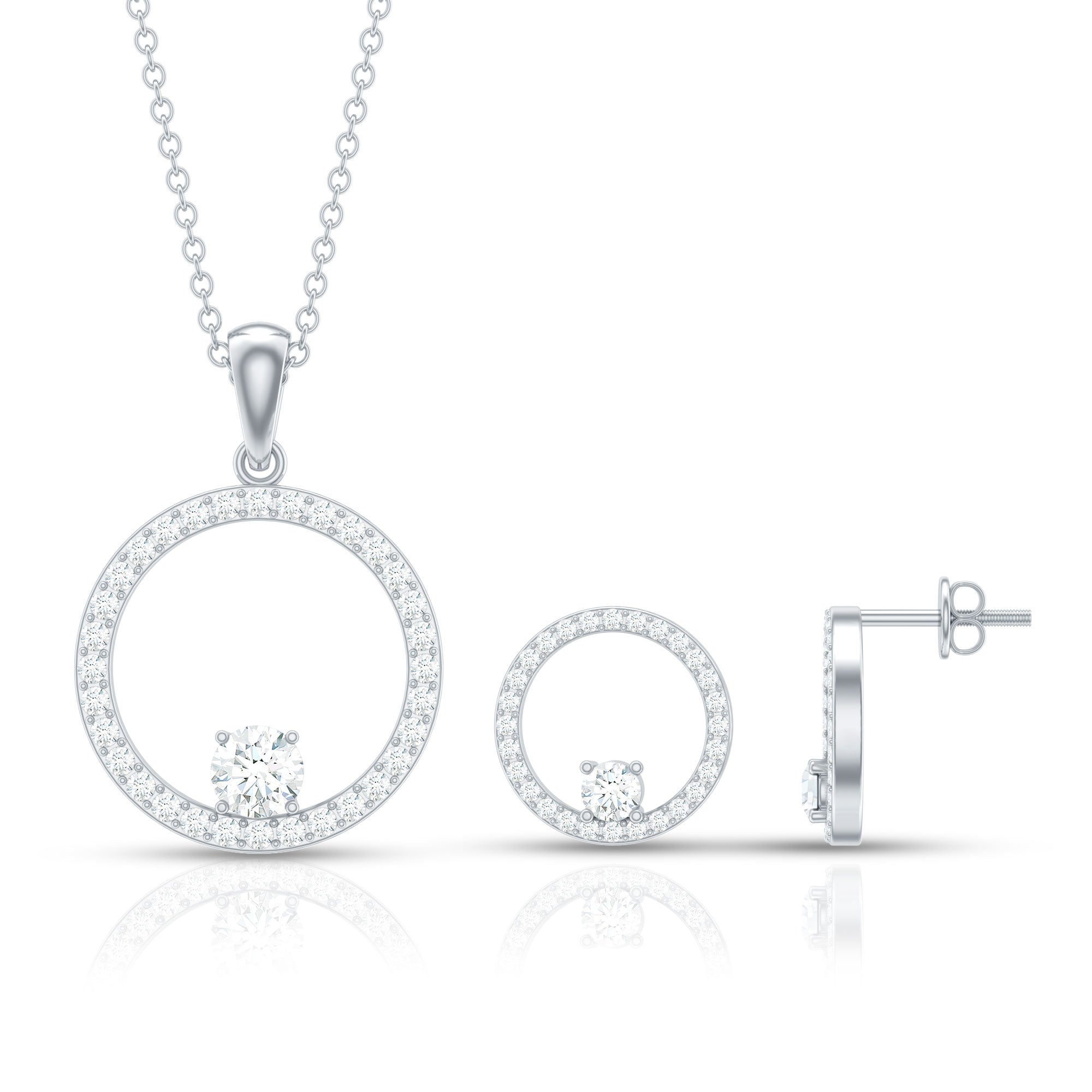 This Moissanite Pendant and Earrings Set is a perfect jewelry to adore for your special day. Simple and elegant this Moissanite Eternity Jewelry Set is a perfect jewelry that will sure to match your outfit. The Round Cut Moissanite sits elegantly in the center in Prong Setting with an eternity pattern thus making it a true statement jewelry for you or your better half. The matching pendant and earrings set always lets you stand out from the crowd.